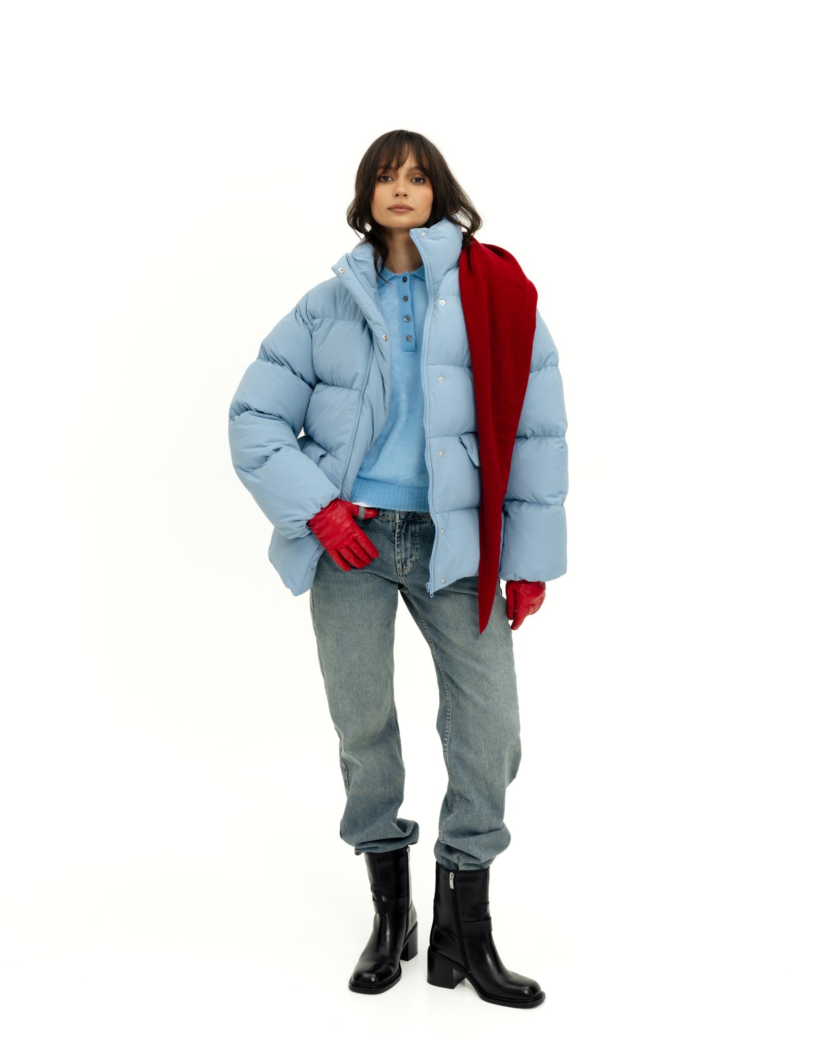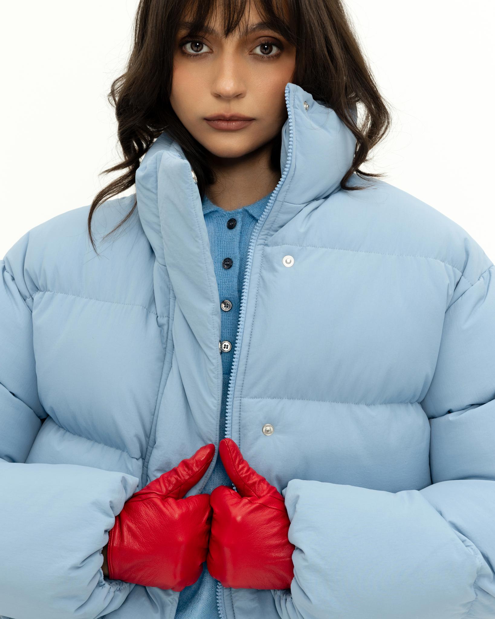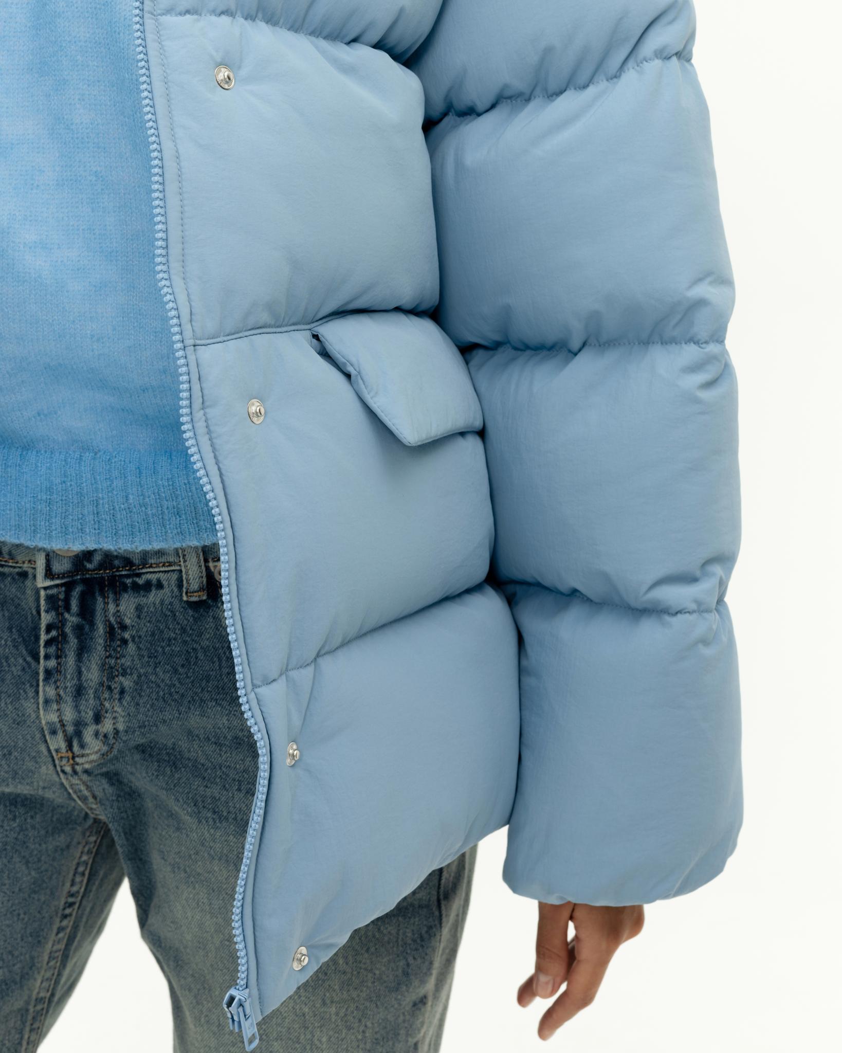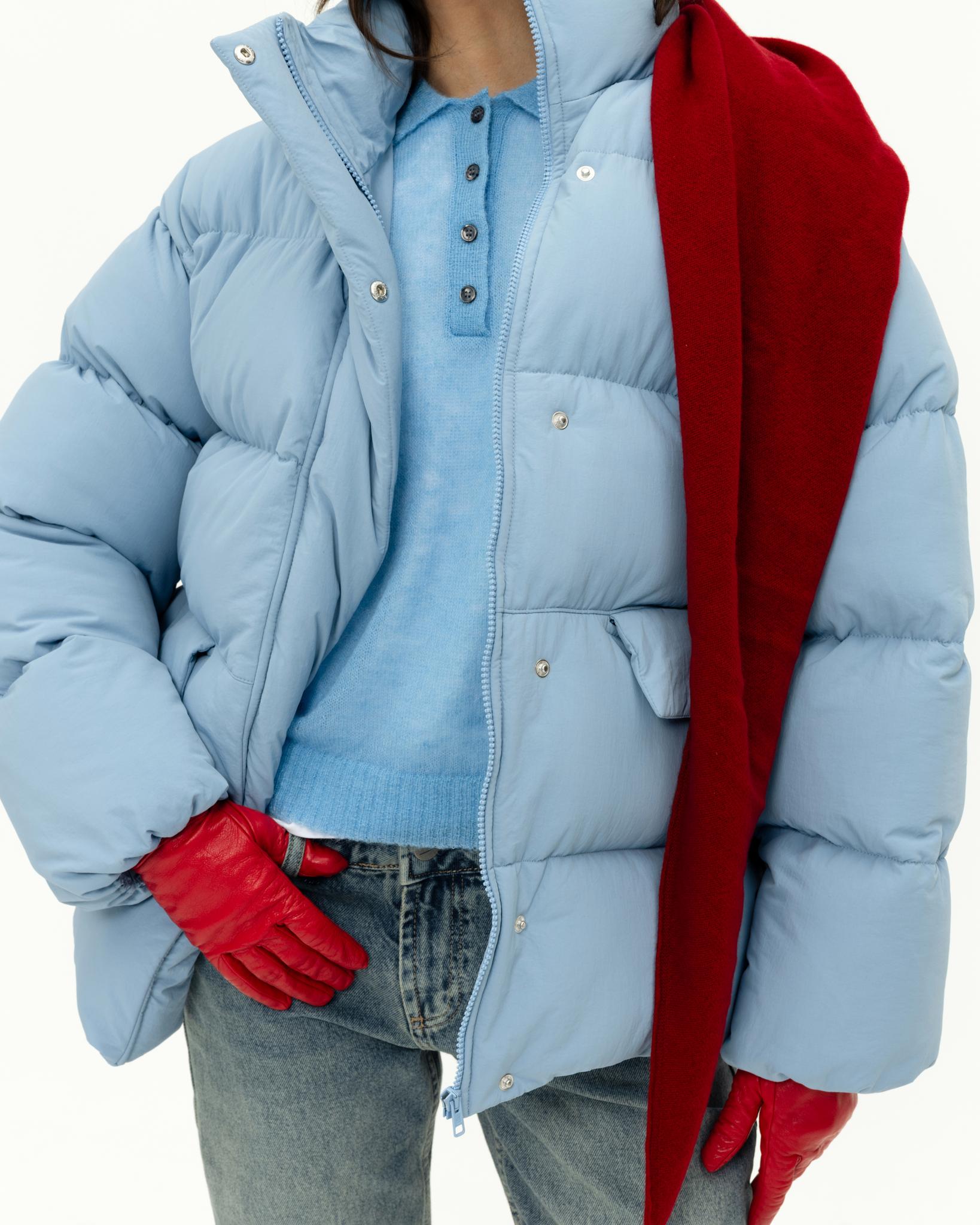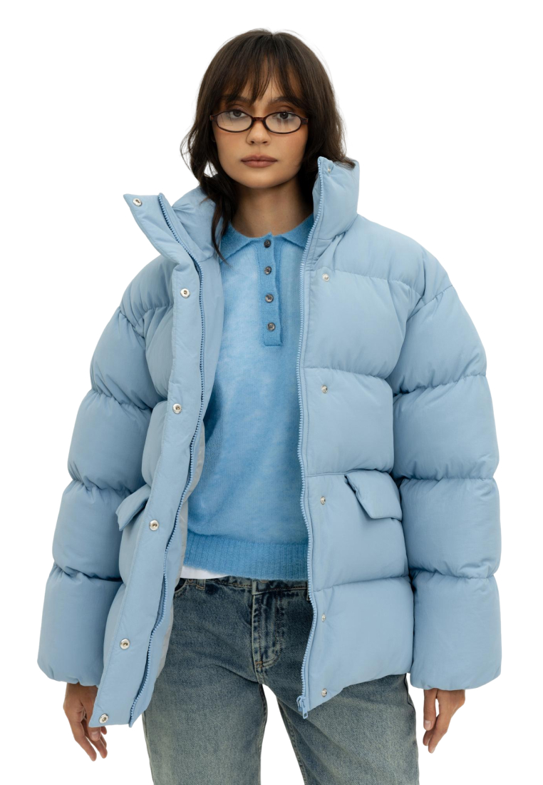 У пуховика невесомый, но в то же время тёплый утеплитель (комбо синтетического лебяжьего пуха и shelter).