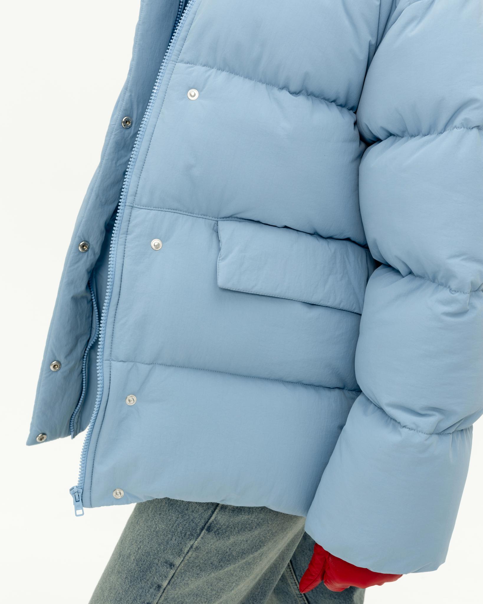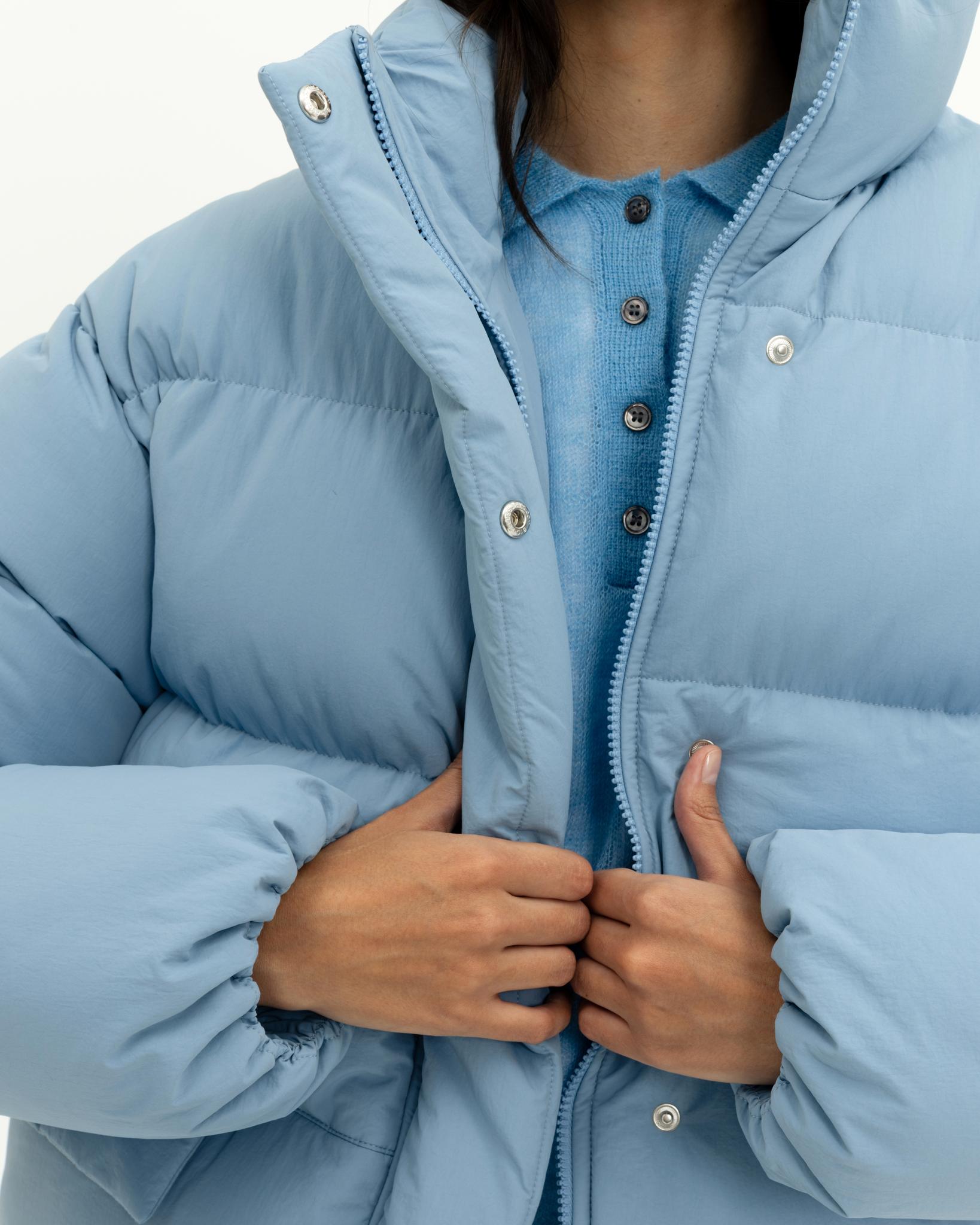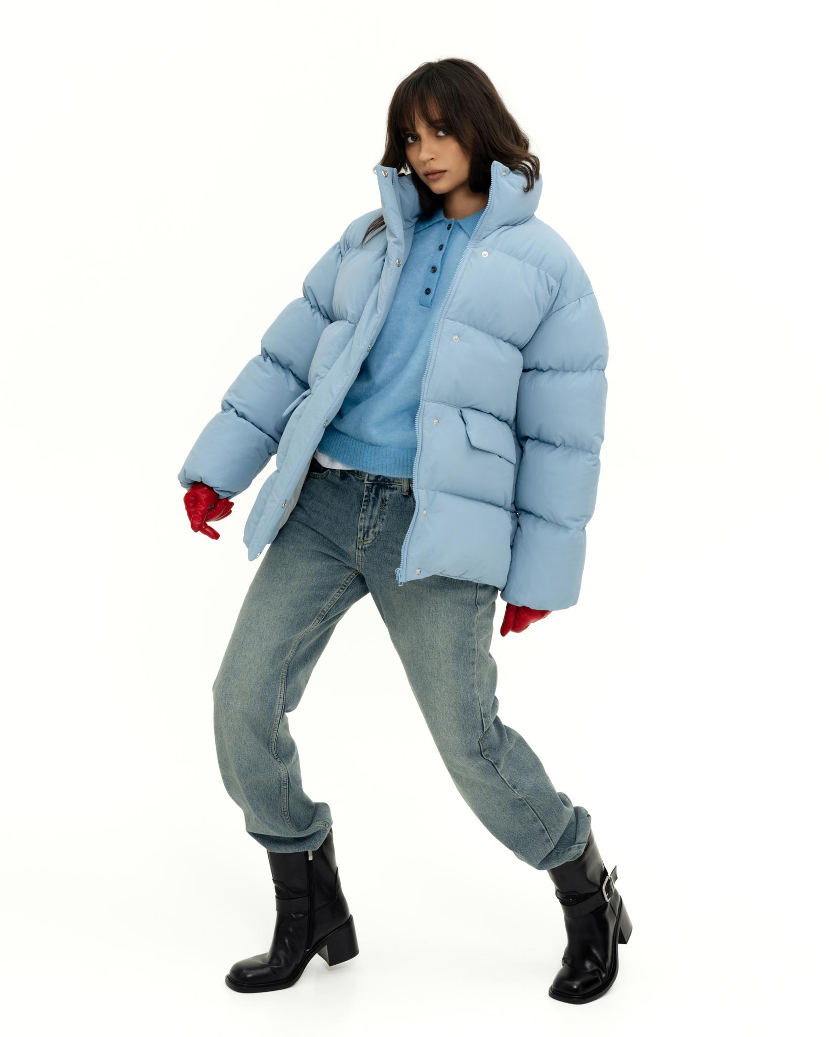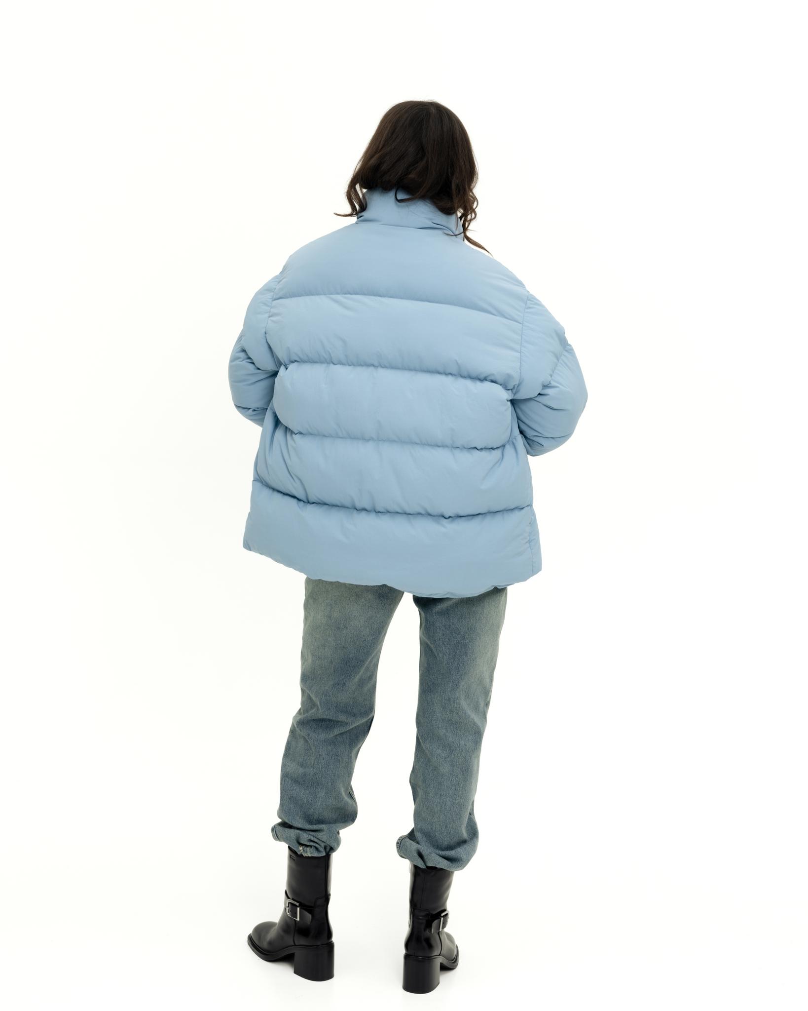У пуховика невесомый, но в то же время тёплый утеплитель (комбо синтетического лебяжьего пуха и shelter).