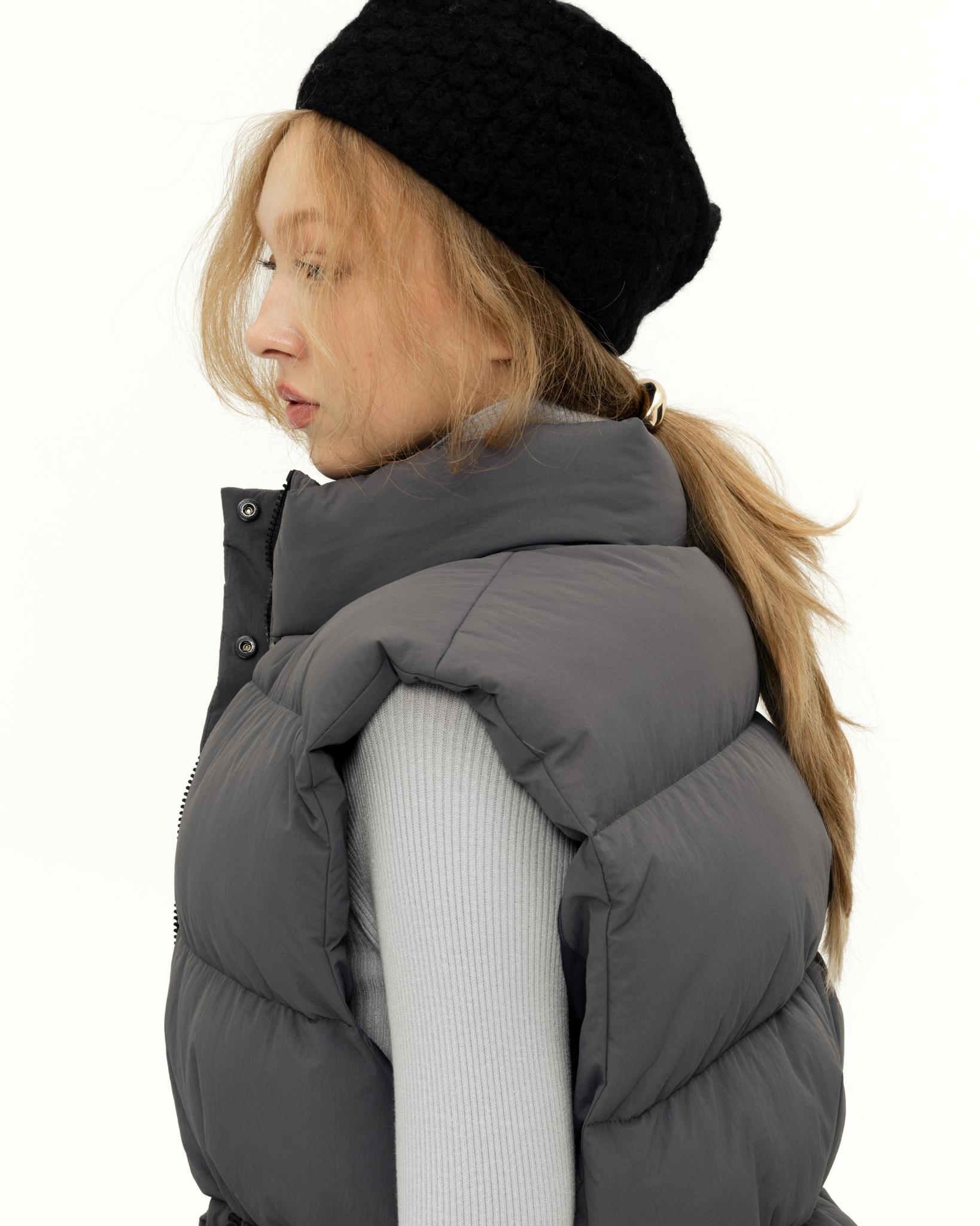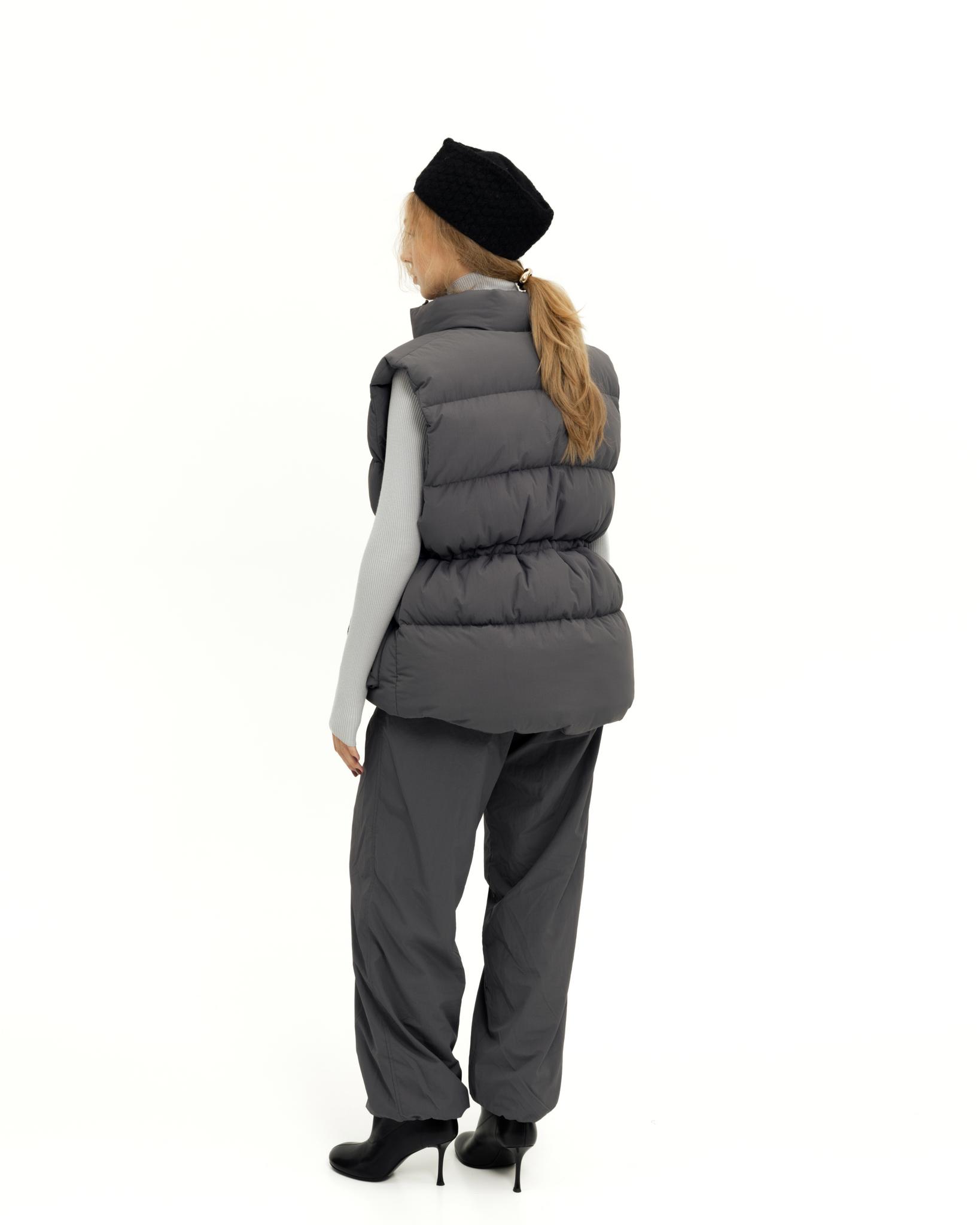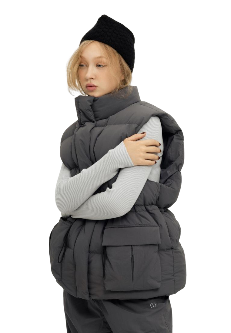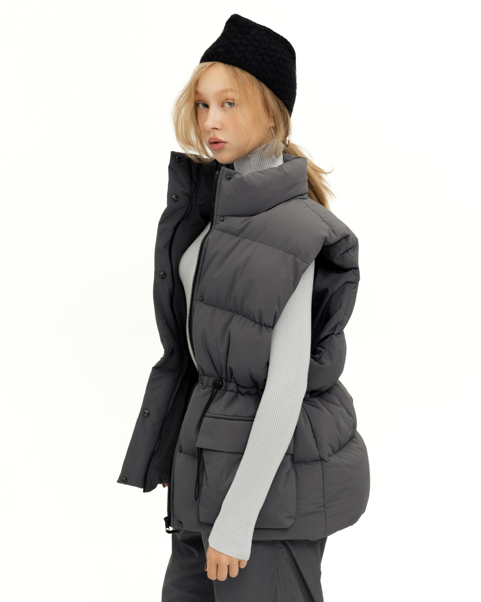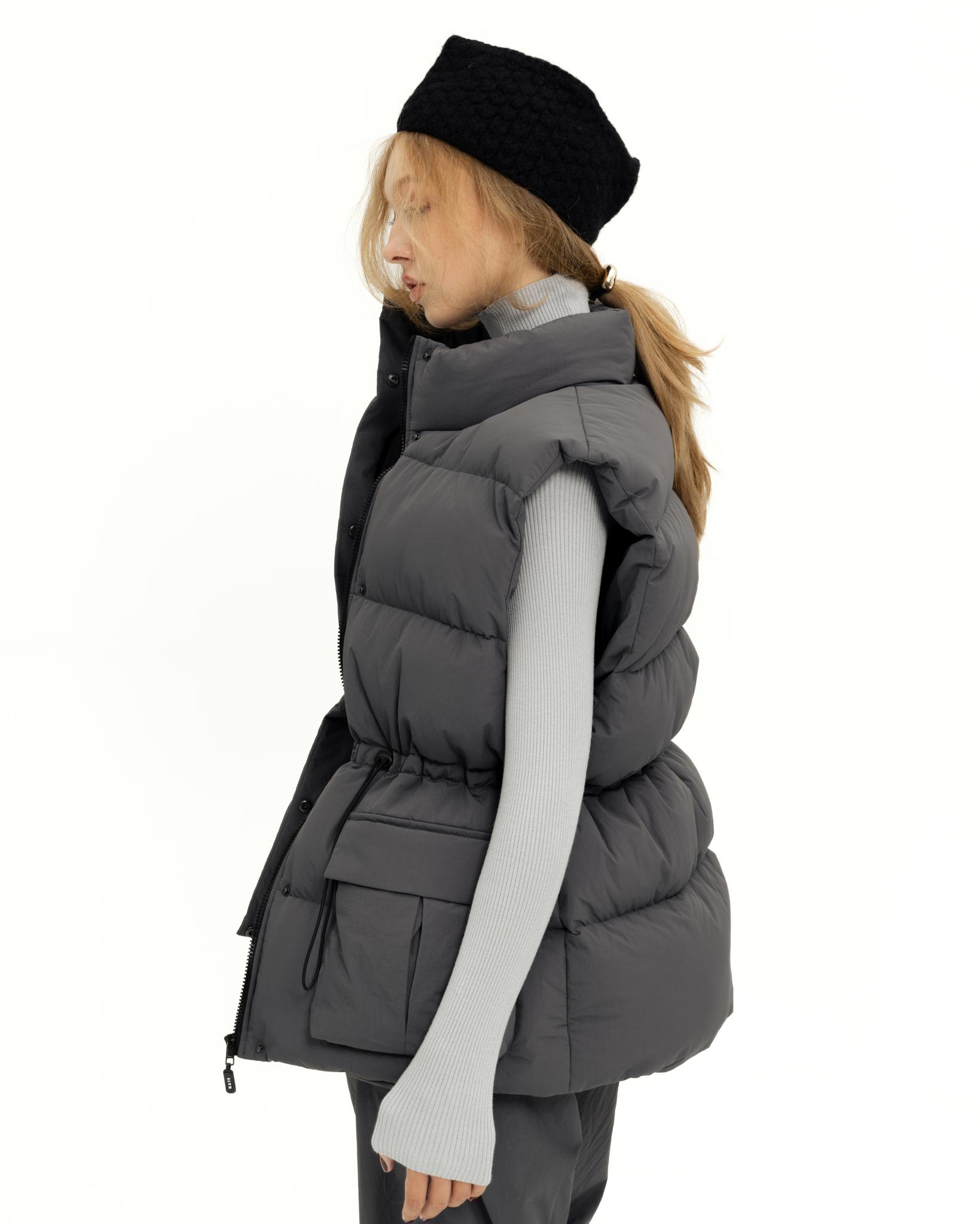 Невесомый и теплый жилет с воротом стойкой и удлиненной спинкой защитит вас от холодного ветра, а глубокая пройма позволит надеть под жилет обьемный свитер или худи.