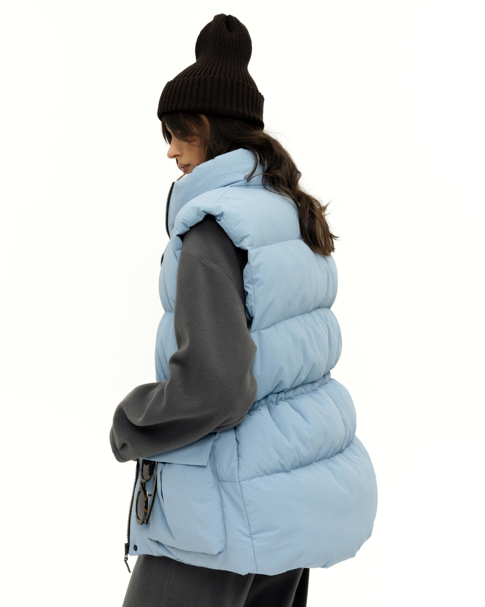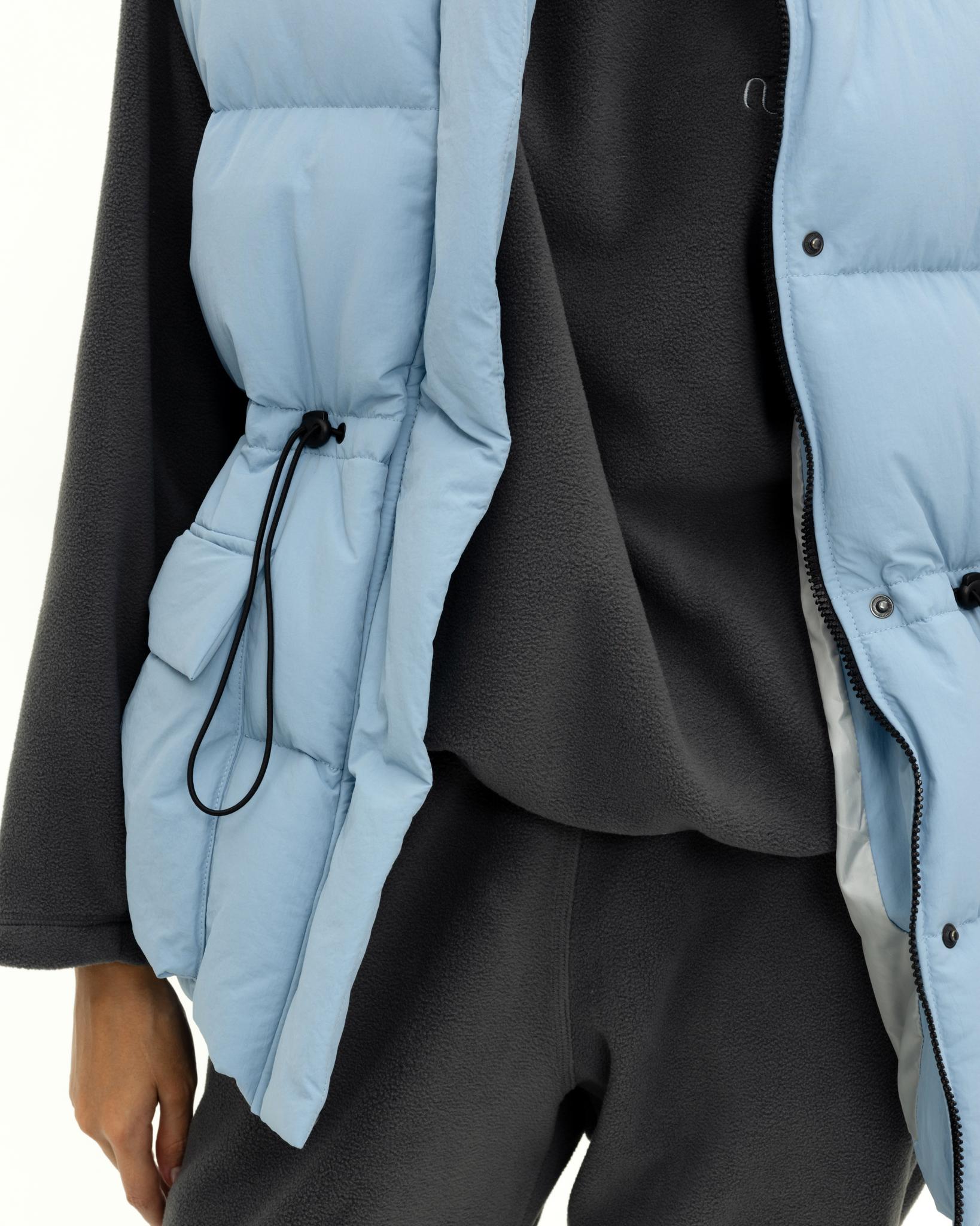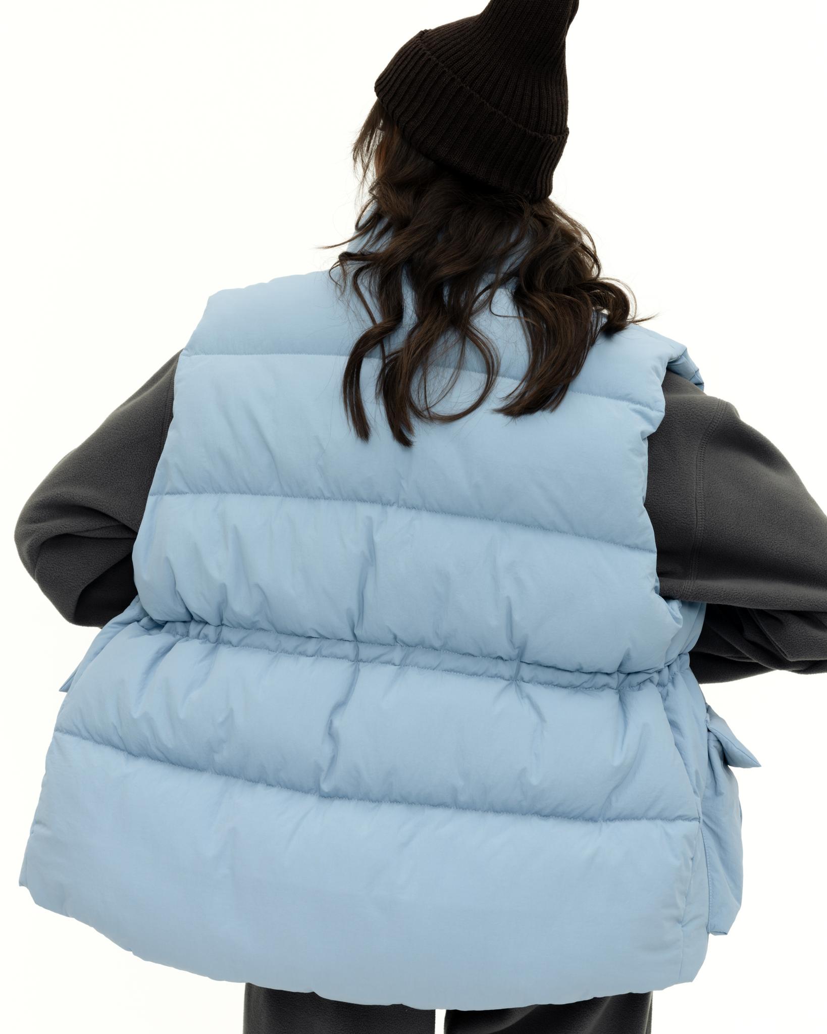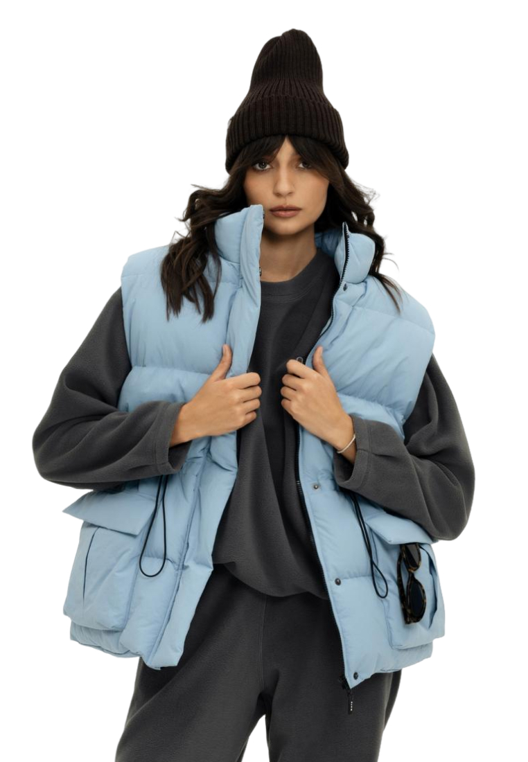 Невесомый и теплый жилет с воротом стойкой и удлиненной спинкой защитит вас от холодного ветра, а глубокая пройма позволит надеть под жилет обьемный свитер или худи.
