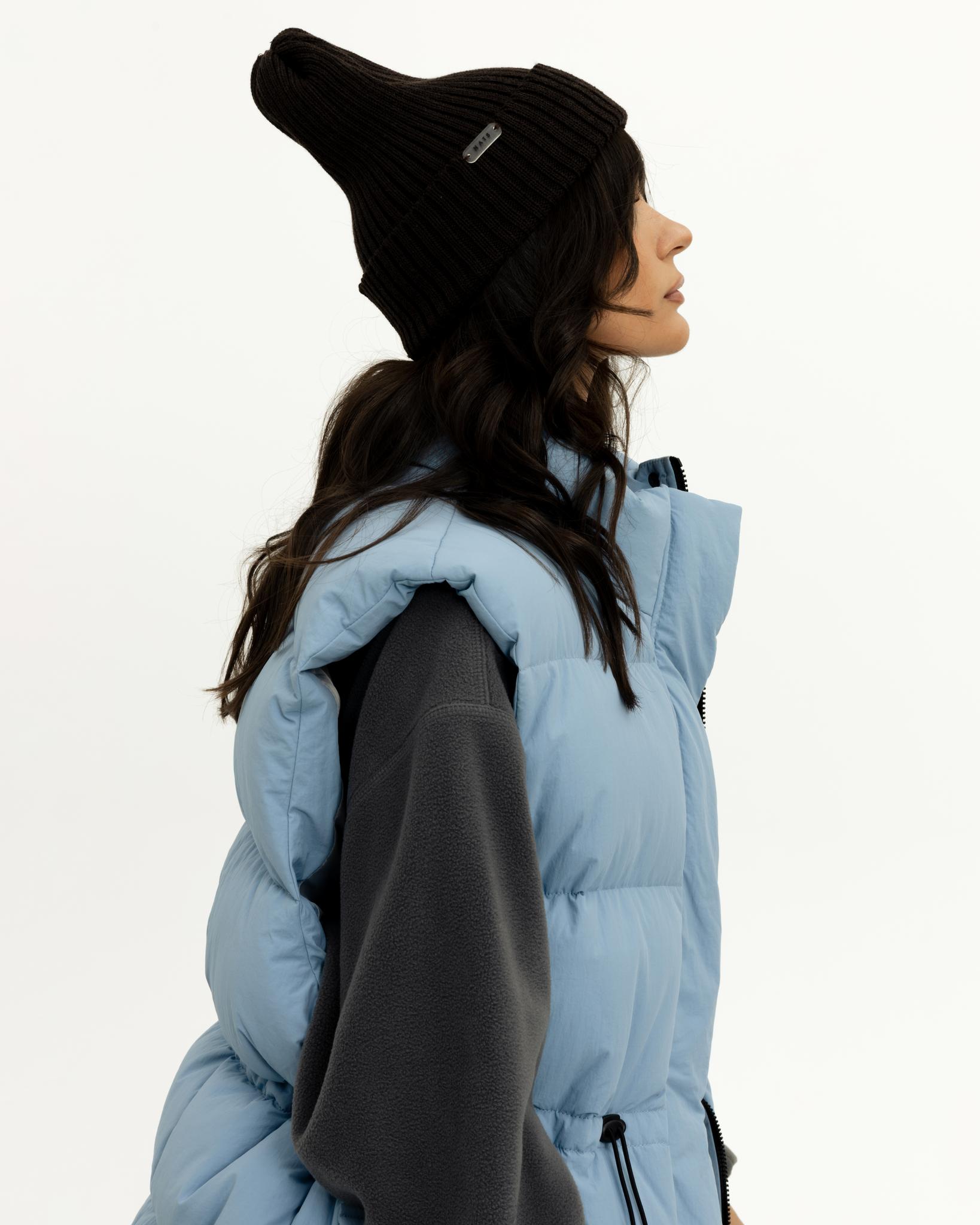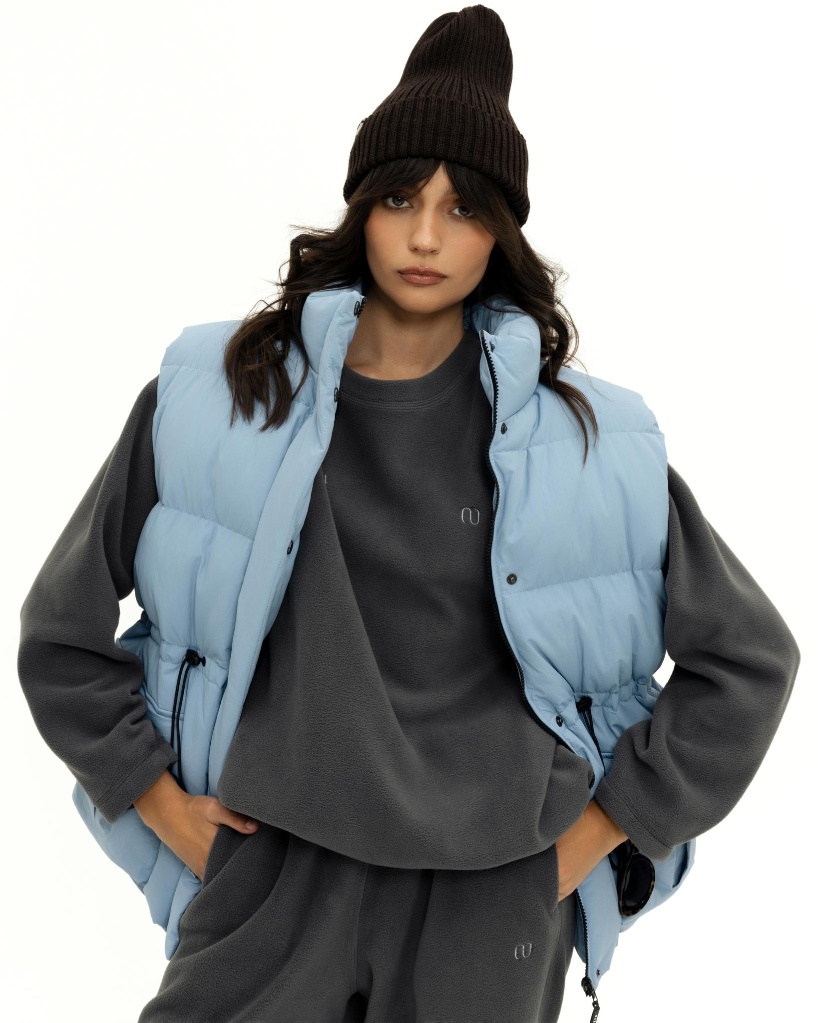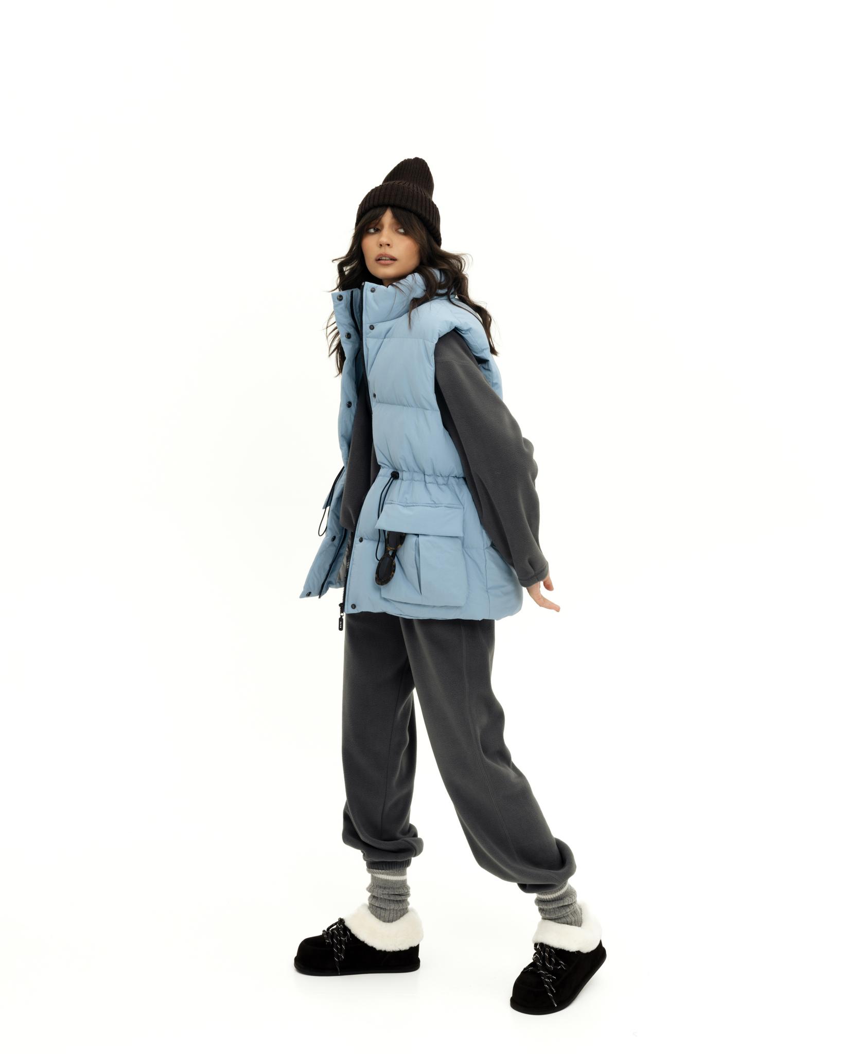 Невесомый и теплый жилет с воротом стойкой и удлиненной спинкой защитит вас от холодного ветра, а глубокая пройма позволит надеть под жилет обьемный свитер или худи.