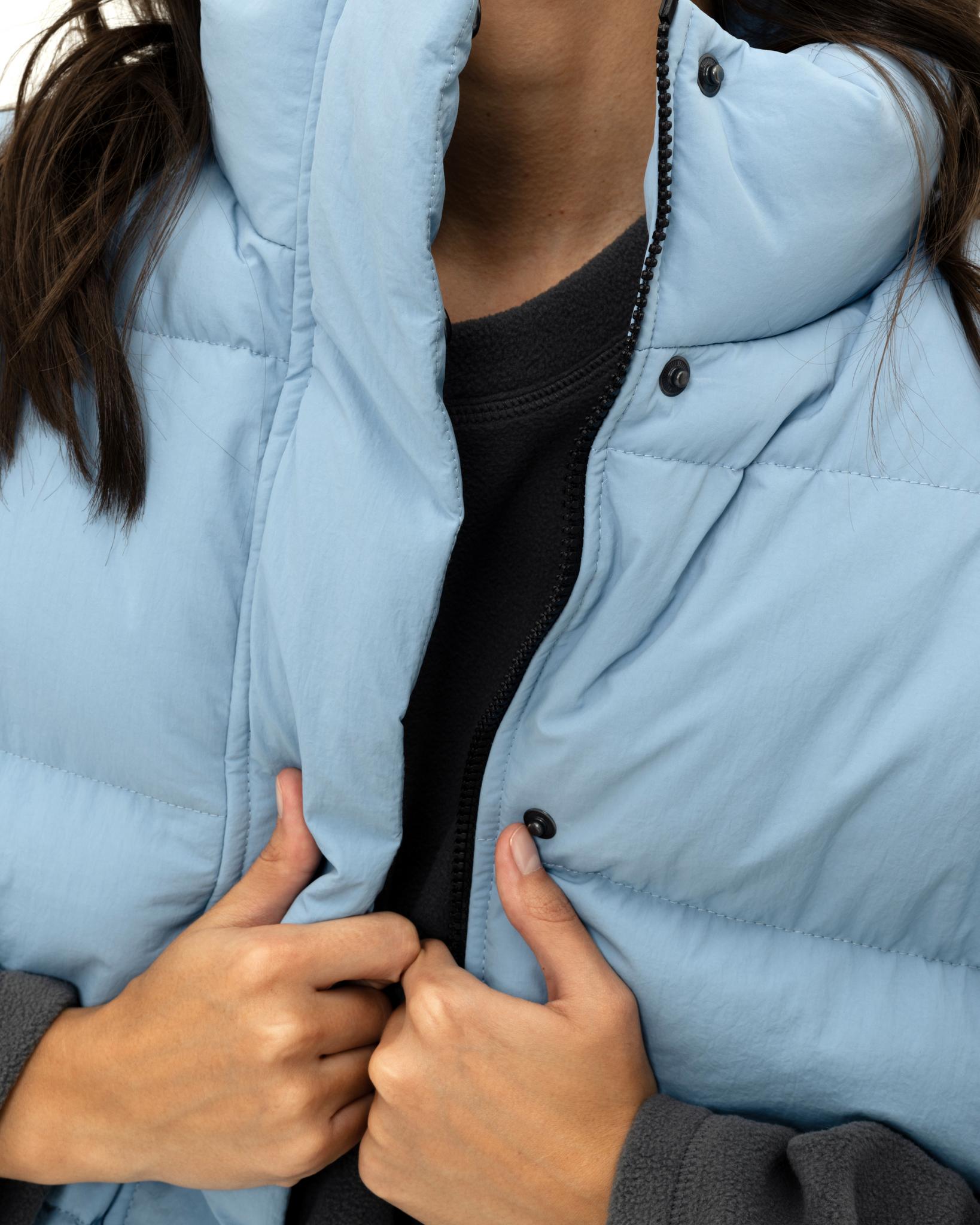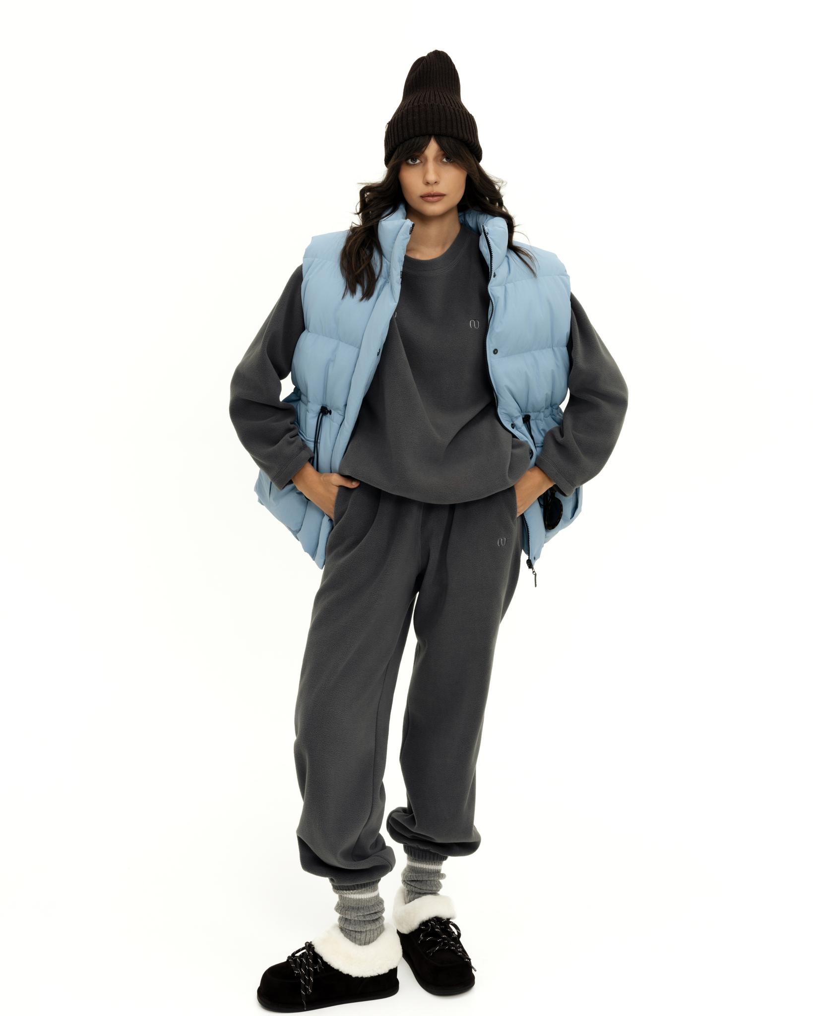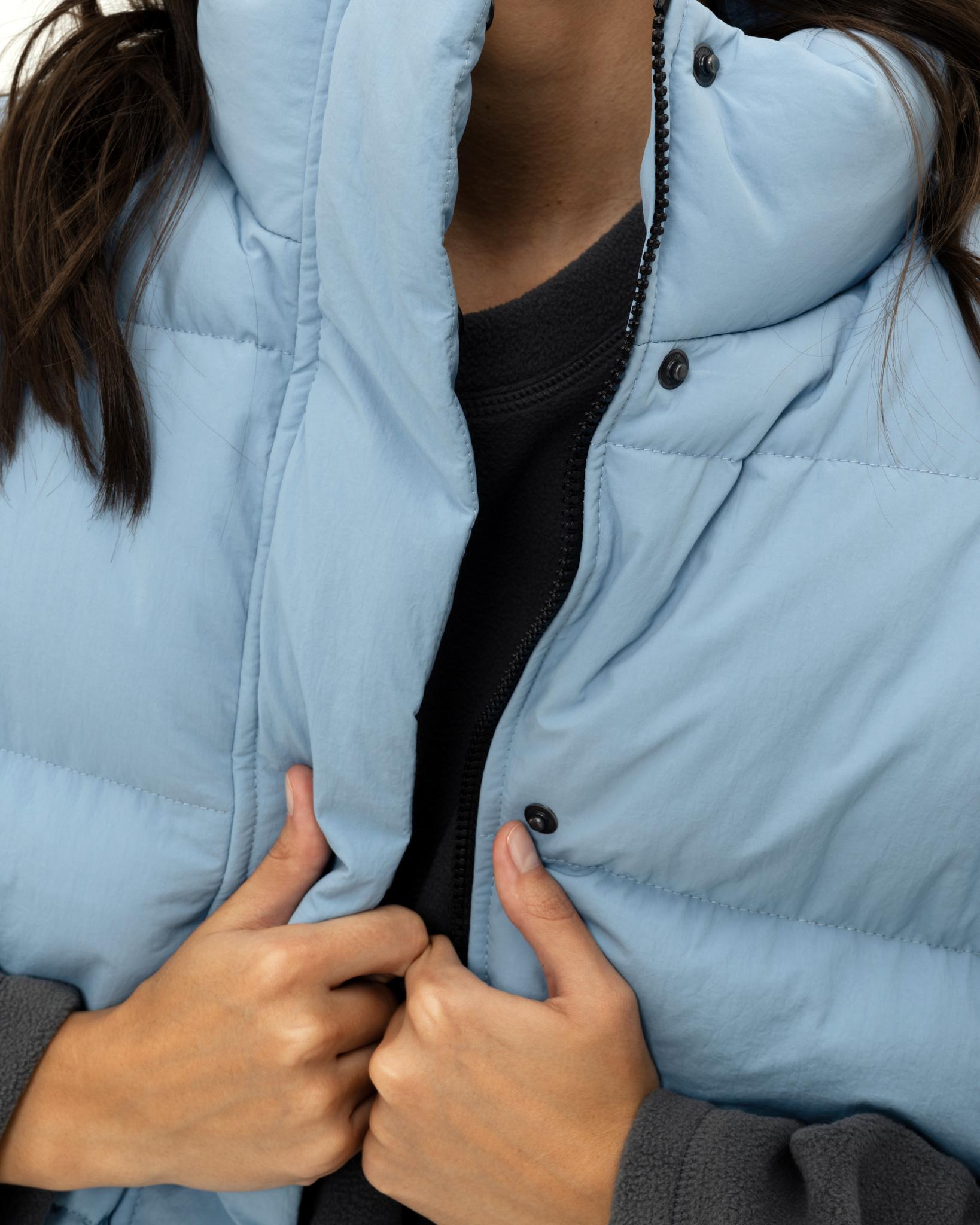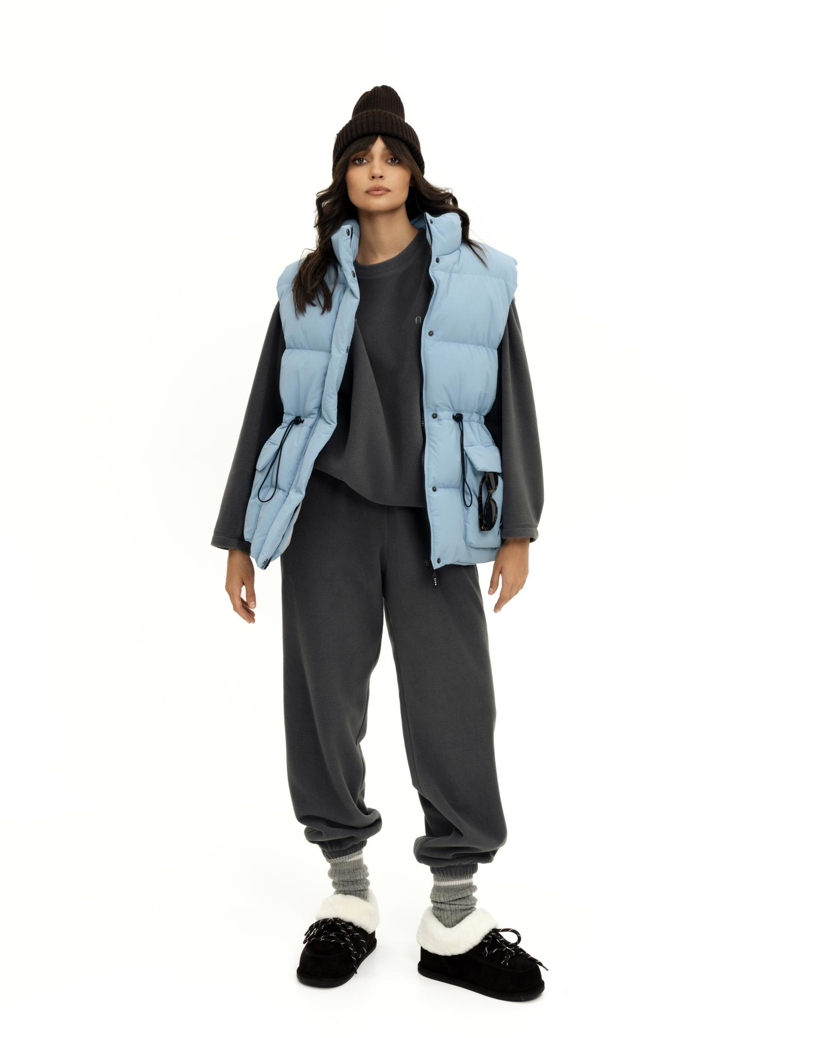 Невесомый и теплый жилет с воротом стойкой и удлиненной спинкой защитит вас от холодного ветра, а глубокая пройма позволит надеть под жилет обьемный свитер или худи.