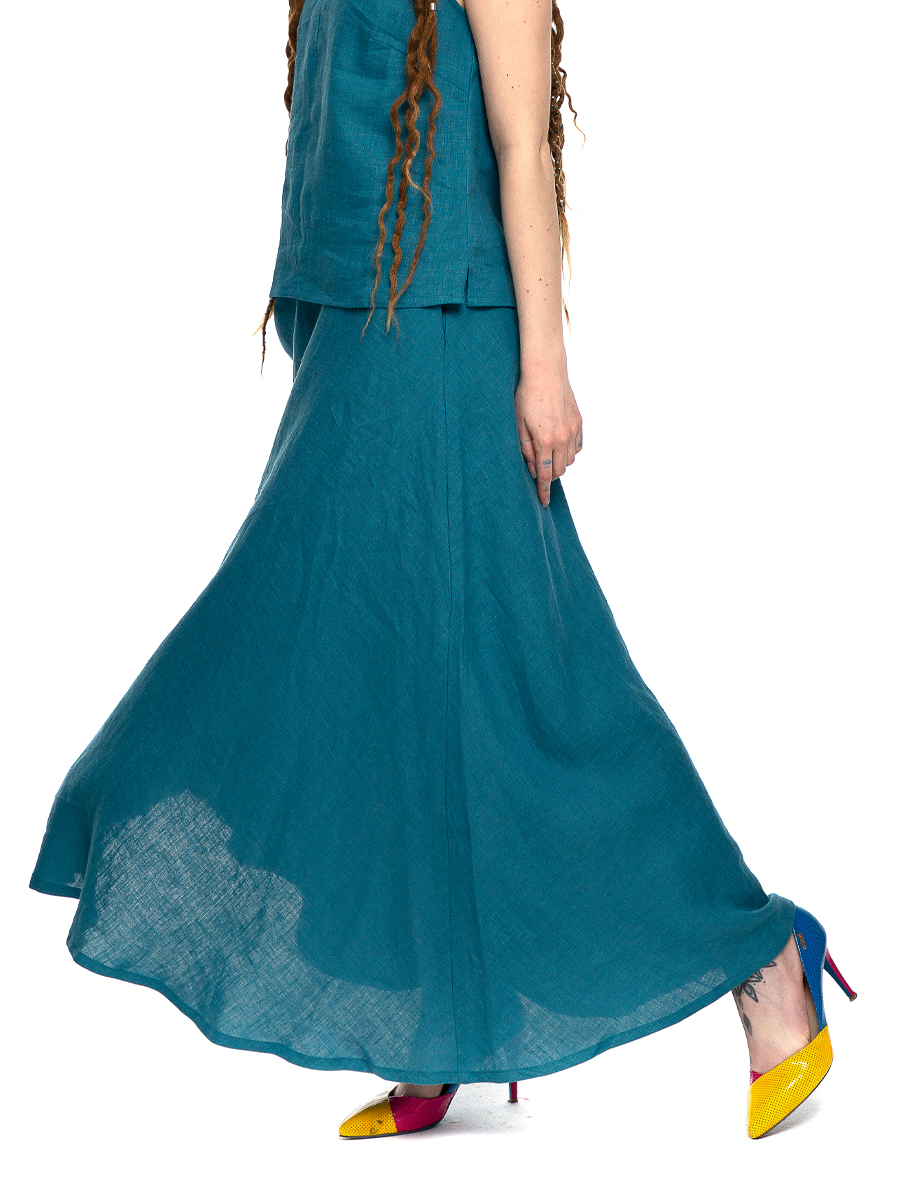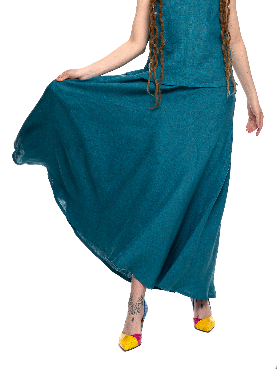 Длинная юбка покроя полусолнце из 4 клиньев, с карманами в швах, на поясе с резинкой на спинке, с застежкой гульфика на молнию.