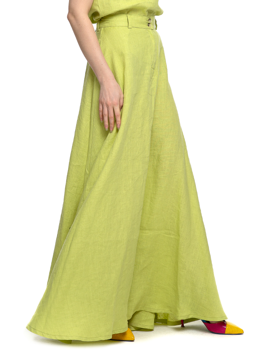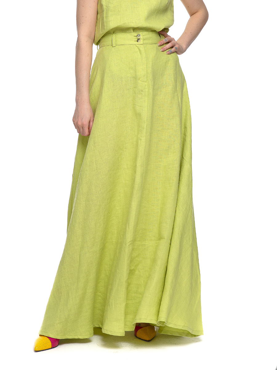Длинная юбка покроя полусолнце из 4 клиньев, с карманами в швах, на поясе с резинкой на спинке, с застежкой гульфика на молнию.