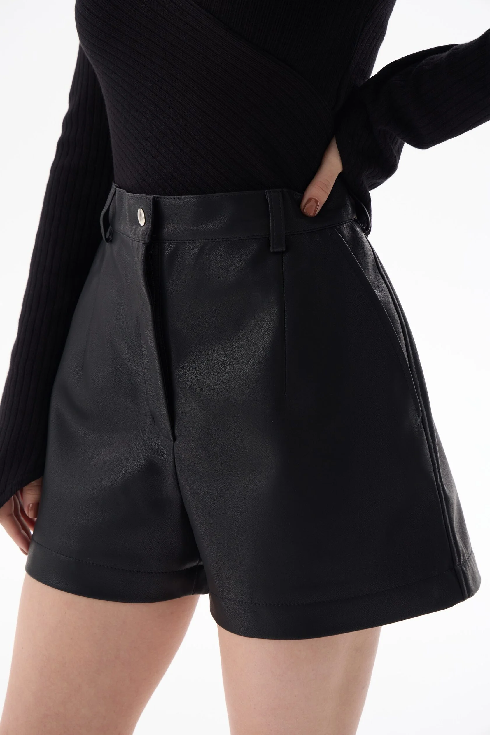 Шорты мини с правильной длиной на завышенной талии без лишних деталей мы создали для того, чтобы они дополнили ваш базовый гардероб, так как они очень универсальны, но благодаря фактуре экокожи смотрятся необычно и стильно.
