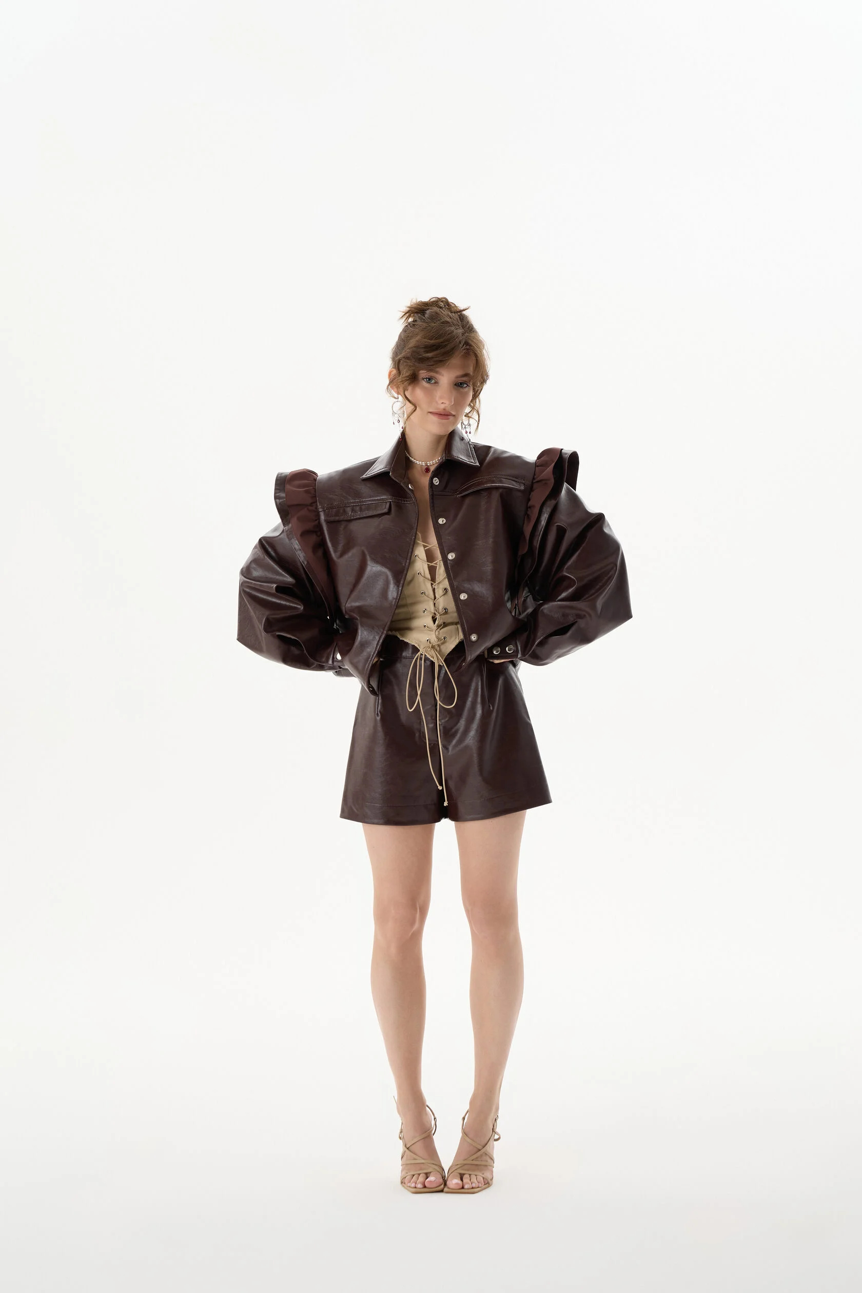 Шорты мини с правильной длиной на завышенной талии без лишних деталей мы создали для того, чтобы они дополнили ваш базовый гардероб, так как они очень универсальны, но благодаря фактуре экокожи смотрятся необычно и стильно.