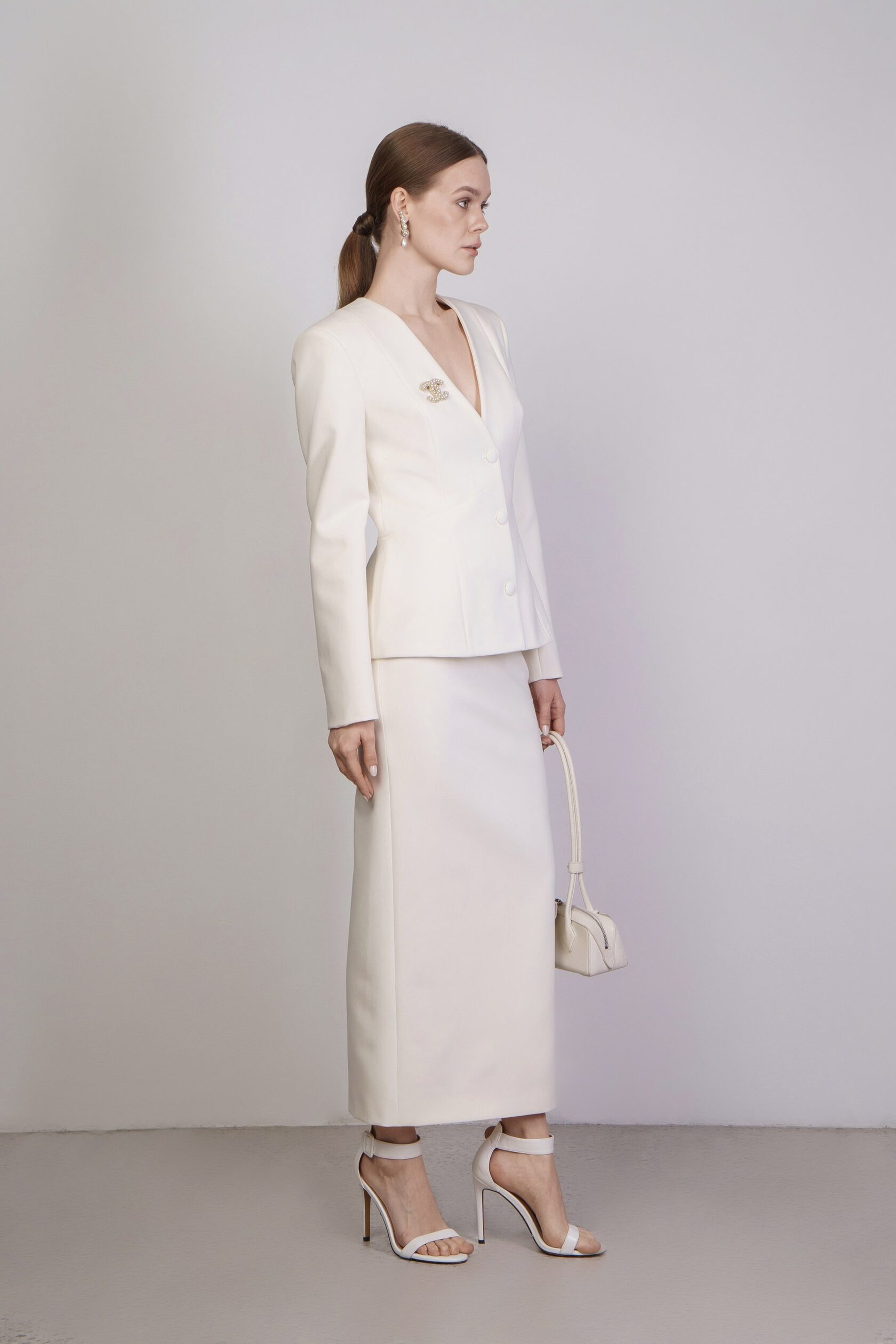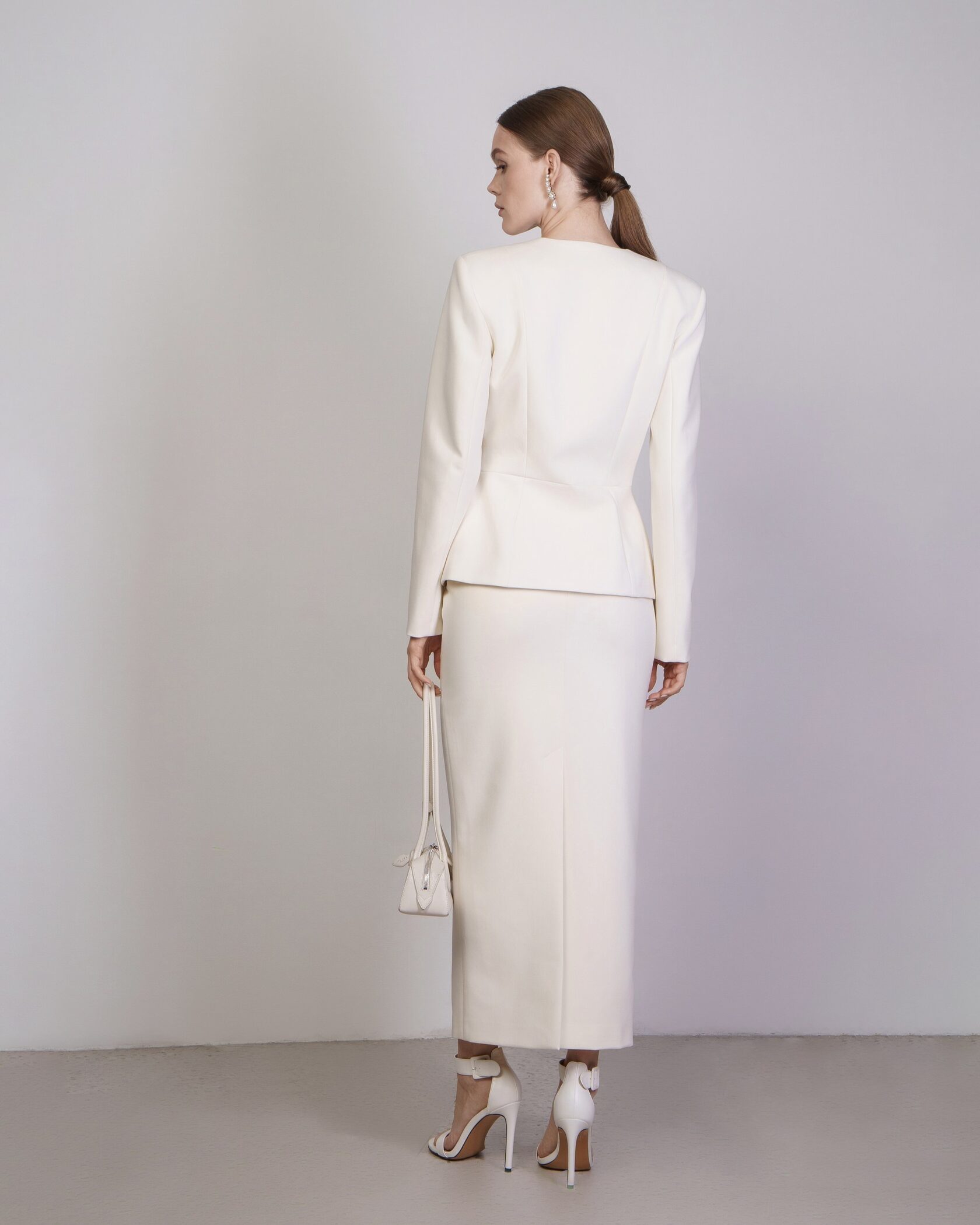 Юбка-карандаш на высокой посадке длины макси со шлицей сзади.