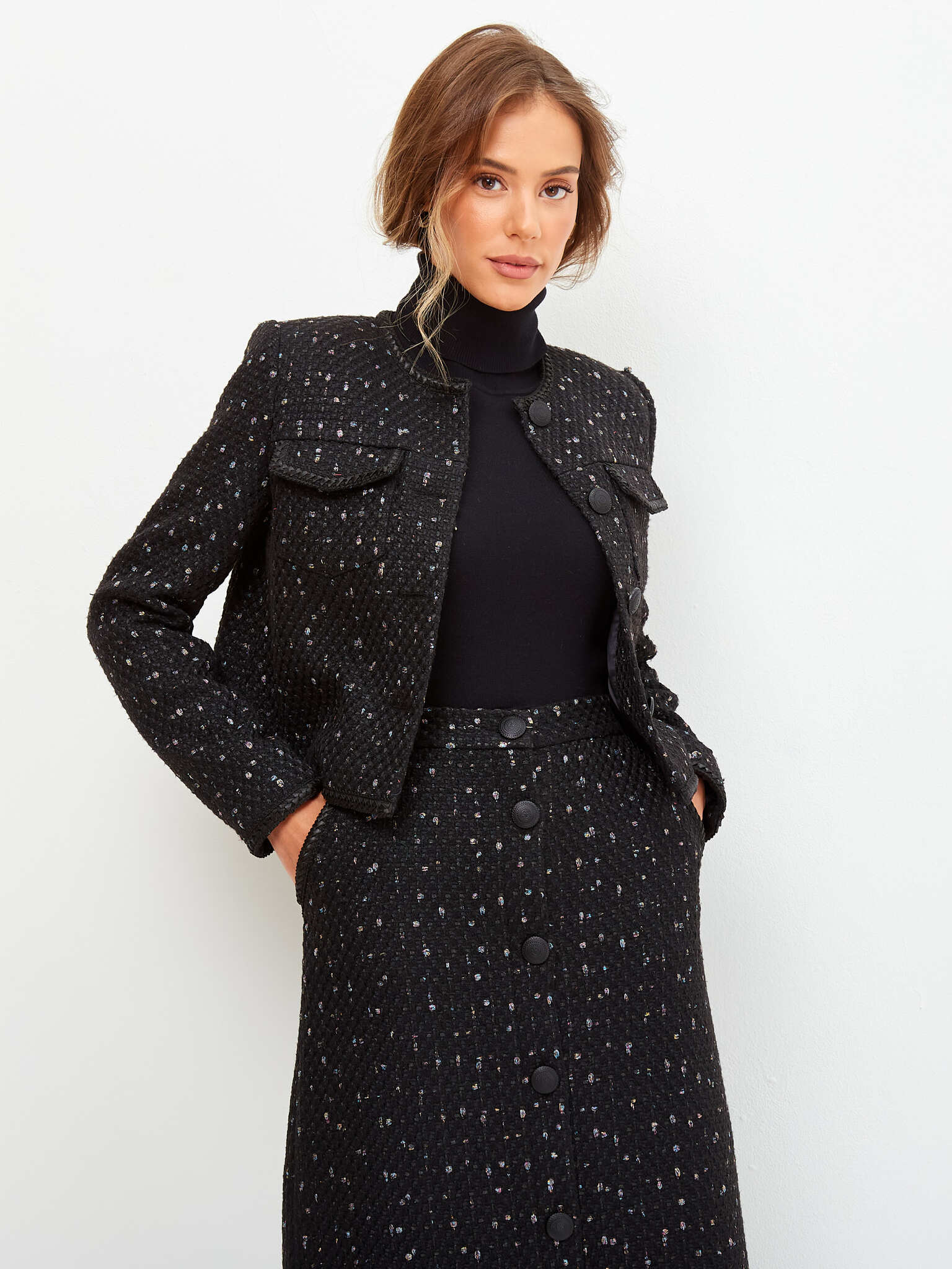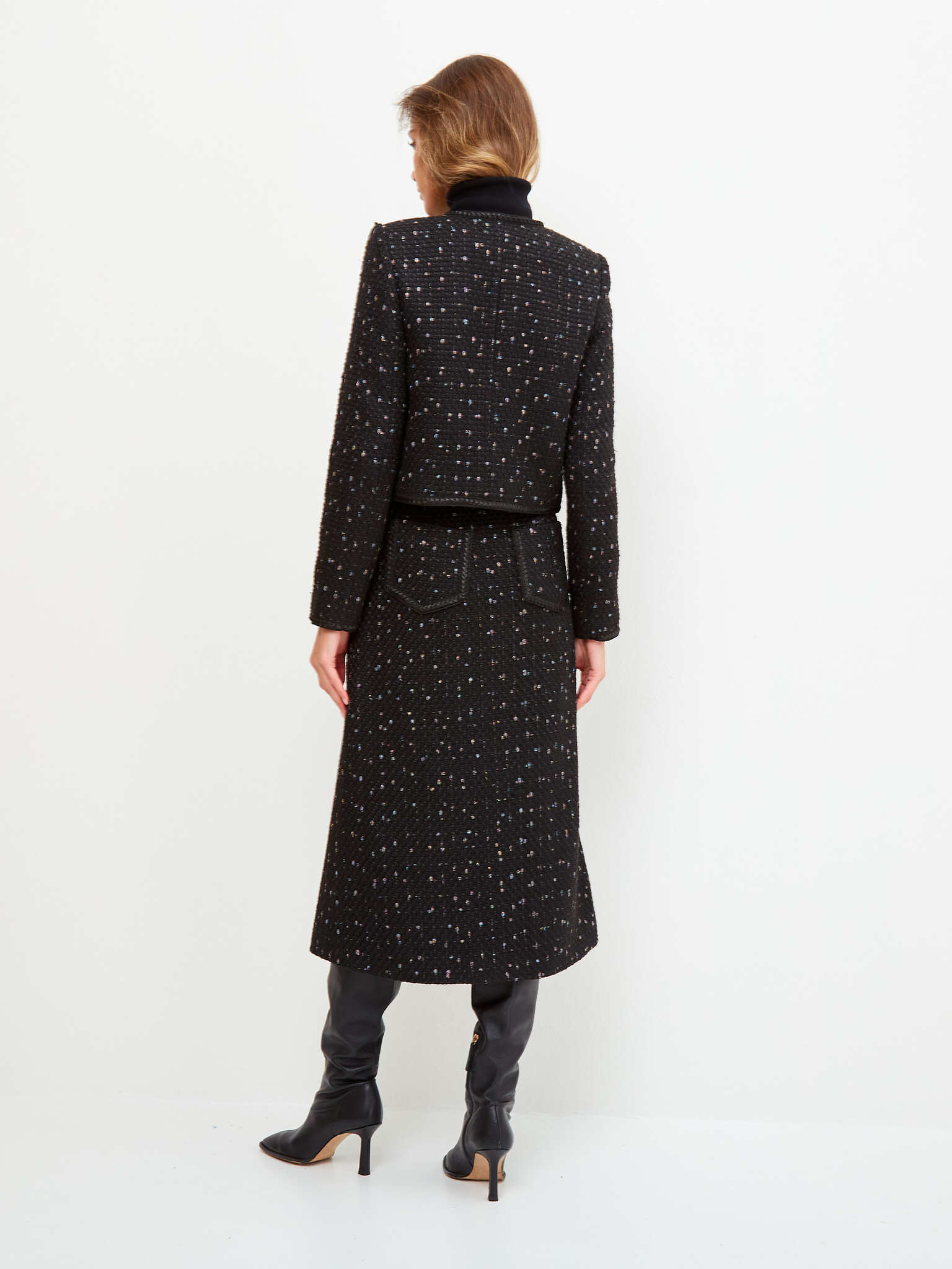 Что может быть универсальнее, чем юбка трапеция? Подходит для любого типа фигуры, скрывает недостатки и подчеркивает талию. Наша юбка выполнена из плотного твида, с подкладом по всей длине. Внутри под пуговицами спрятана молния. Нижнюю часть юбки можно расстегнуть и оставить разрез. Молния идет до середины, чтобы можно было расстегнуть снизу пуговицы.