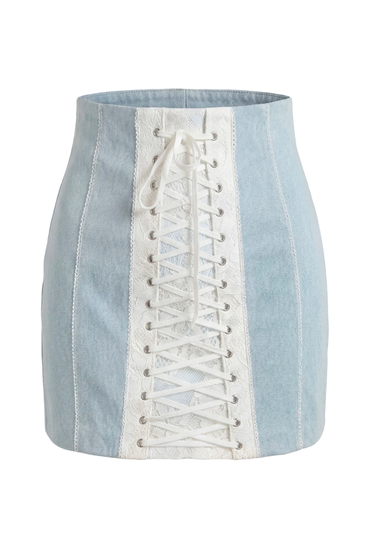 Классика денима с неожиданным поворотом. Эта юбка — микс структурной формы и романтичного настроения: грубоватая джинса в дуэте с белым кружевом создаёт образ «девочка может всё». Завышенная талия подчёркивает фигуру, воланы добавляют лёгкости и движения. Идеальна для тех, кто устал выбирать между дерзостью и нежностью — тут всё сразу.