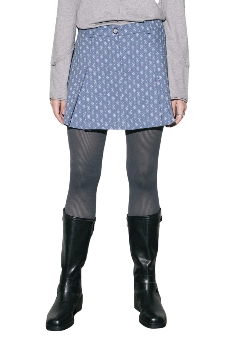 Юбка мини на заниженной посадке, с бантовыми складками по переду, на застежке-молнии, из 100% хлопкового жаккарда в серо-голубом оттенке.