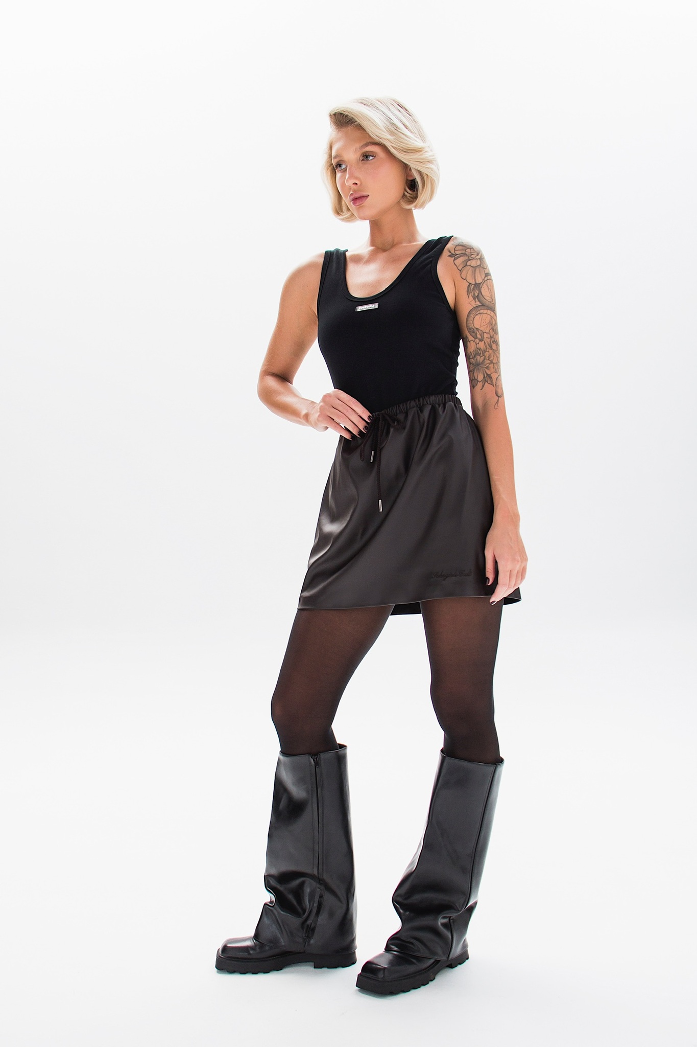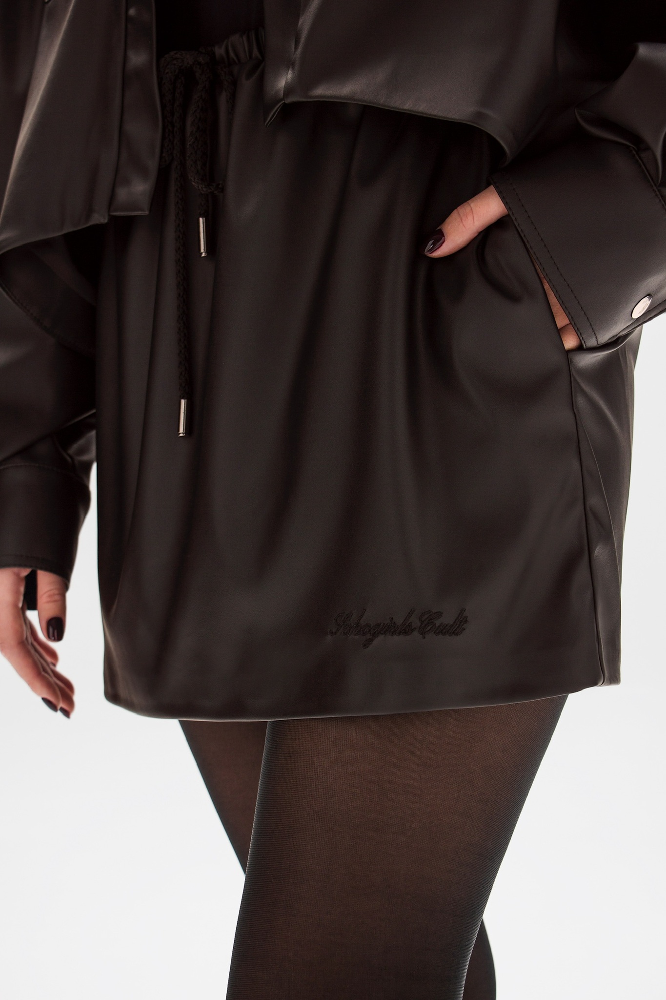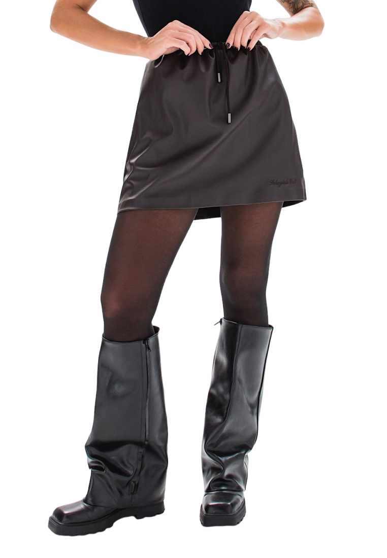 Юбка NYXX из мягкой экожи на мягкой резинке со шнурком для регулировки и вышивкой снизу.