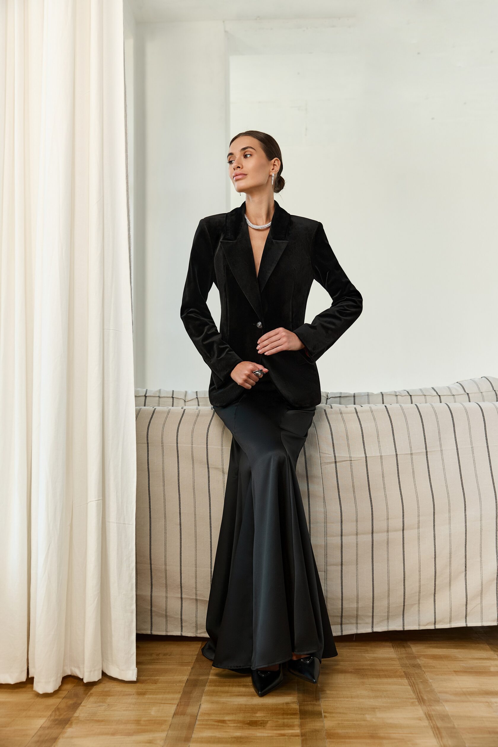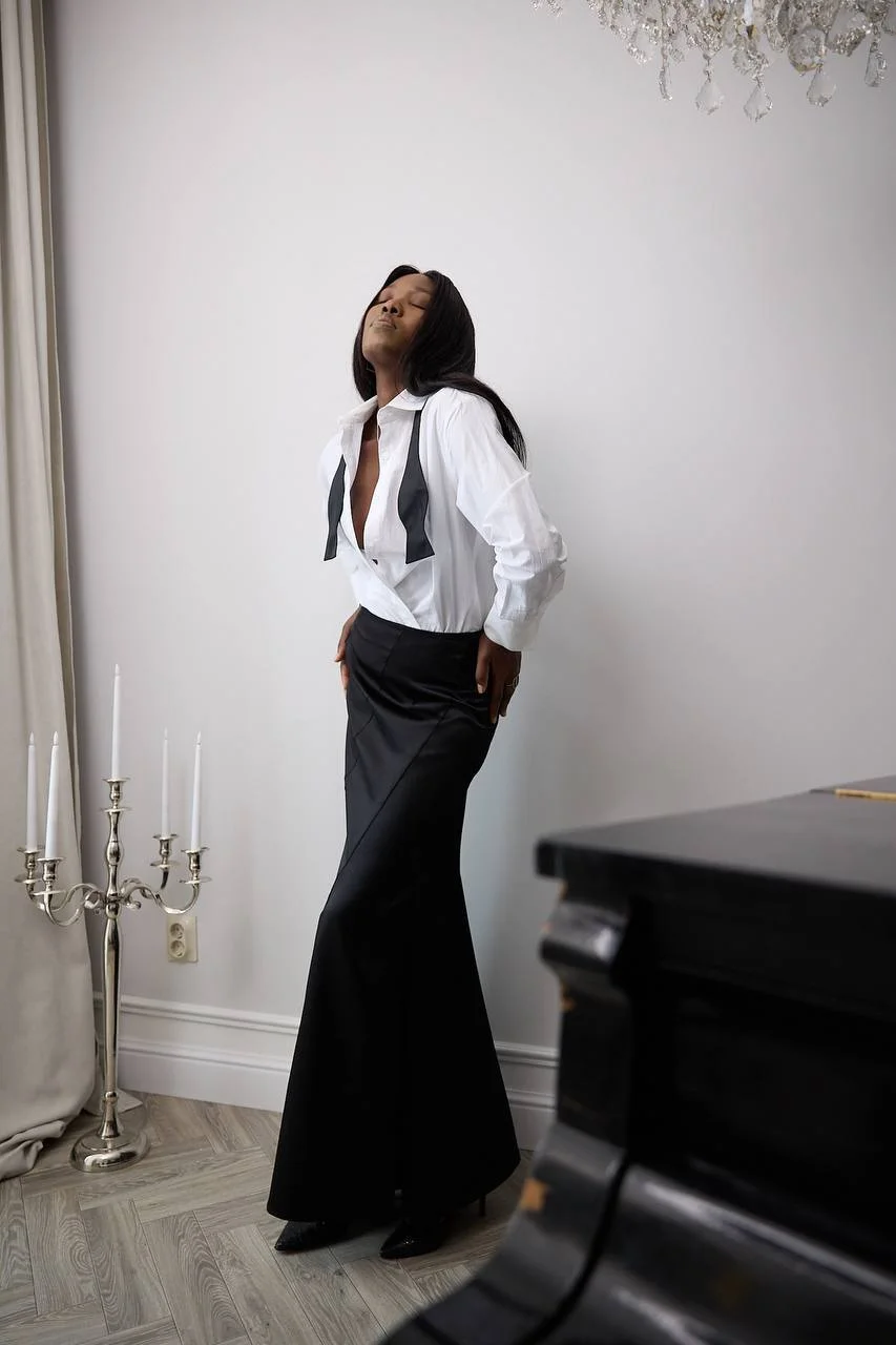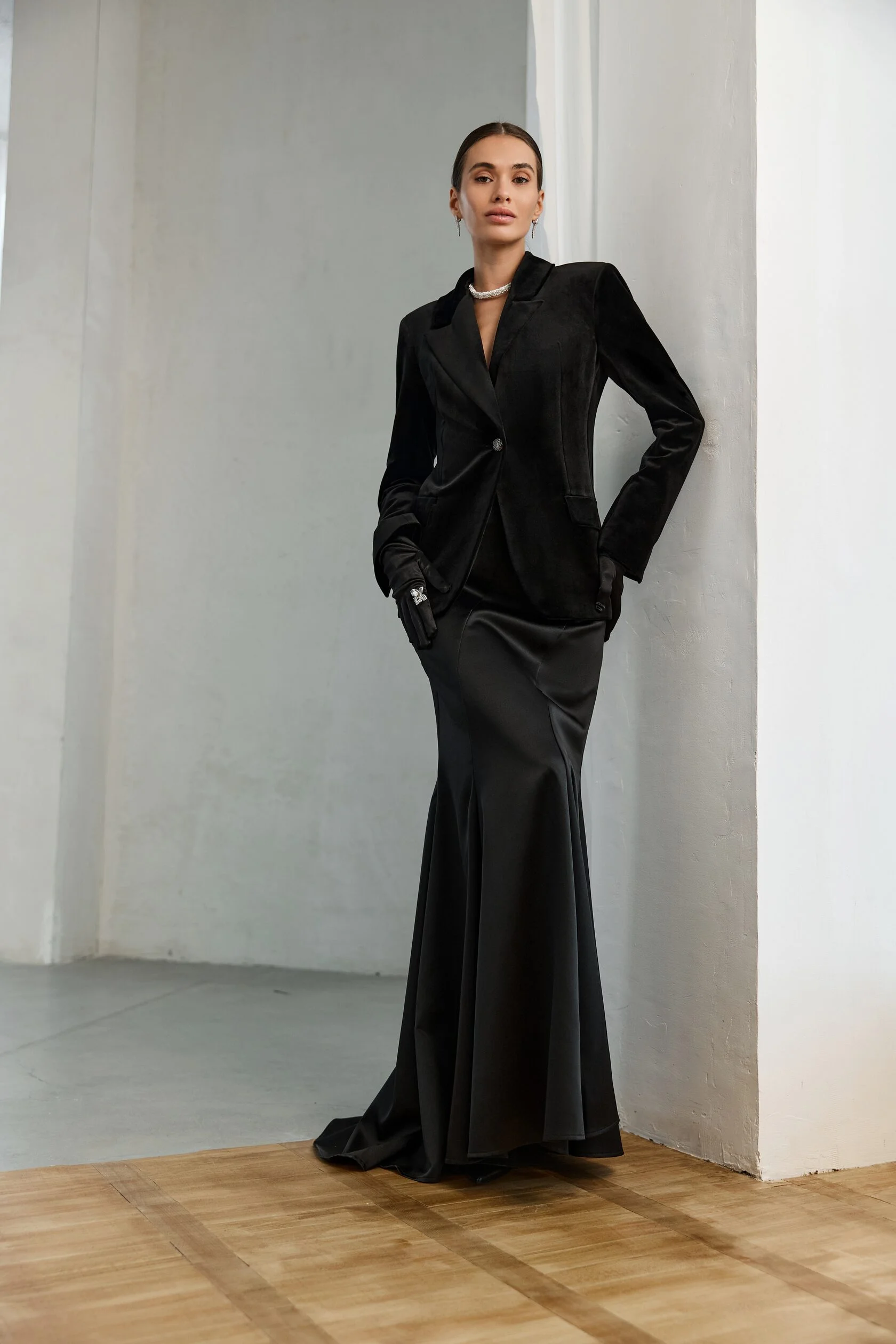 Юбка кроя годе, выполнена из плотного атласа, создает невероятный женственный силуэт. По задней части изделия небольшой шлейф, добавит грациозности и шарма вашему образу