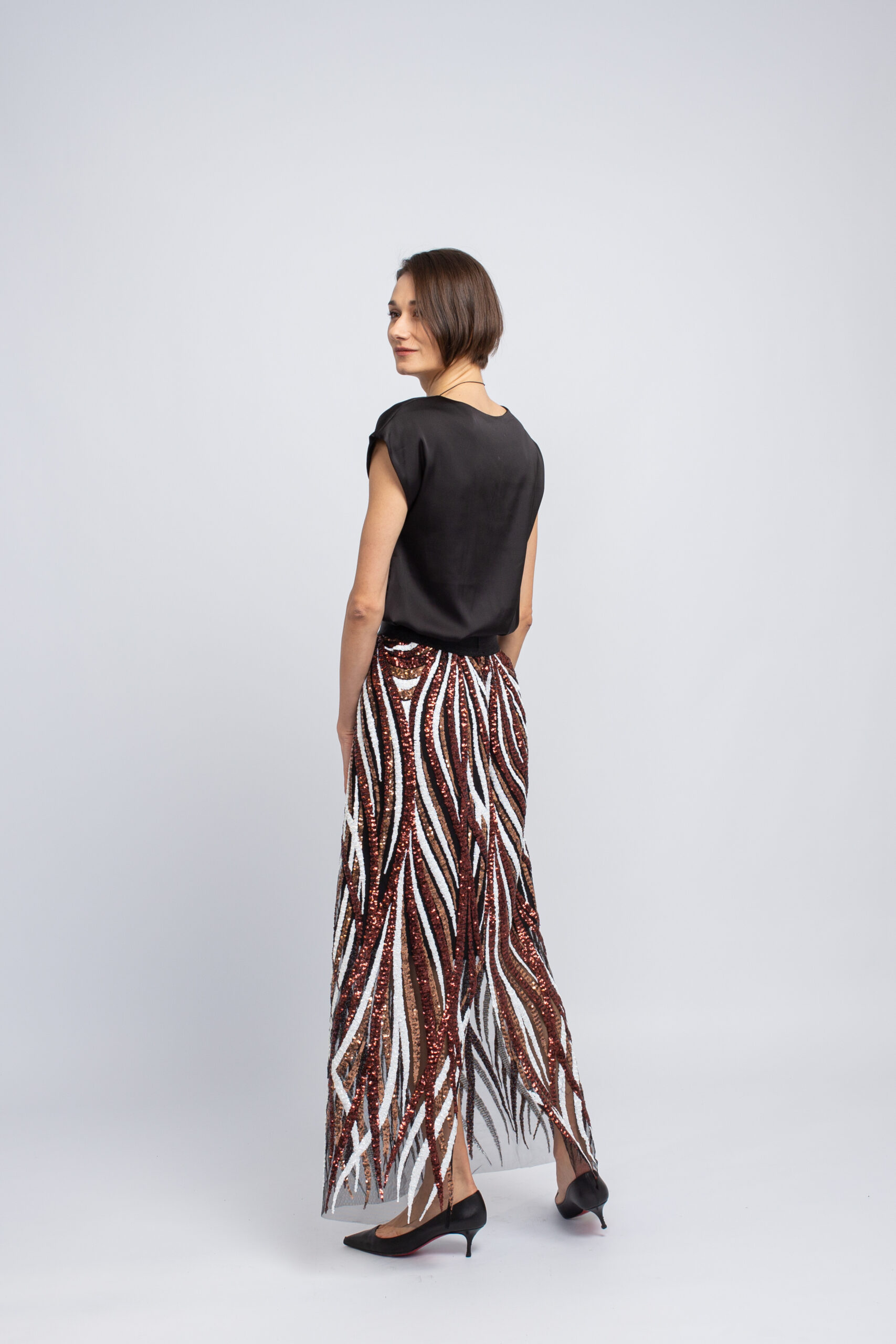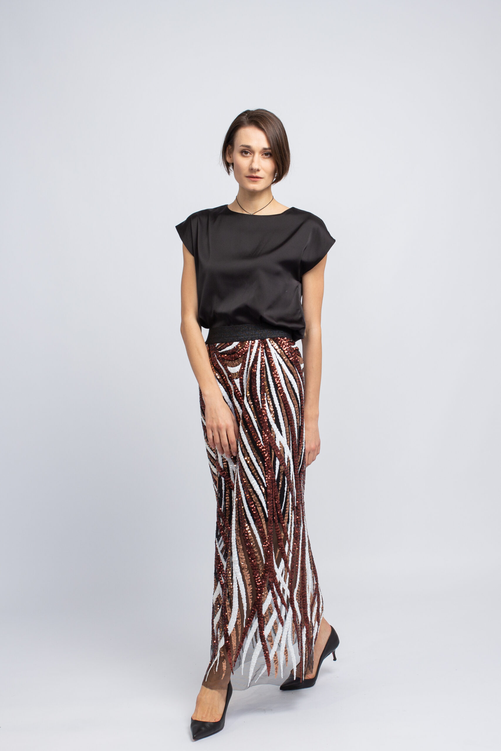 Выполнена из премиальной ткани, расшитой пайетками в абстрактный принт. Пояс на резинке облегчает ее ношение и выбор размера, так как сядет идеально практически на любую фигуру в пределах размерного ряда.