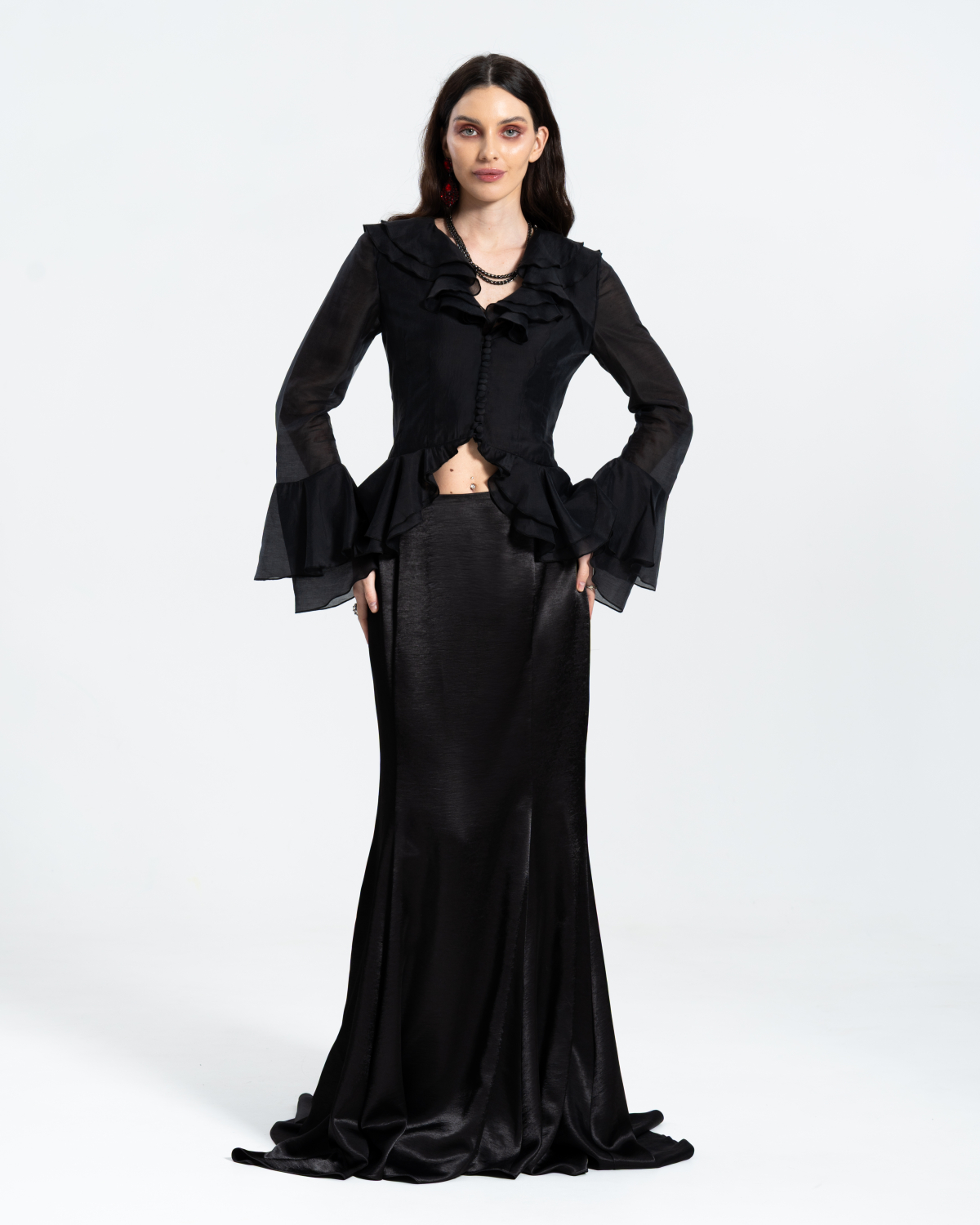 Юбка макси с высокой посадкой по талии и длиной в пол. Выполнена из не мнущейся ткани, скроена по косой. У юбки встроен разрез от середины бедра, внутри которого вставка из полупрозрачного тонкого шелкового шифона. Отличный вариант для составления торжественных образов. Сочетайте юбку с нарядным верхом – корсетами и блузками.