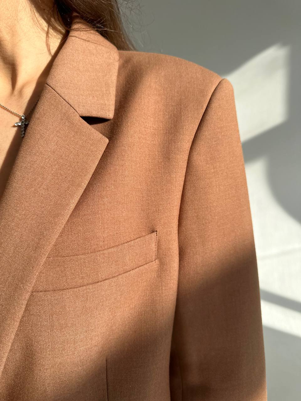 Нейтральный тёплый оттенок какао/песочный делает этот пиджак настоящим must-have: он мягко смягчает образ, добавляет тепла и выглядит дорого в любое время года. Прямой крой — классика, которая идеально сидит на большинстве фигур, подчёркивает осанку и позволяет создавать как строгие деловые, так и расслабленные повседневные луки.