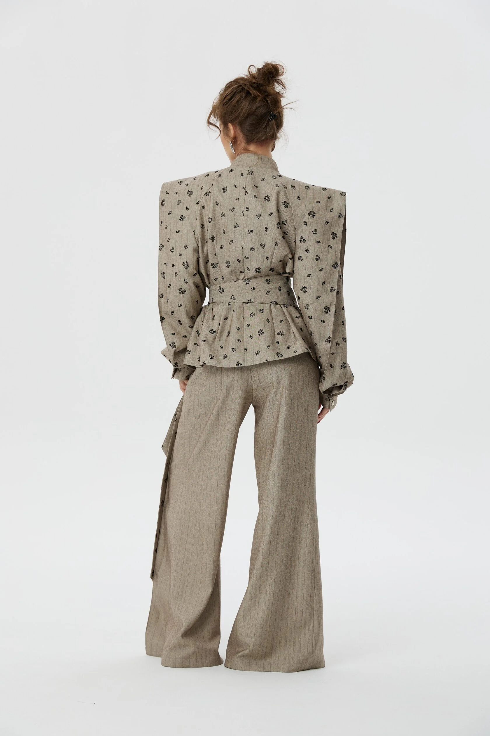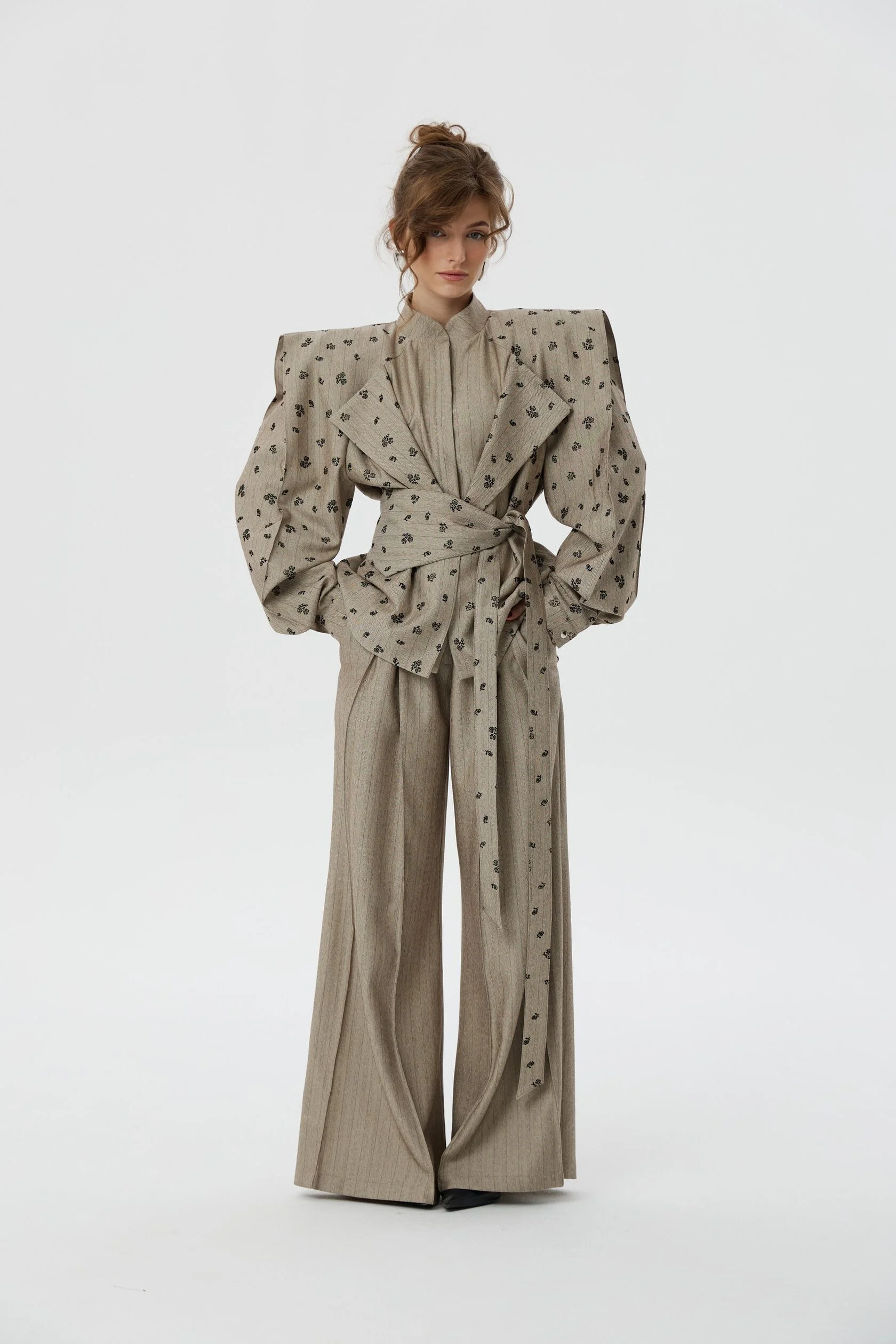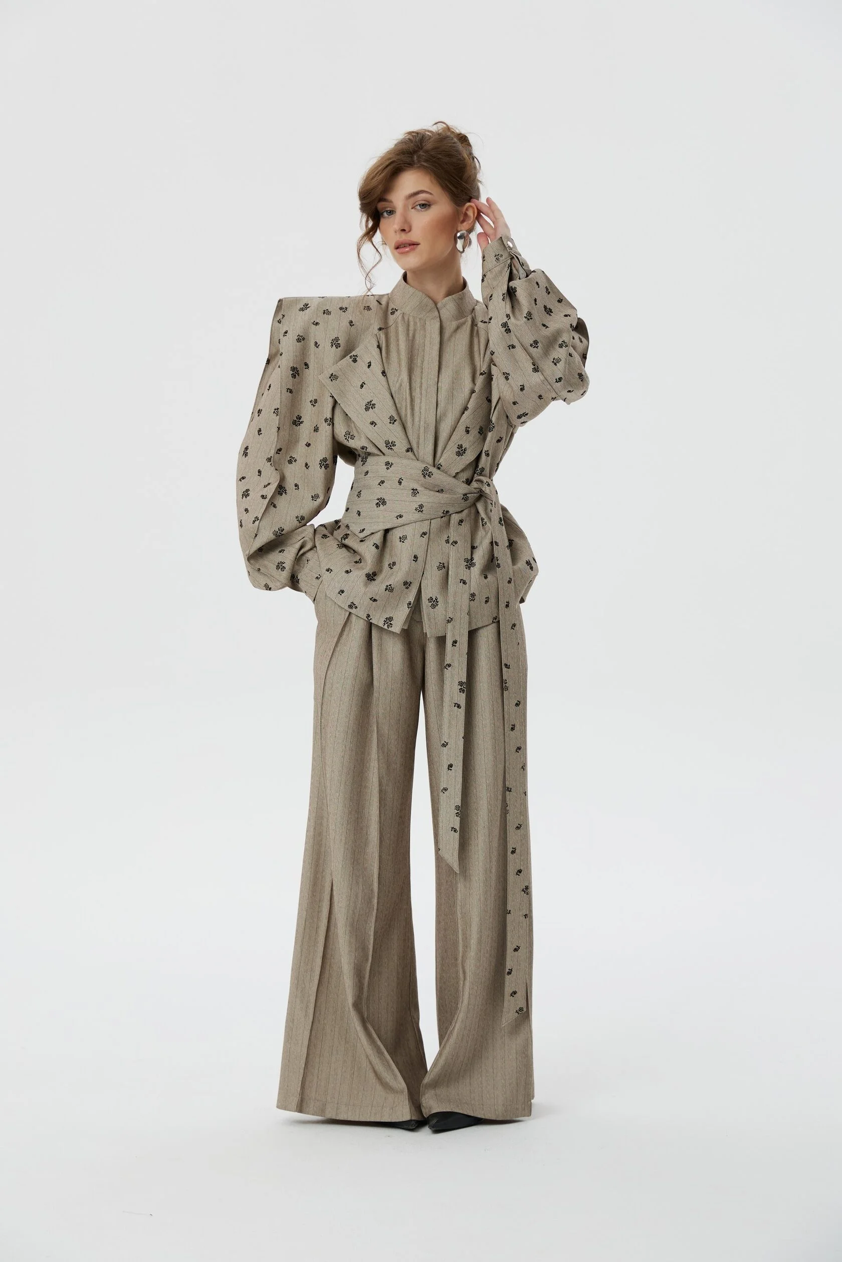 Мы рекомендуем носить жакет Франкенштейна в комплекте с брюками-палаццо на завышенной талии.