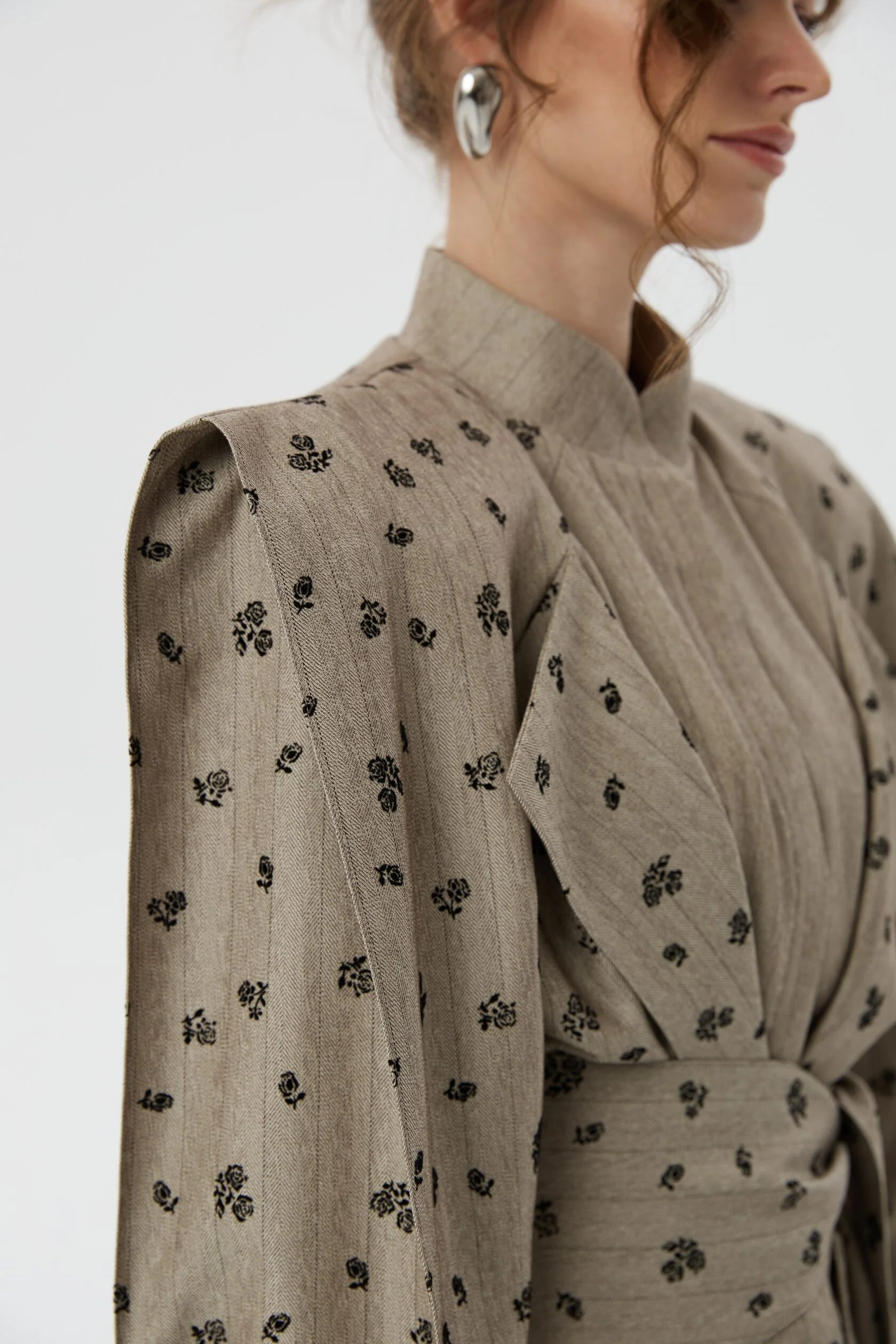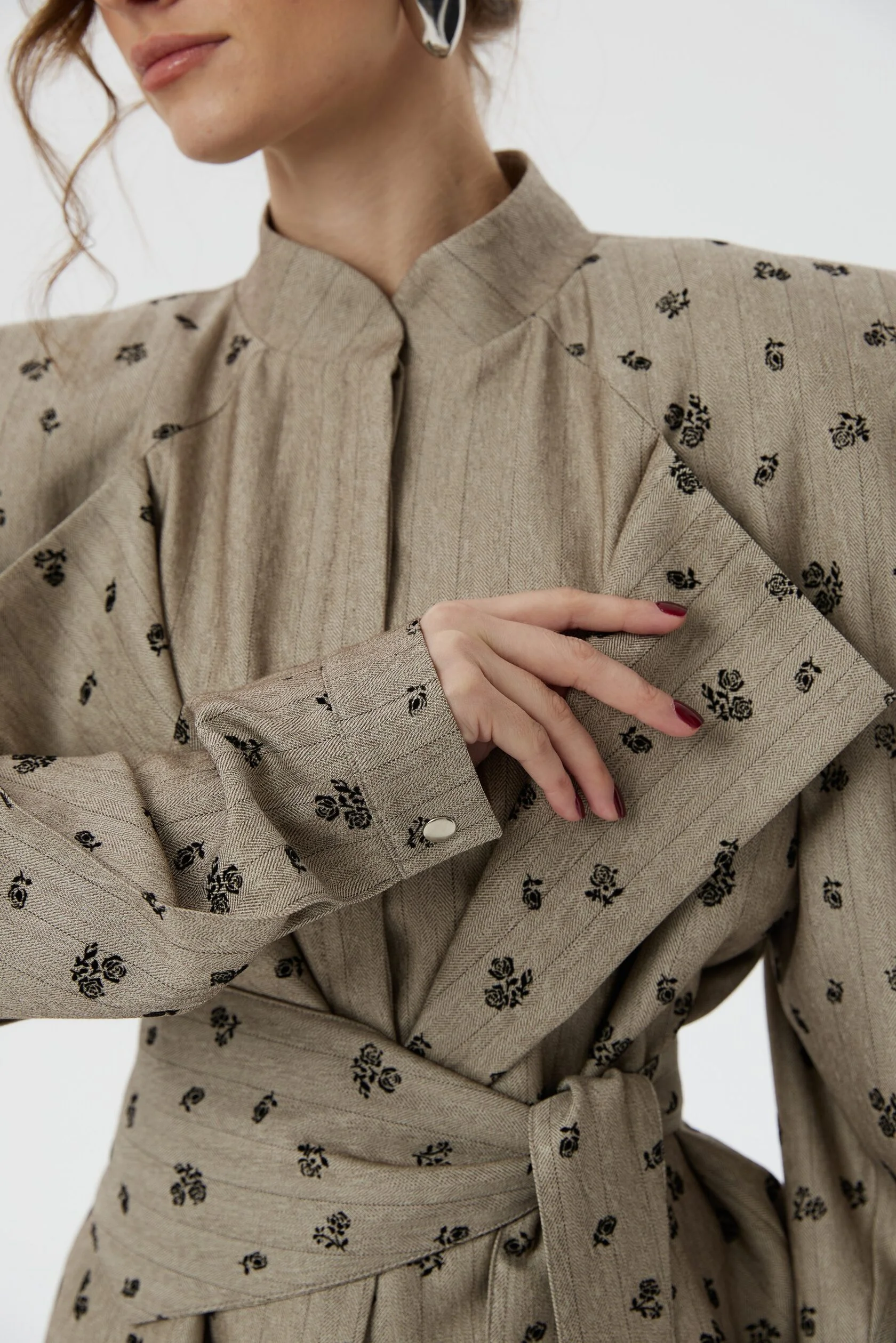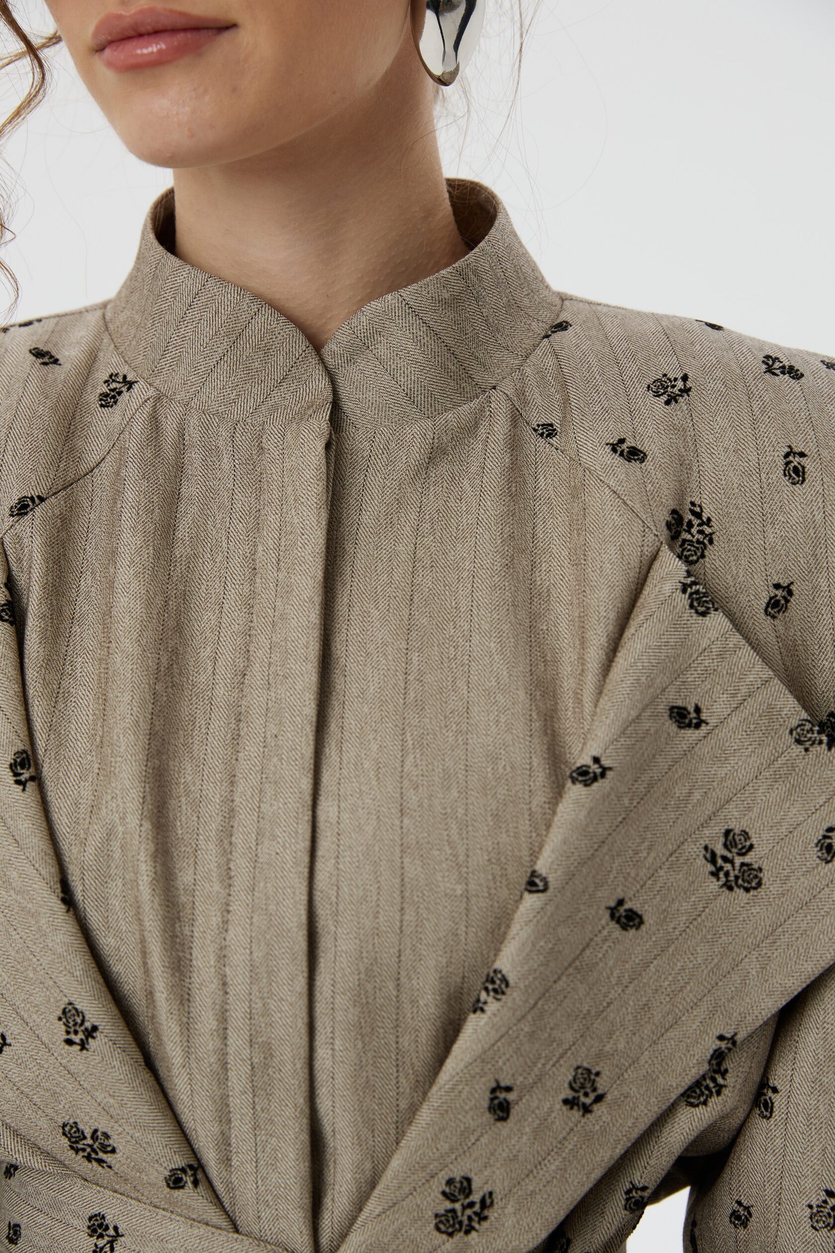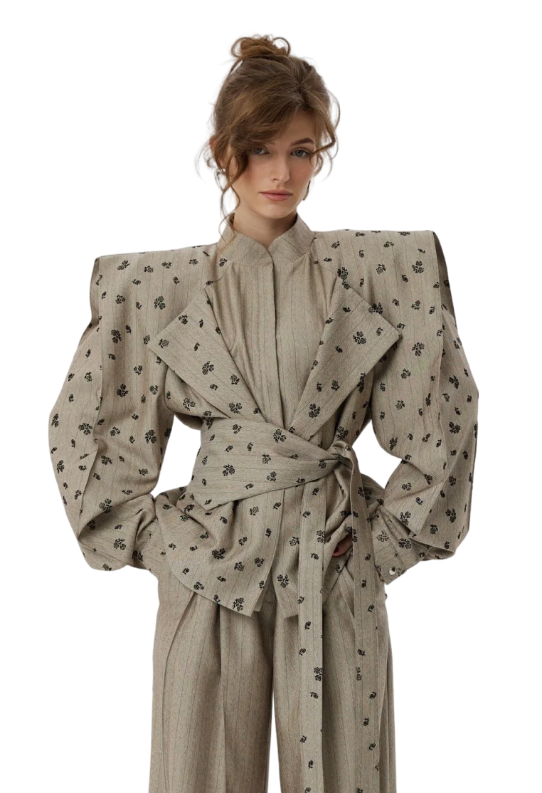 Укороченный жакет с акцентной линией плеча и объемными рукавами сделан из костюмной ткани в легкую, едва заметную полоску, которую мы дополнили тканью-компаньоном в цветочек. Благодаря продуманной плечевой конструкции, изделие отлично держит форму, а благодаря фигурному поясу, который подчеркивает талию, создаются четкие женственные формы.