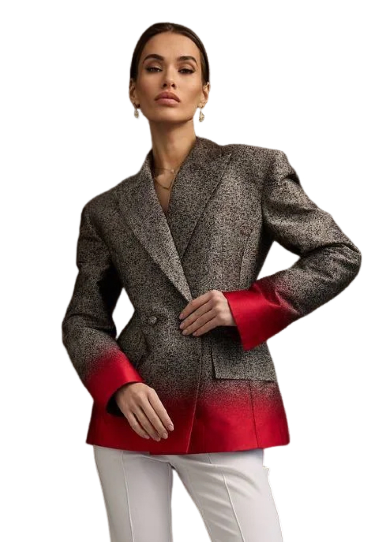Силуэтный жакет из костюмного бежевого жаккарда с градиентным переходом в красный оттенок. Увеличенная линия плеча и выделенная талия формируют актуальный сейчас женственный силуэт.