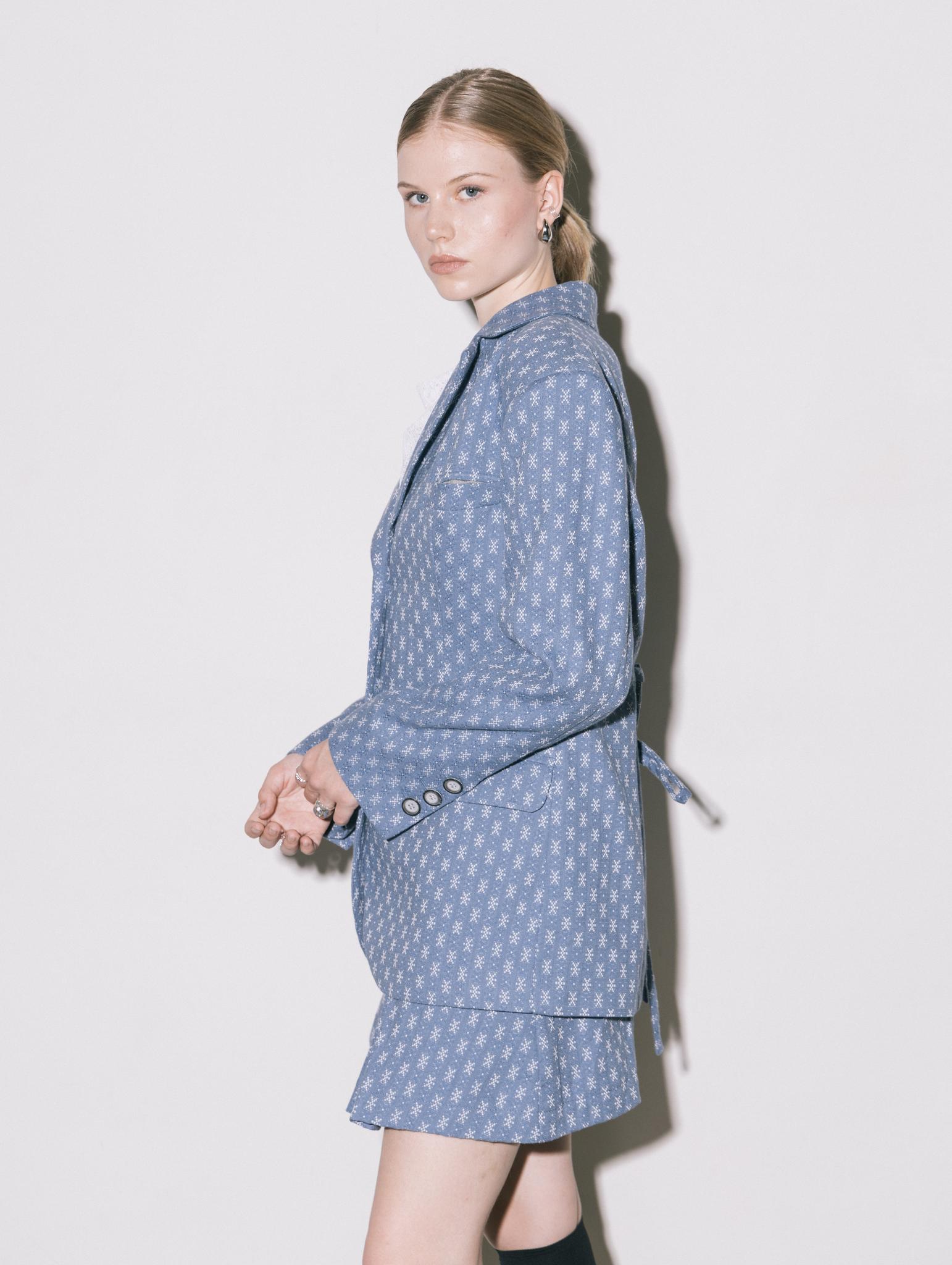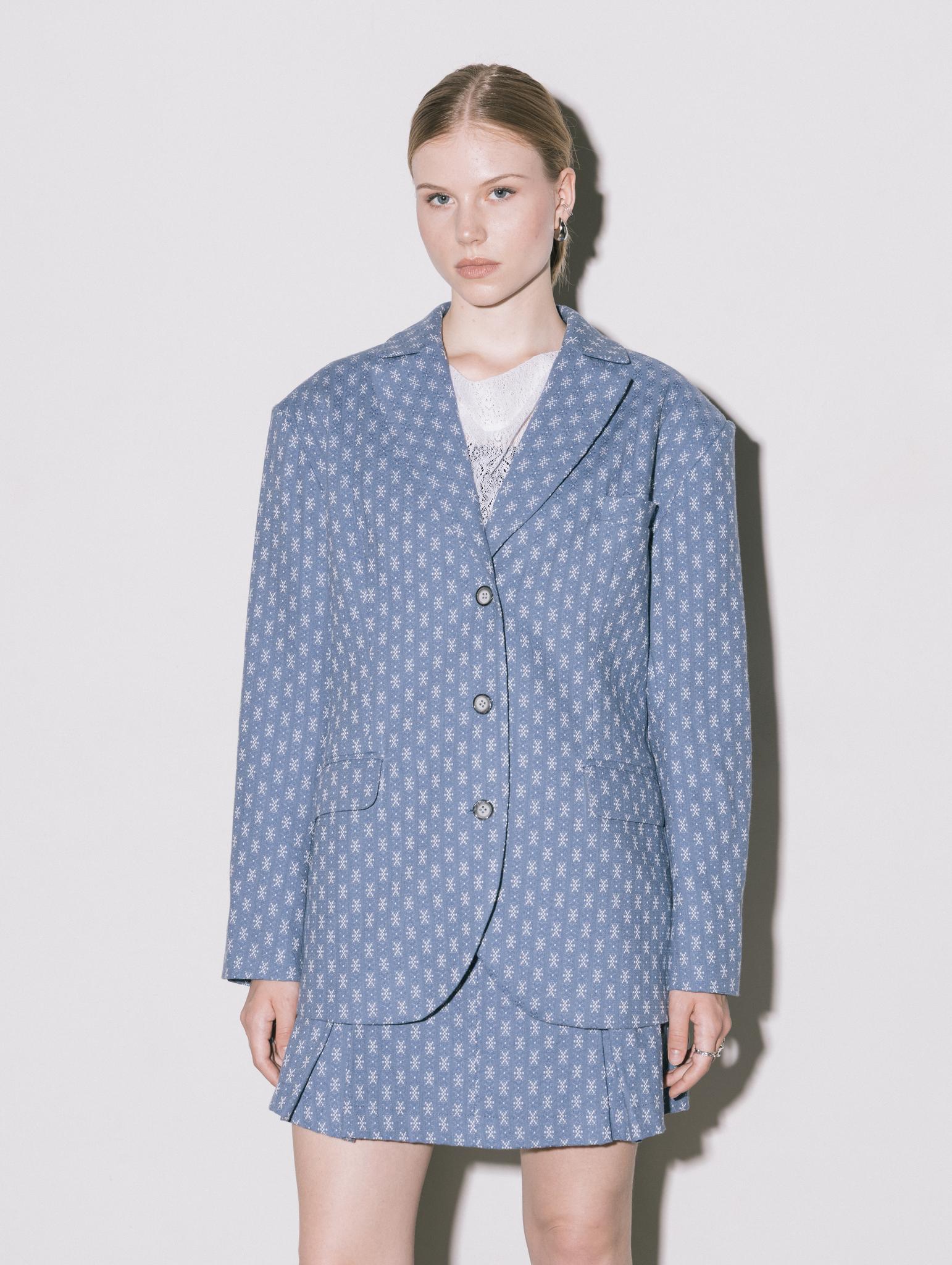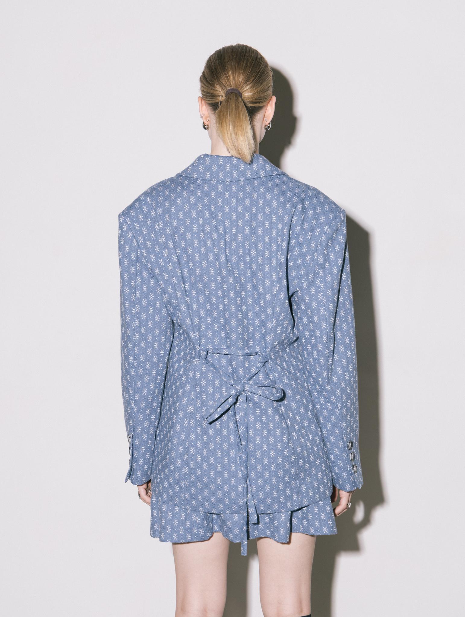 Жакет оверсайз с плечевыми накладками, с возможностью приталивания, из 100% хлопкового жаккарда в серо-голубом оттенке.