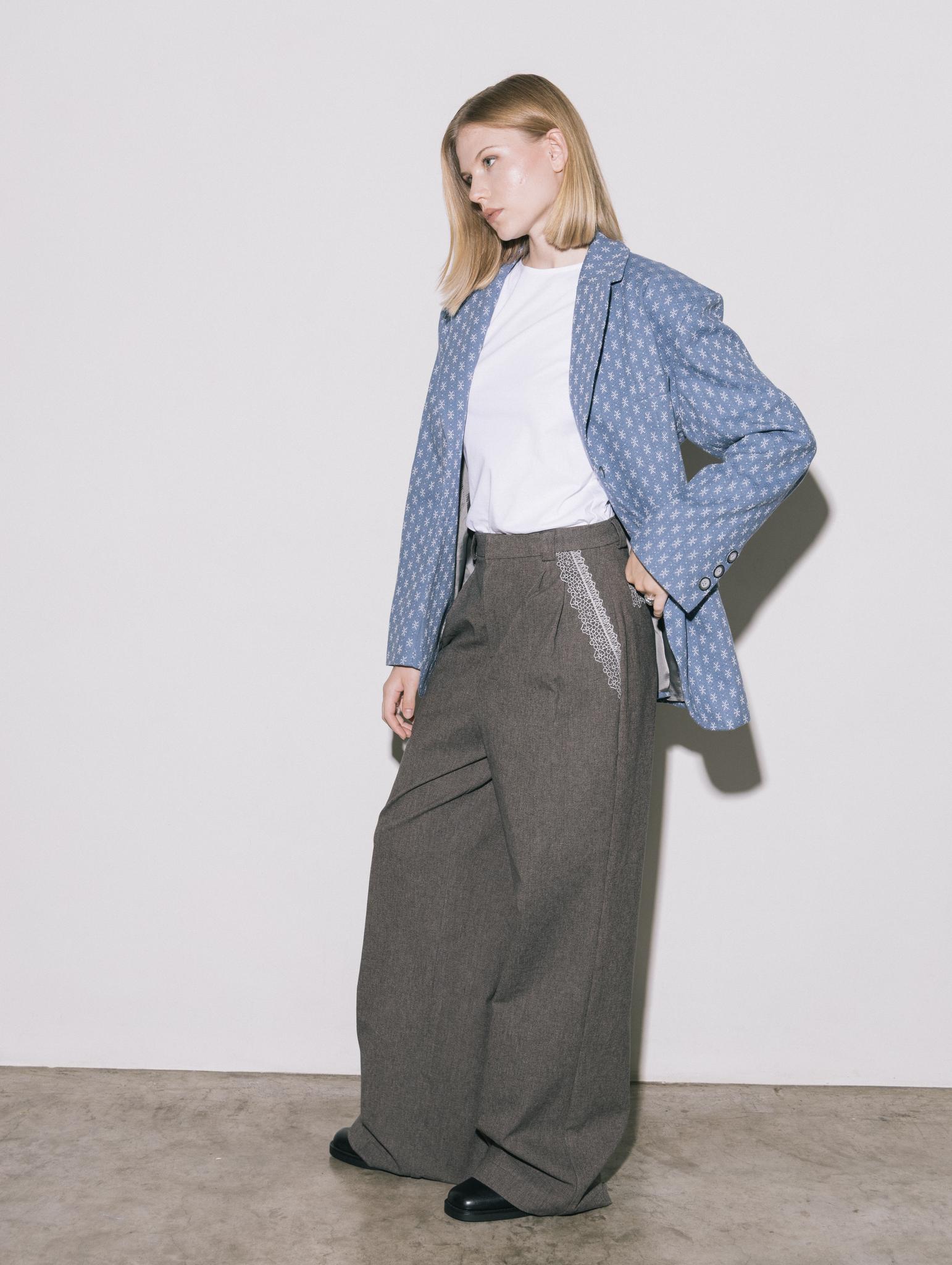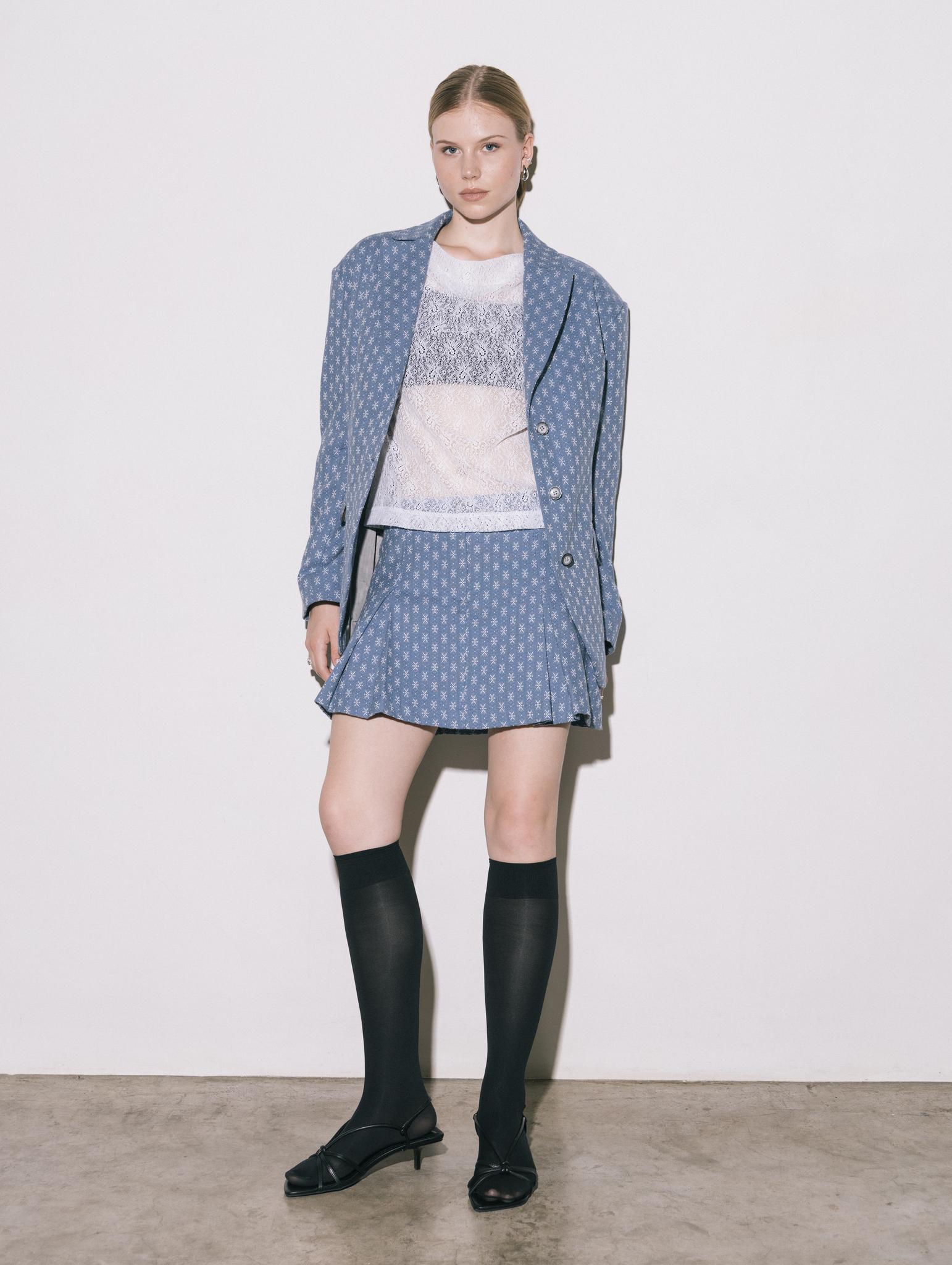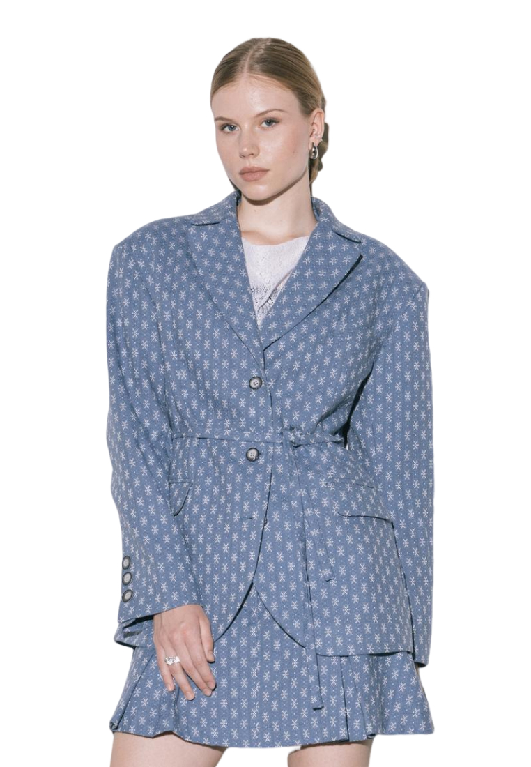 Жакет оверсайз с плечевыми накладками, с возможностью приталивания, из 100% хлопкового жаккарда в серо-голубом оттенке.