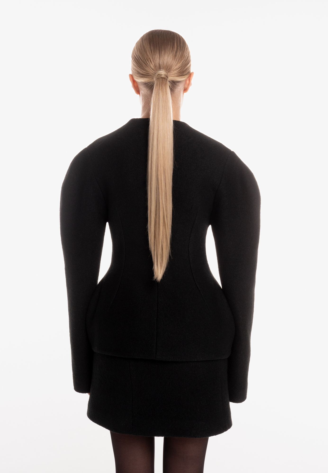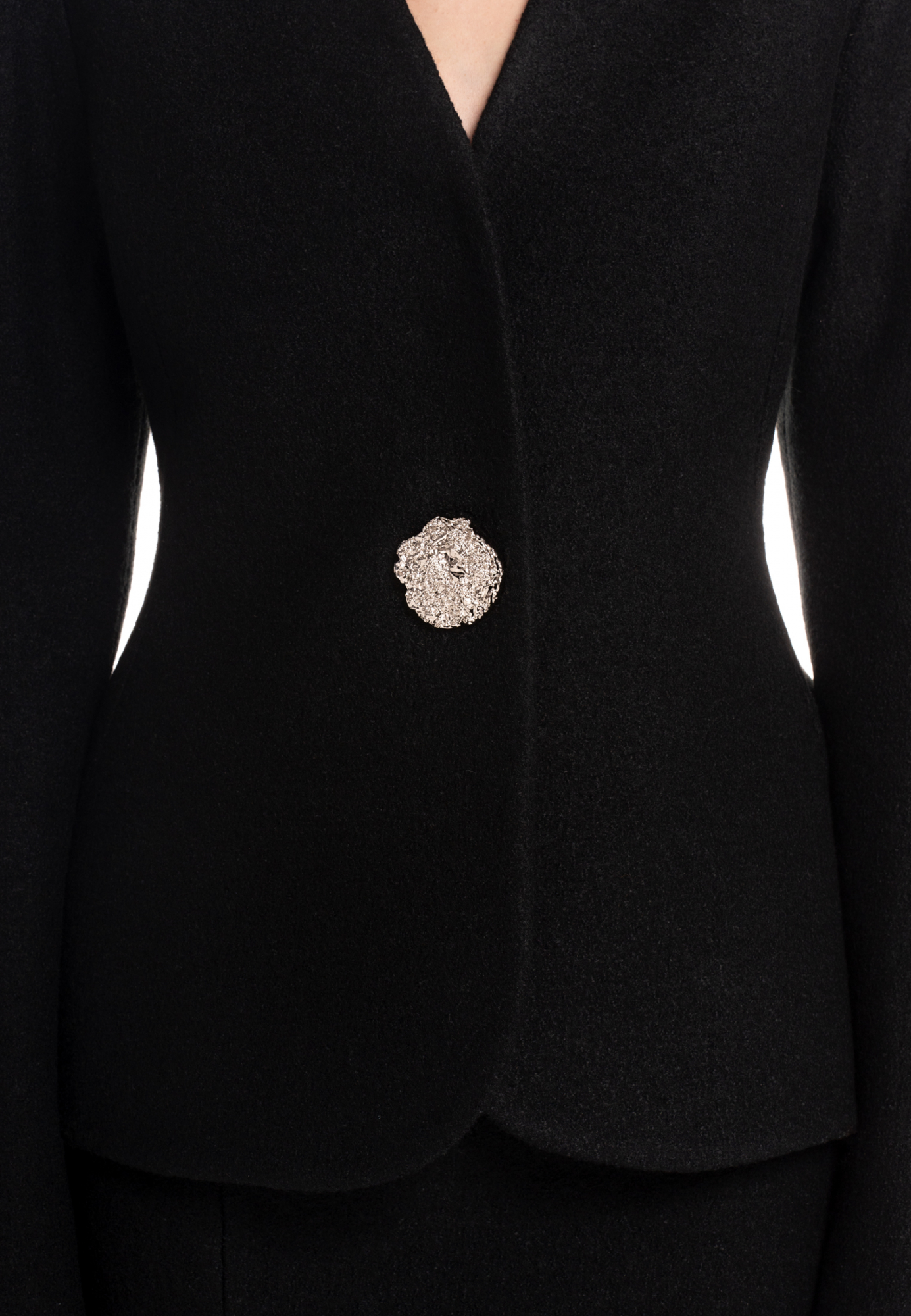 Графичный и необычный, жакет из буклированной шерсти "Беатрис" соединяет в себе изысканность и комфорт, а также тепло. Тактильно приятный, подходит для сезона холодов и межсезонья, очень уютный, на подкладке из вискозы. Моделирует из любого типа фигуры силуэт песочные часы. Идеально будет смотреться с юбкой мини "Беатрис", а также с джинсами. Застегивается на 2 внутренние удобные кнопки. Сверху украшен декоративной крупной пуговицей серебряного цвета. Цвет - ночное небо