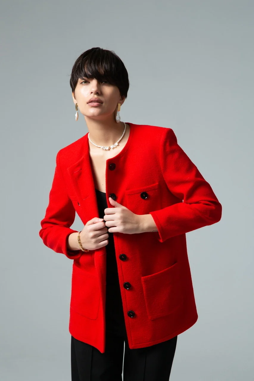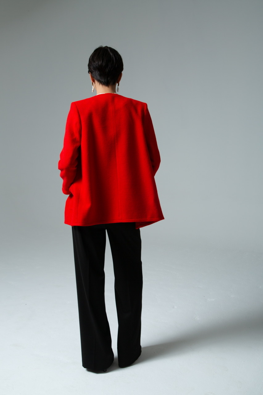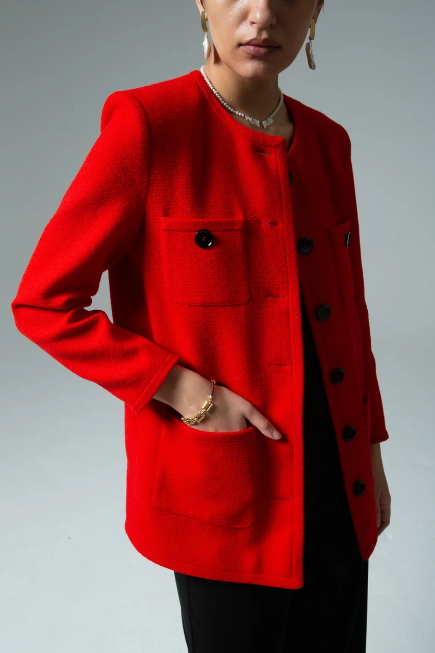 Жакет однобортный на подкладке, застежка на пуговицах, удлиненный, прямого силуэта, без воротника. На полочке 4 накладных кармана. По низу жакета, низу рукавов,по борту, горловине и верхнему краю карманов- декоративная отделка.