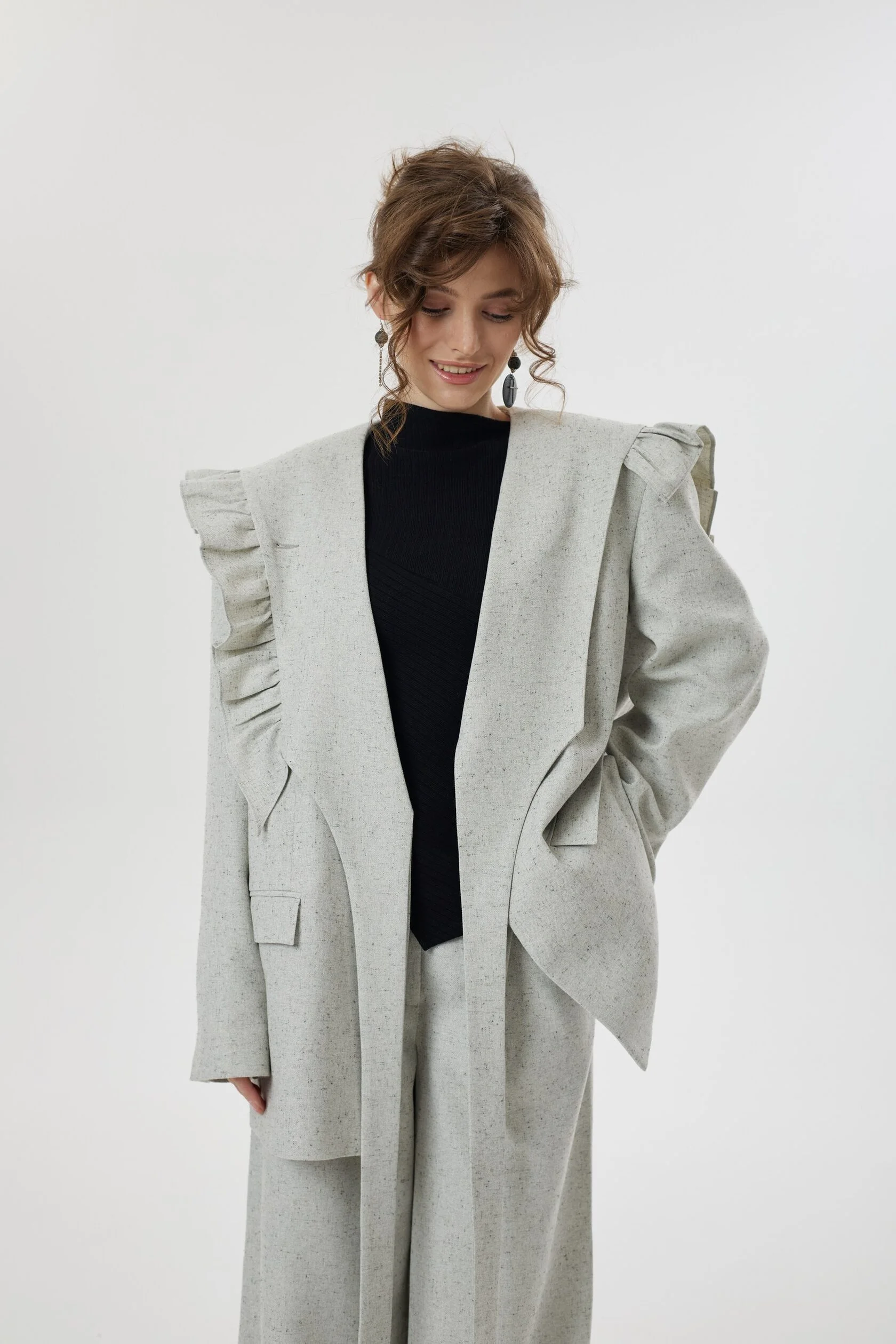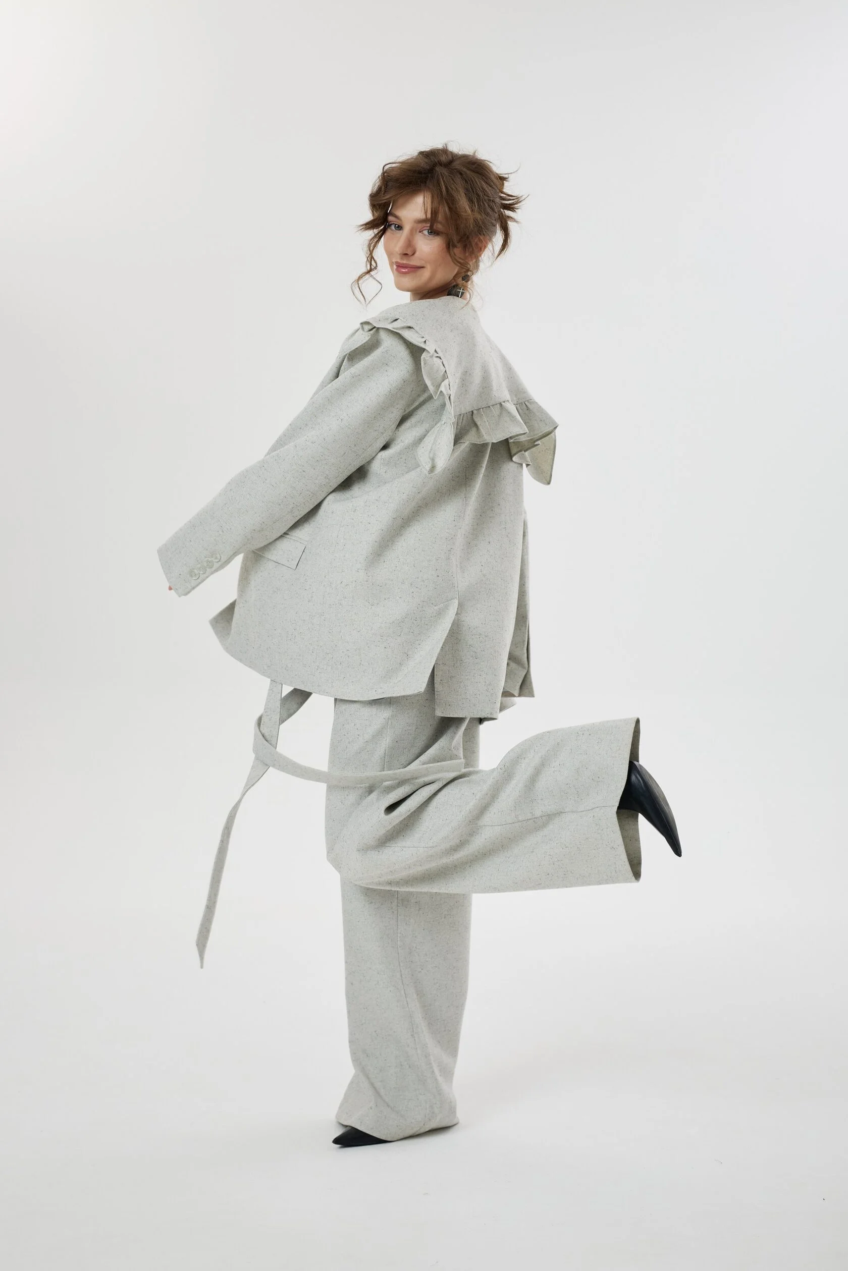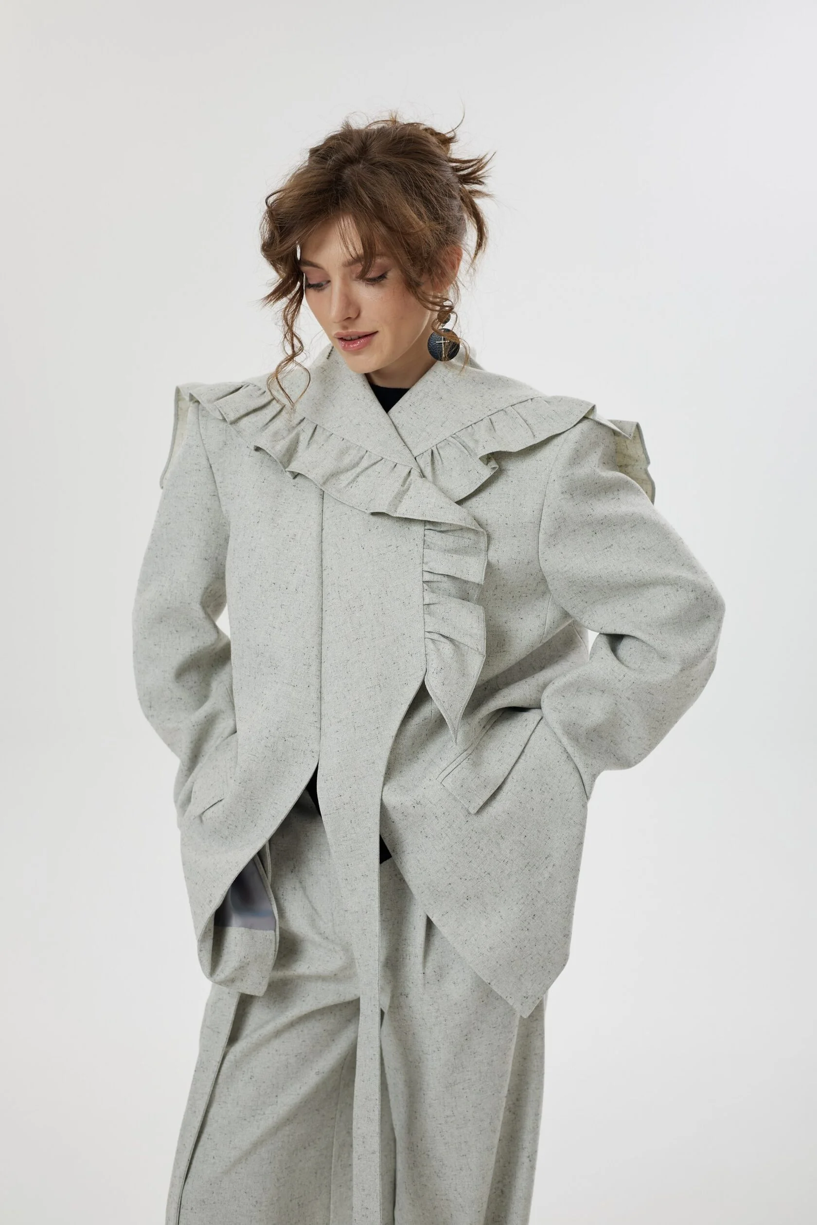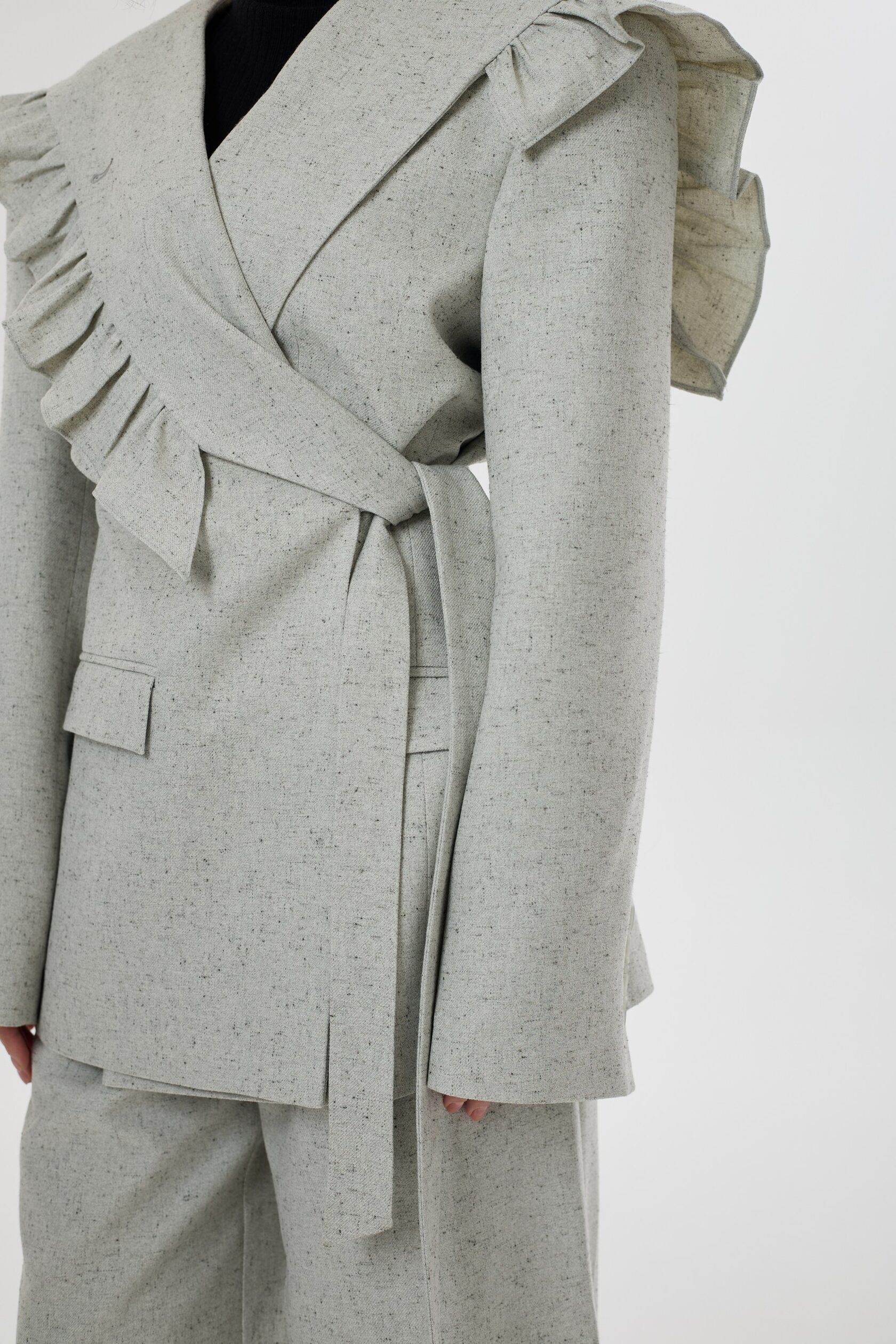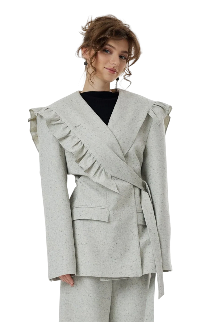 Жакет с нарочито увеличенной линией плеча, форму которого мы смягчили необычным сложным воротником с игривыми рюшами. Лацканы воротника плавно переходят в пояс, которым можно подчернуть талию, либо оставить незавязанным, создав более расслабленный образ. Воротник так же имеет несколько вариантов застежки: мы сделали дополнительную пуговицу, чтобы вы могли поднять воротник и запахнуть его.