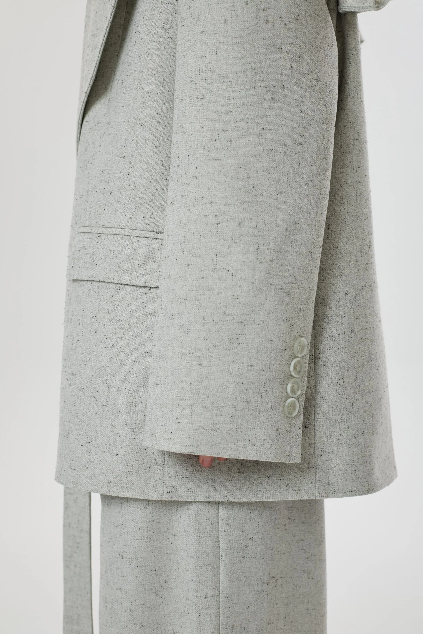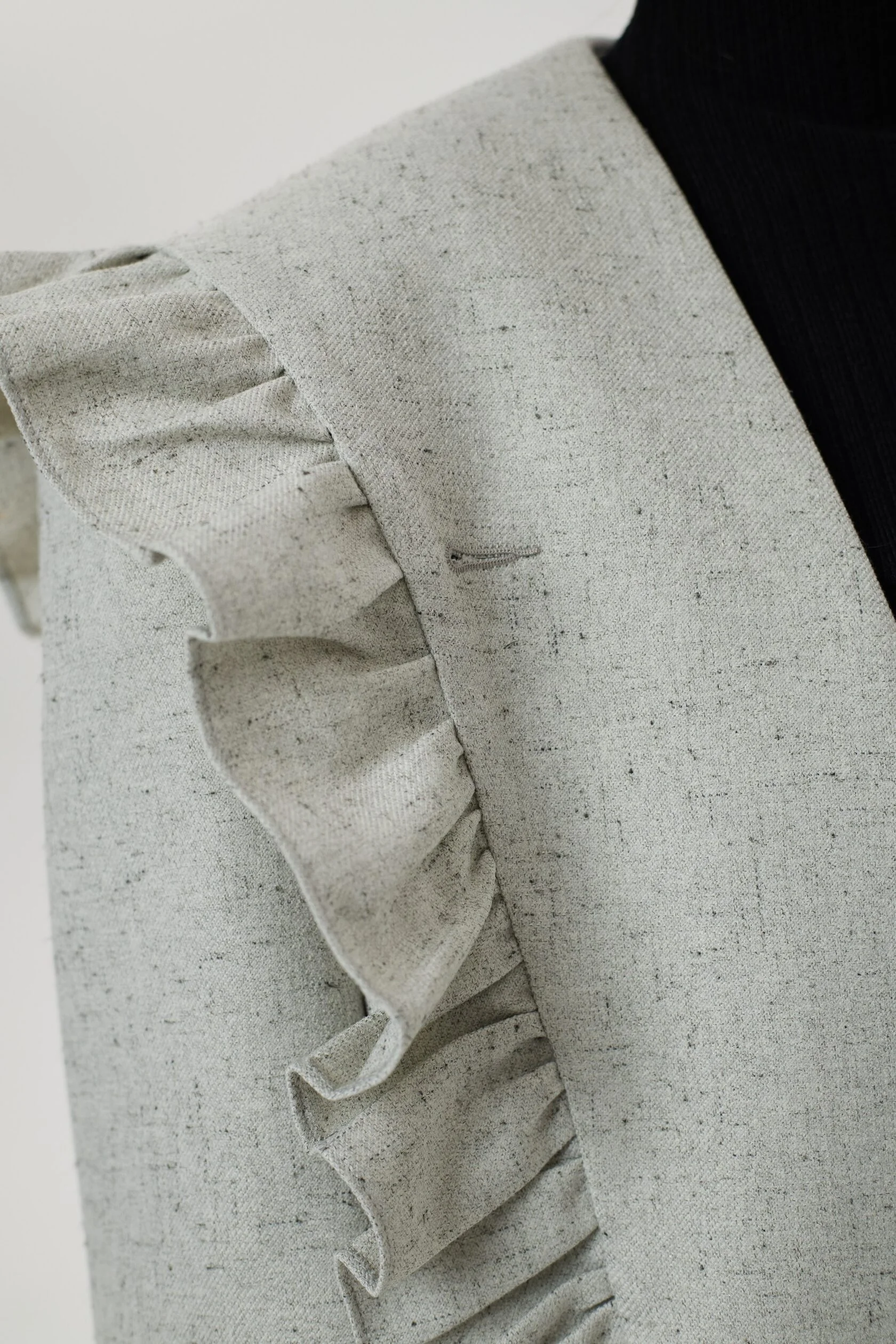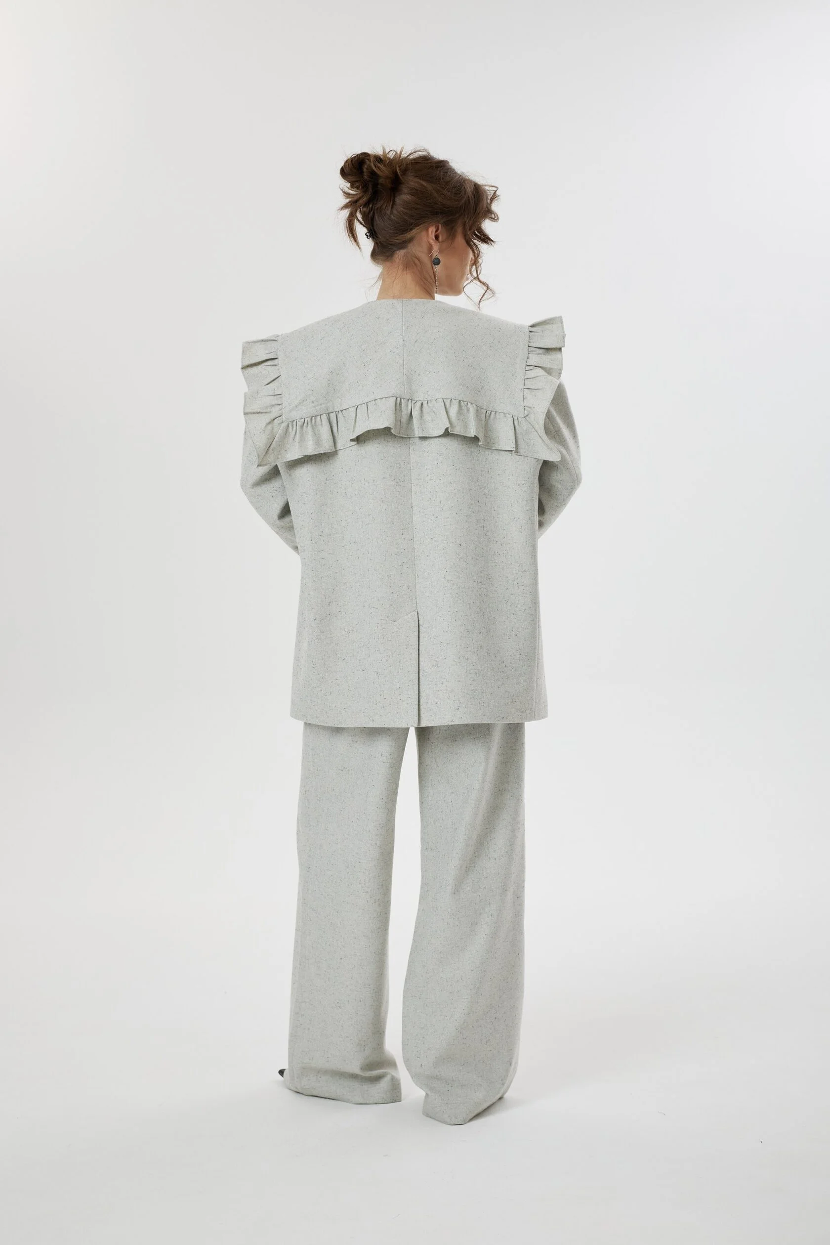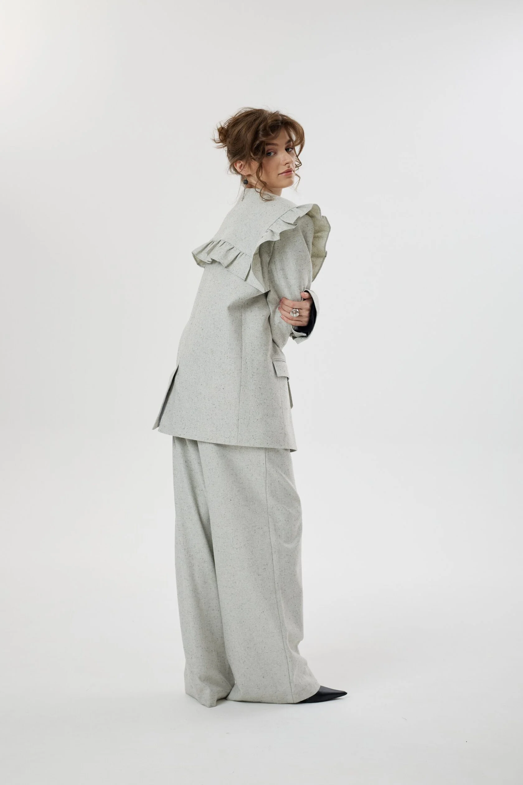 Жакет с нарочито увеличенной линией плеча, форму которого мы смягчили необычным сложным воротником с игривыми рюшами. Лацканы воротника плавно переходят в пояс, которым можно подчернуть талию, либо оставить незавязанным, создав более расслабленный образ. Воротник так же имеет несколько вариантов застежки: мы сделали дополнительную пуговицу, чтобы вы могли поднять воротник и запахнуть его.