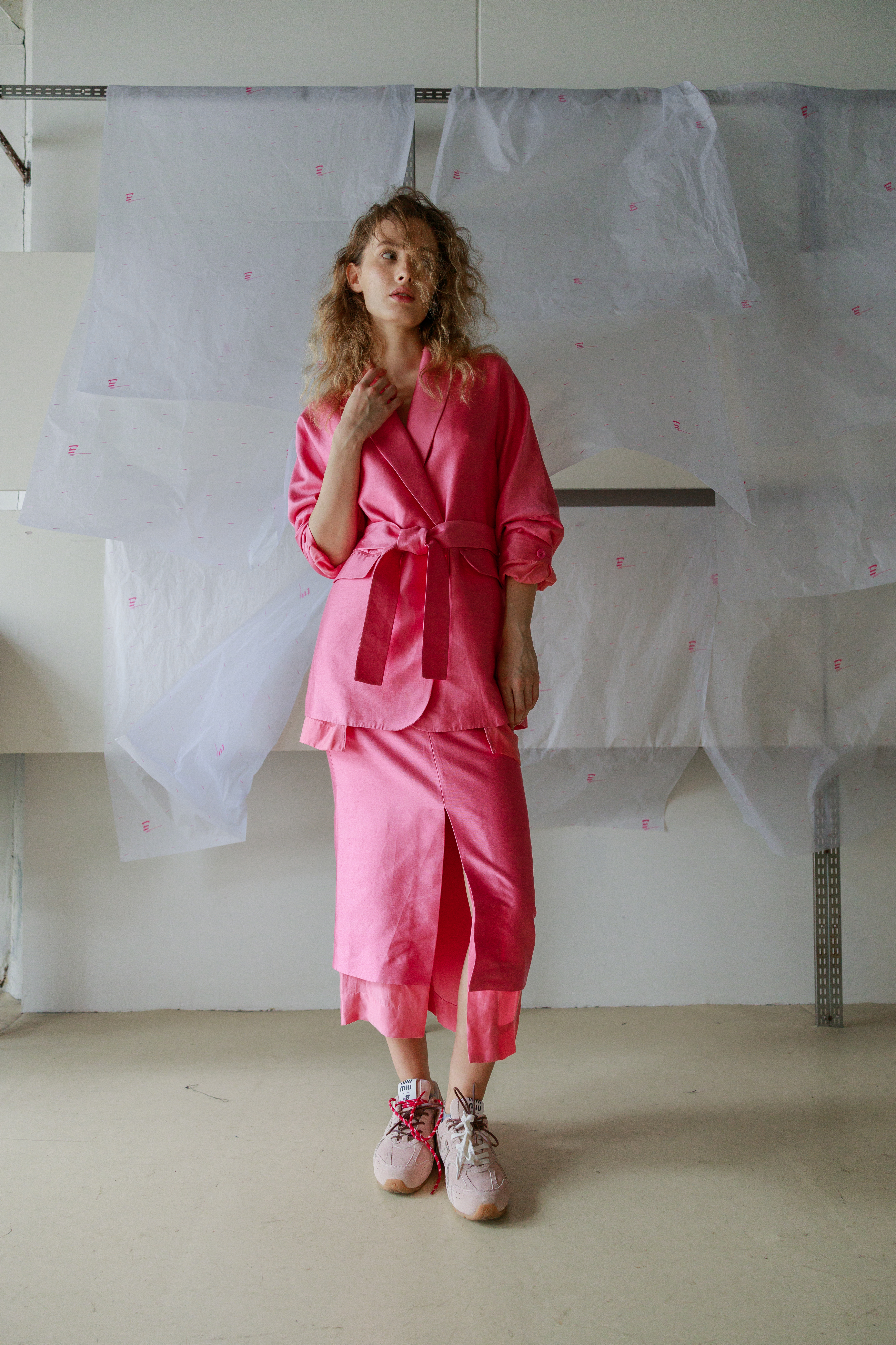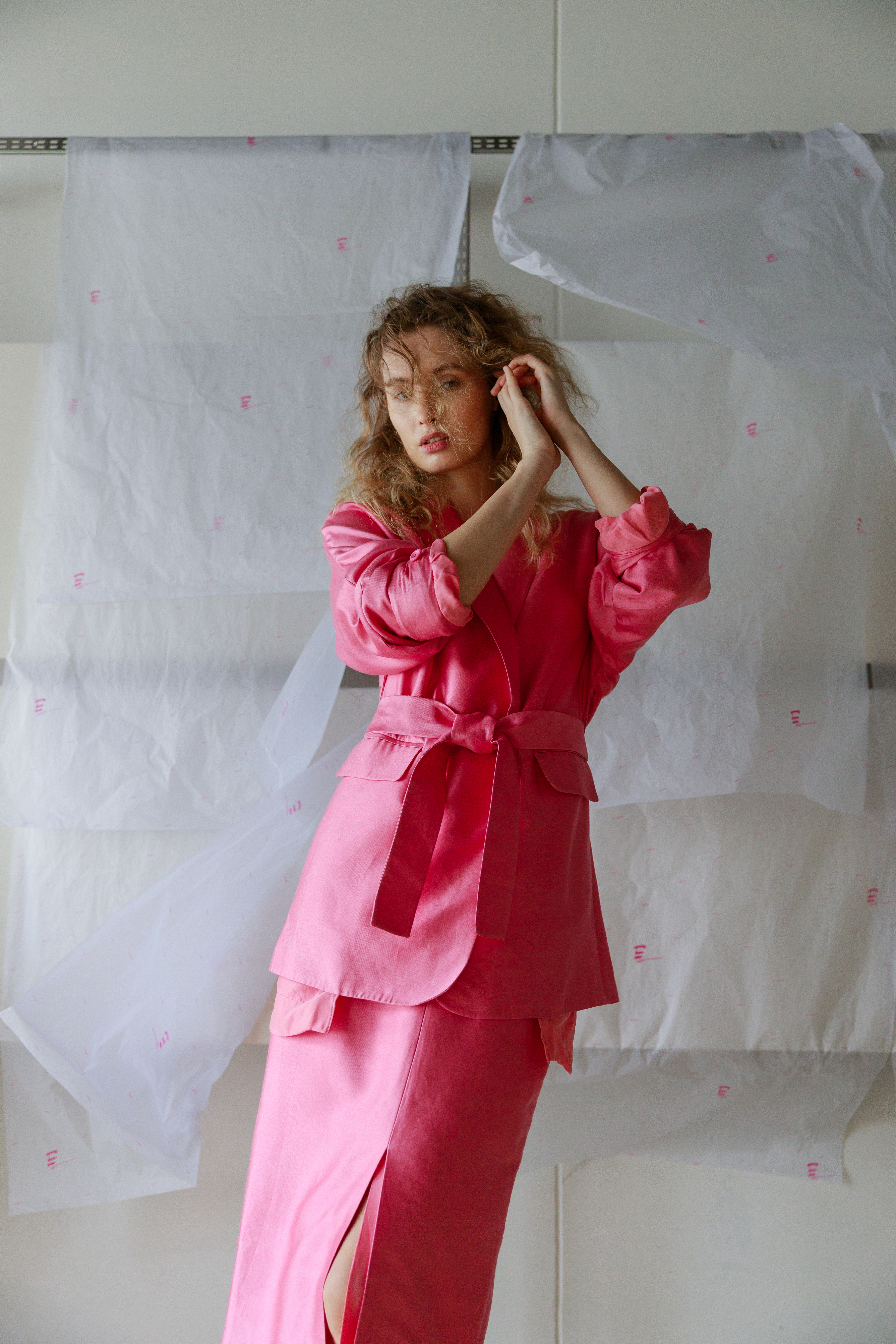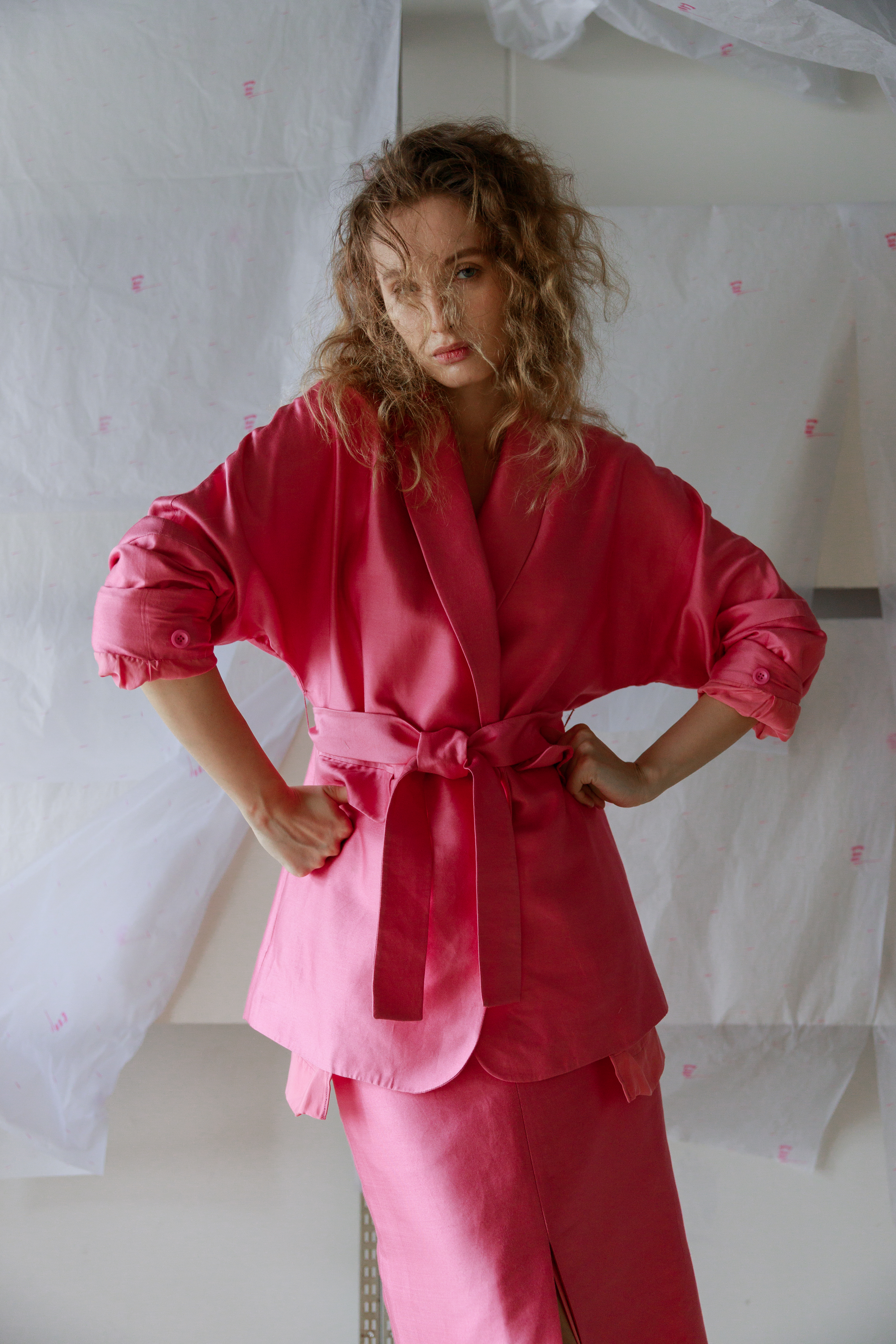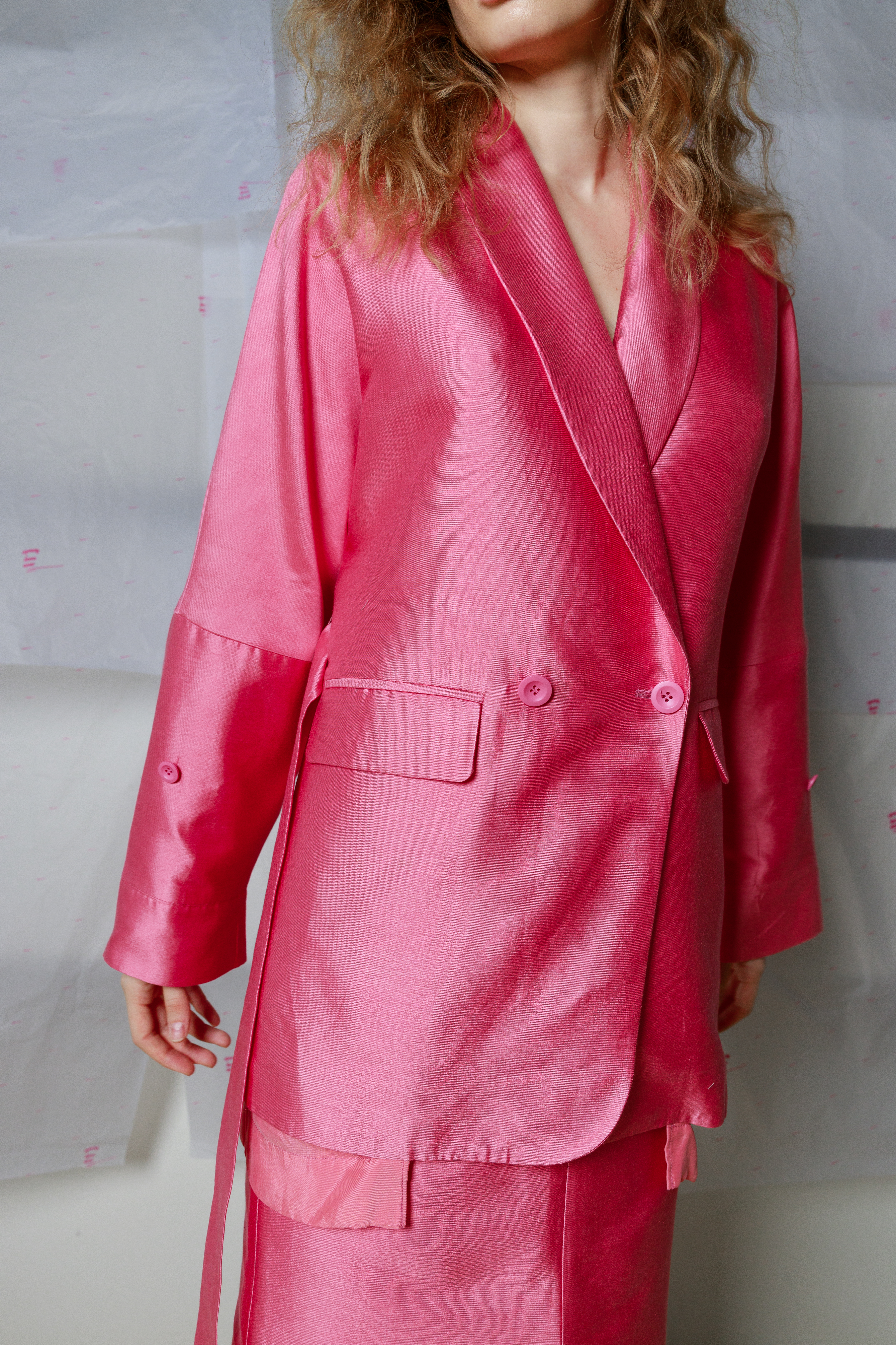 Жакет из натурального шелка и хлопка с нежным переливом - базовая вещь гардероба. Изделие отличается исключительной мягкостью и натуральным составом, обеспечивающим комфорт при носке. Функциональные детали включают два внешних кармана и рукава с застежкой на пуговицу, которые можно укоротить или подогнуть для изменения длины. Классический прямой крой и переливающаяся фактура ткани делают жакет универсальным элементом для создания разнообразных образов