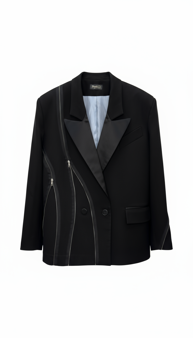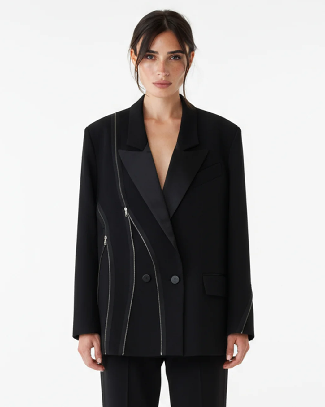 Жакет с атласными лацканами и молниями — элегантная и современная модель, которая объединяет классику и трендовые детали. Атласные лацканы добавляют блеска и утончённости, а молнии создают смелый акцент и подчёркивают индивидуальность. Отличный выбор для офисного стиля и вечерних выходов.