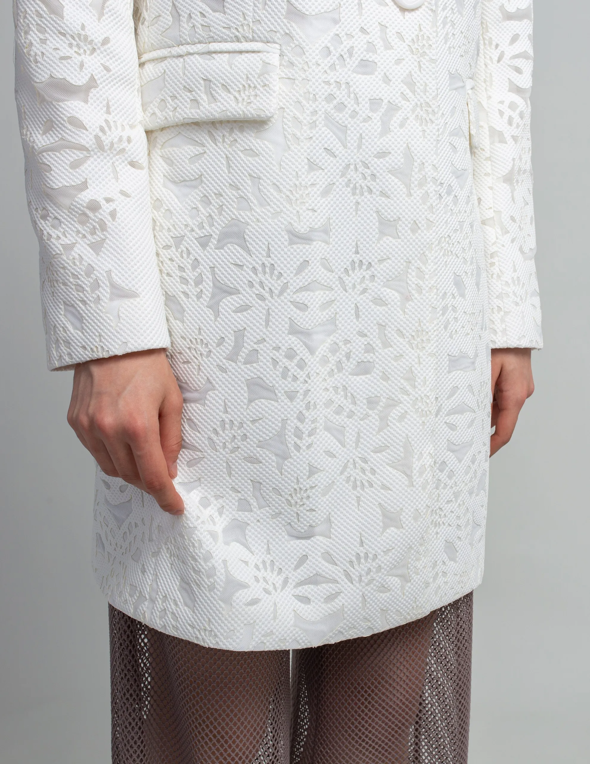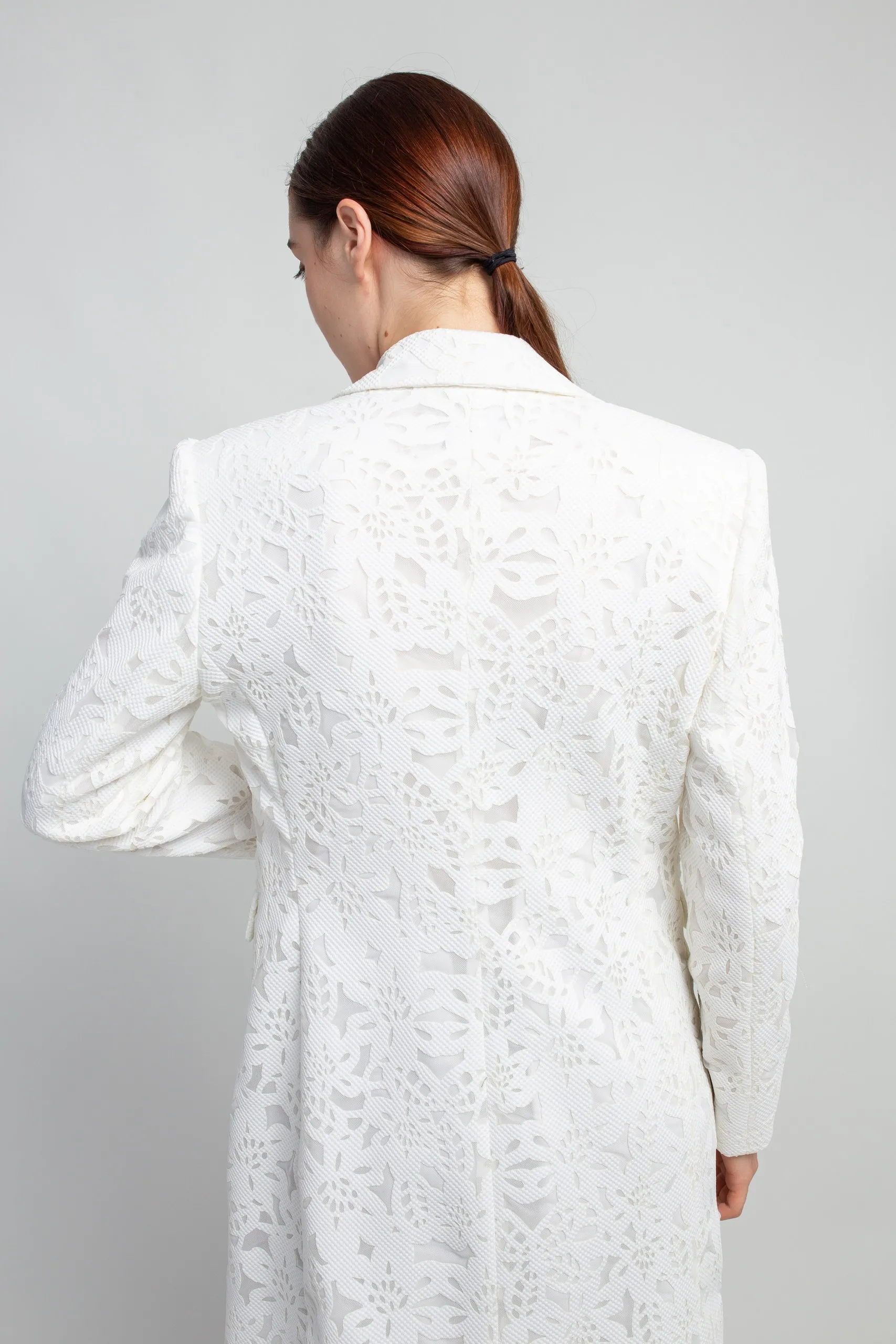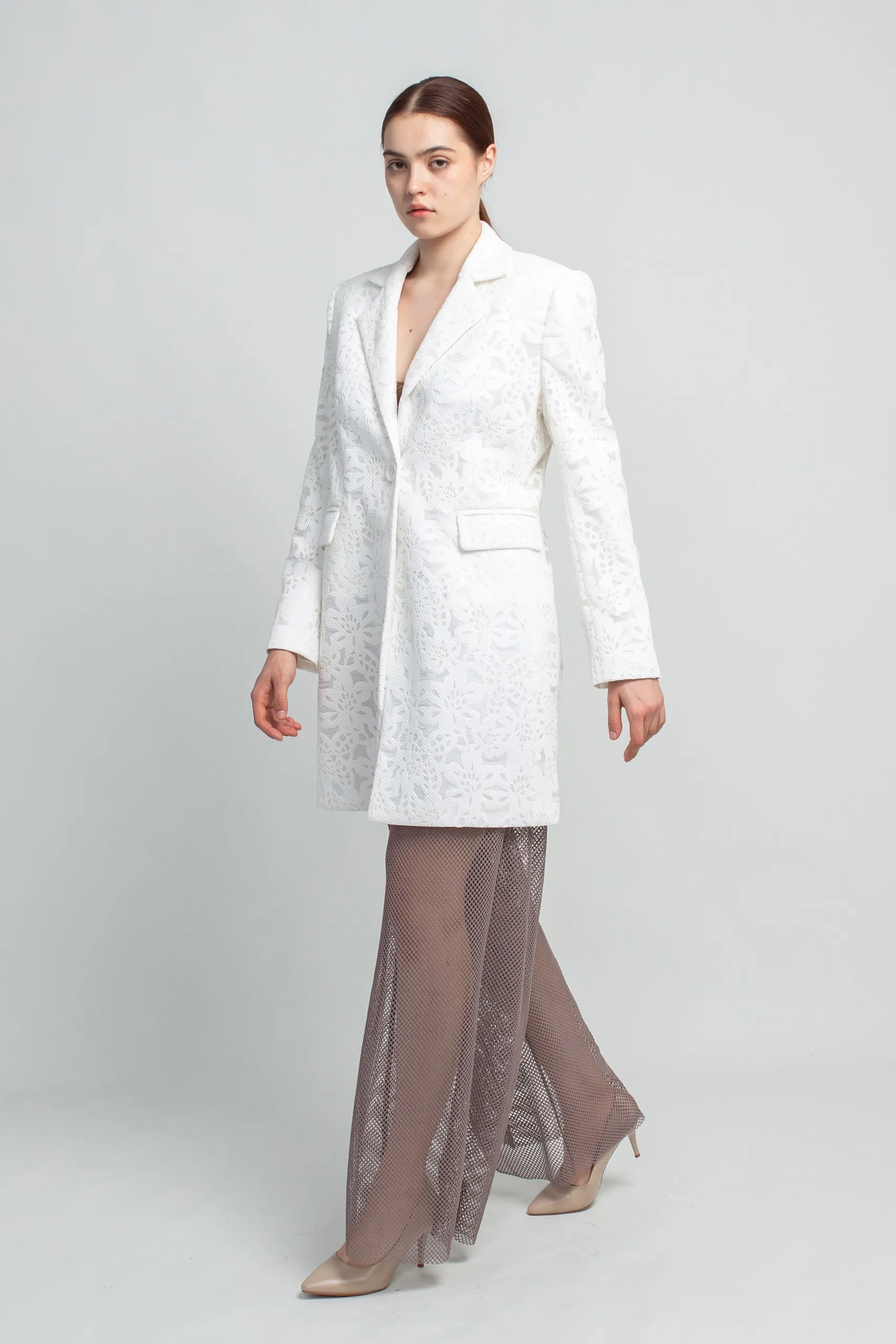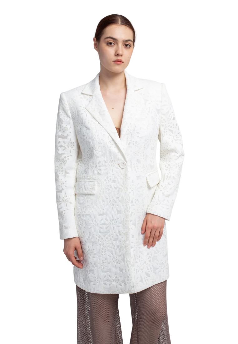 Однобортный жакет классического полуприталенного силуэта на одной пуговице. Выполнен из ткани с тисненым ажурным принтом. Четкая линия плеч, длинный рукав. Удлиненный фасон, ниже середины бедра. По бокам расположены два скрытых кармана.