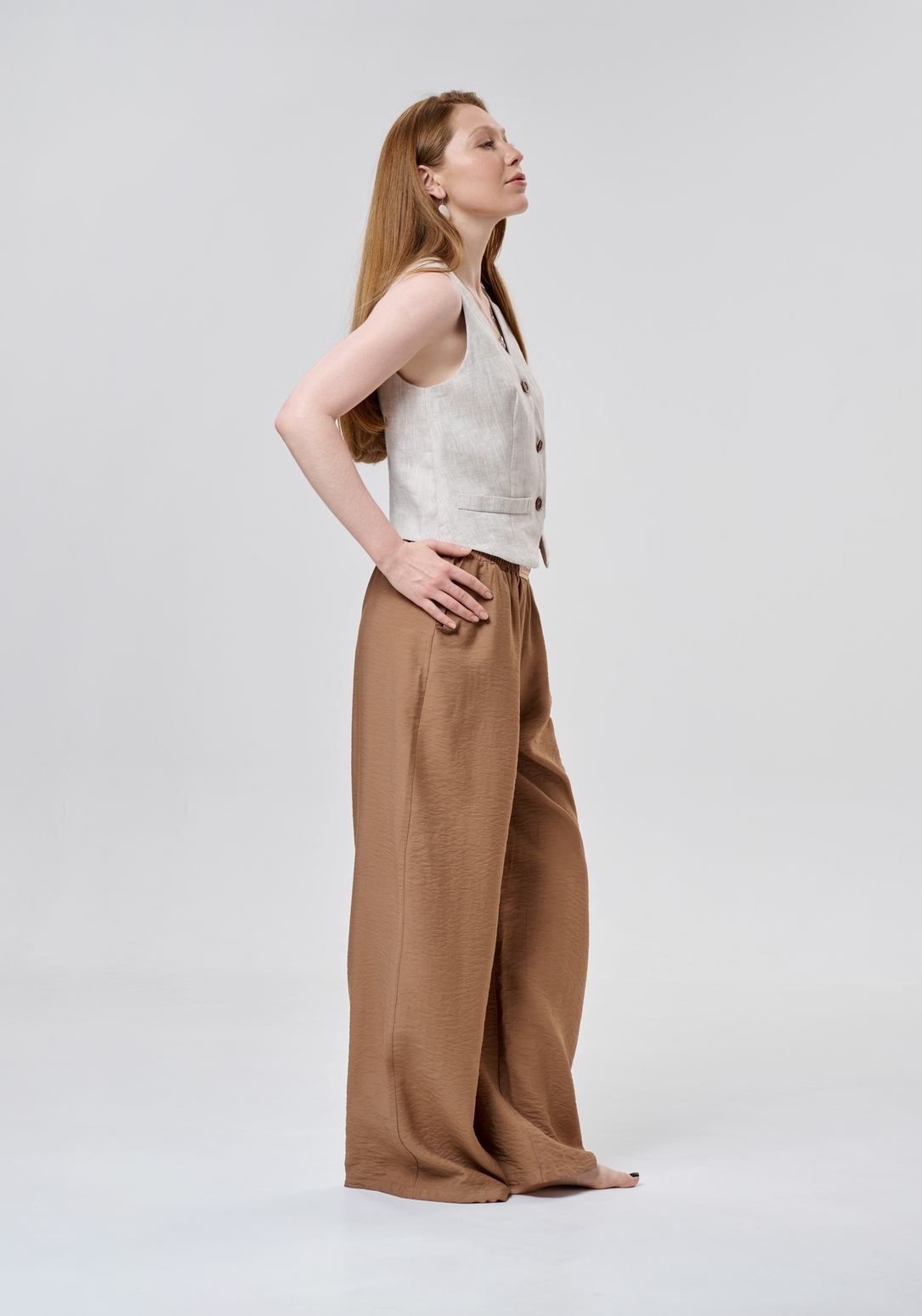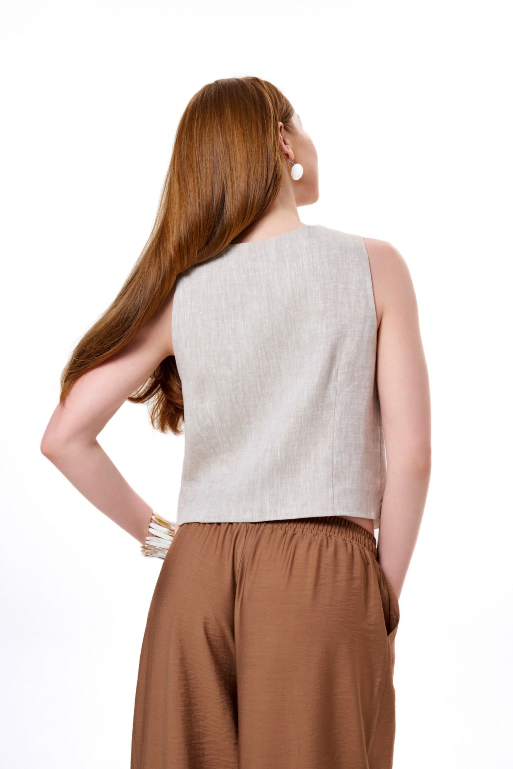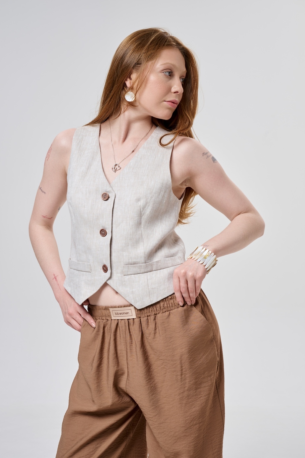 Жилет классического кроя — выполнен из плотной натуральной ткани фактурной ткани. Благодаря выточкам изделие красиво садится по фигуре, а спокойные нейтральные оттенки легко сочетаются как с повседневными образами, так и с более строгими комплектами. Универсальный вариант для базового гардероба.