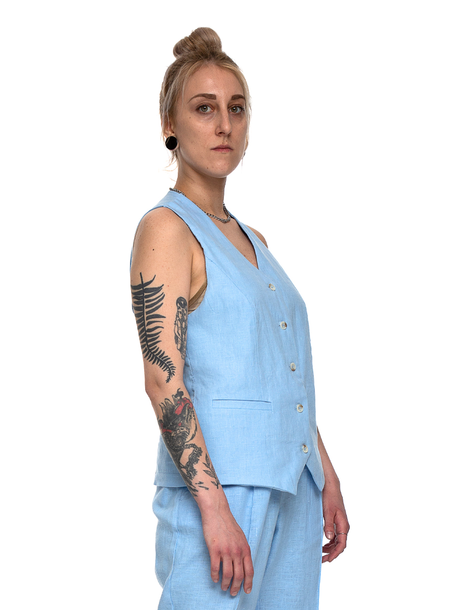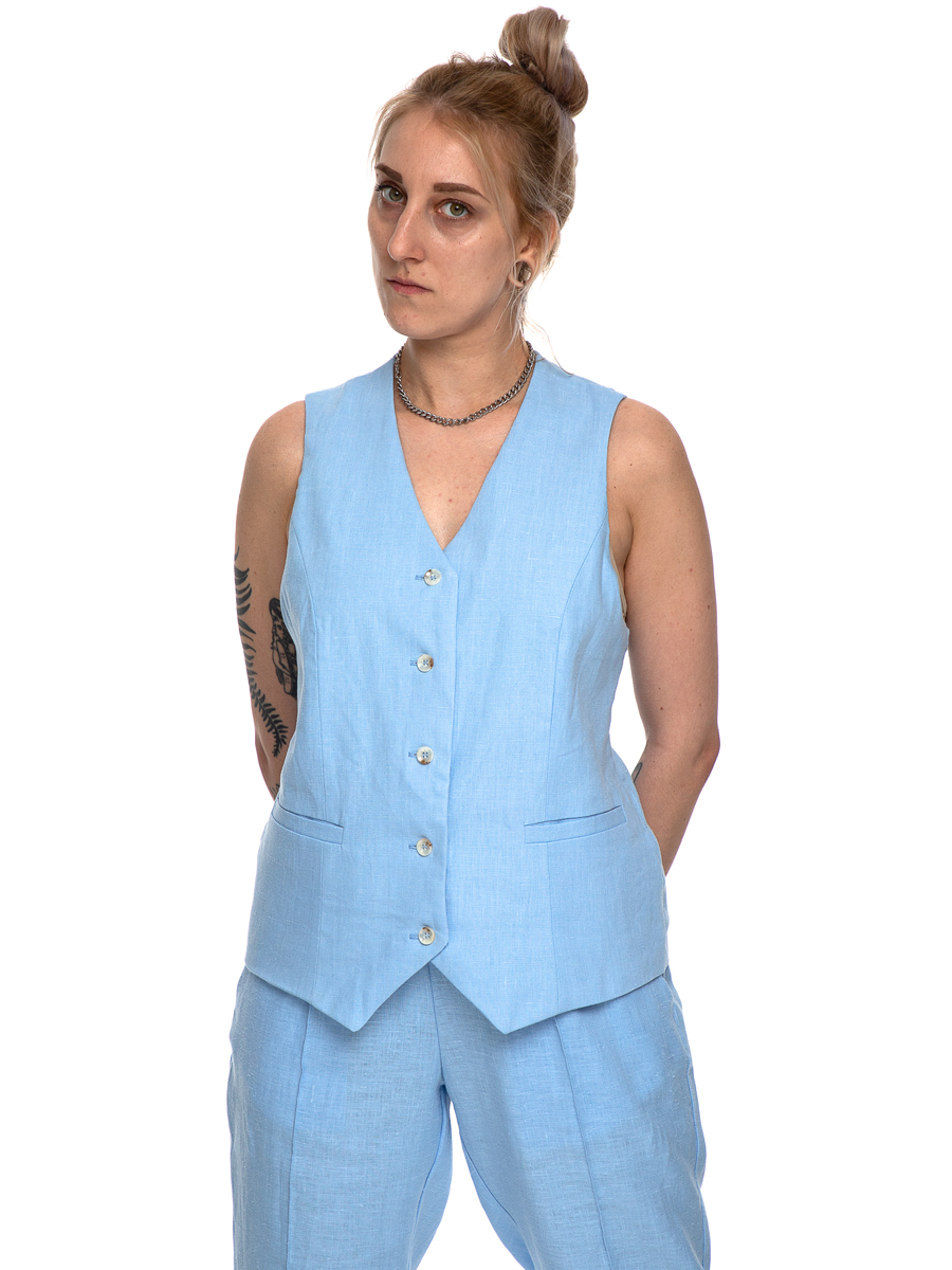 Жилет женский без подкладки, среднего объема, с двумя карманами с листочкой, с застежкой на пуговицы.