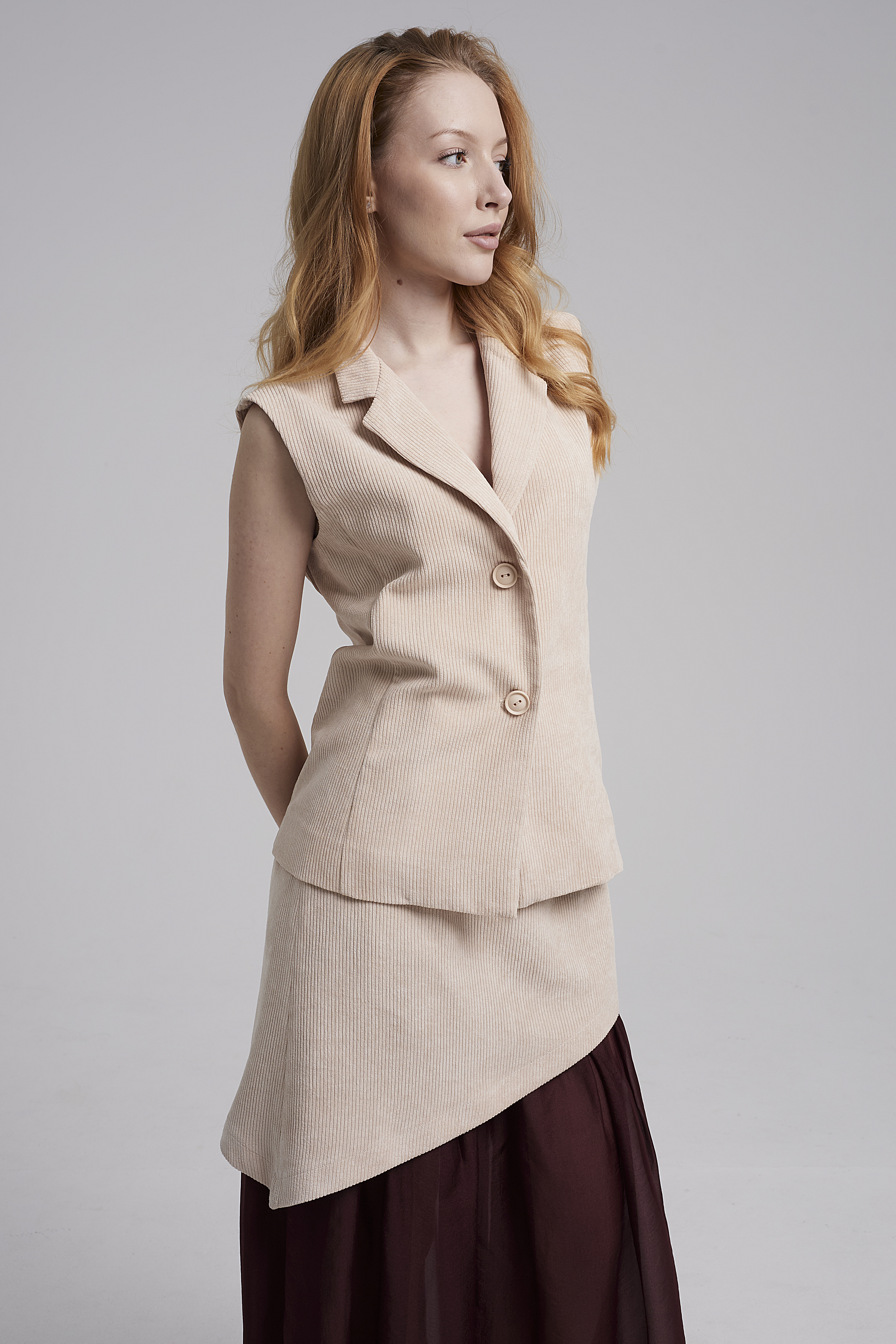 Жилет с лацканами в молочном оттенке, мягкая фактура, чёткий крой.