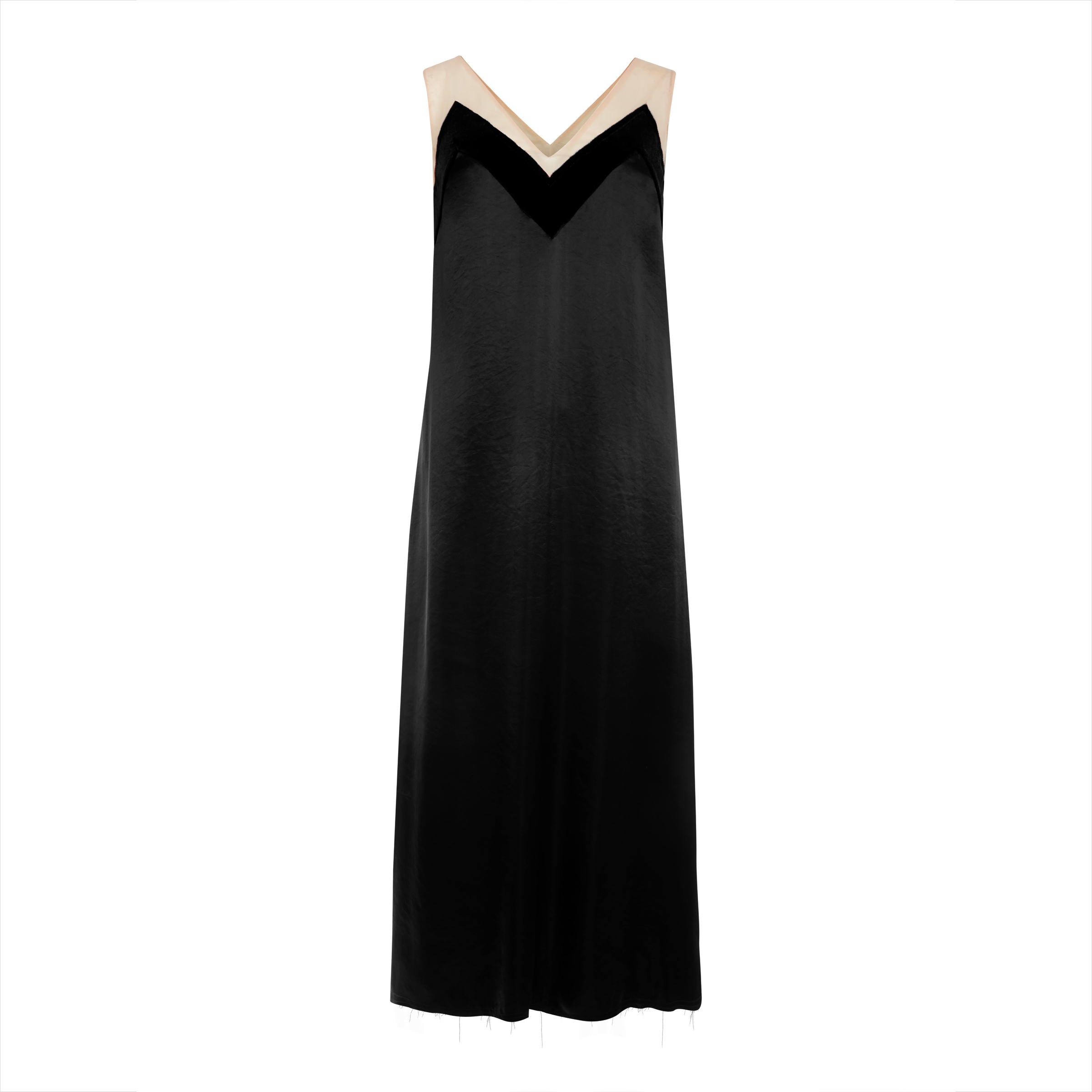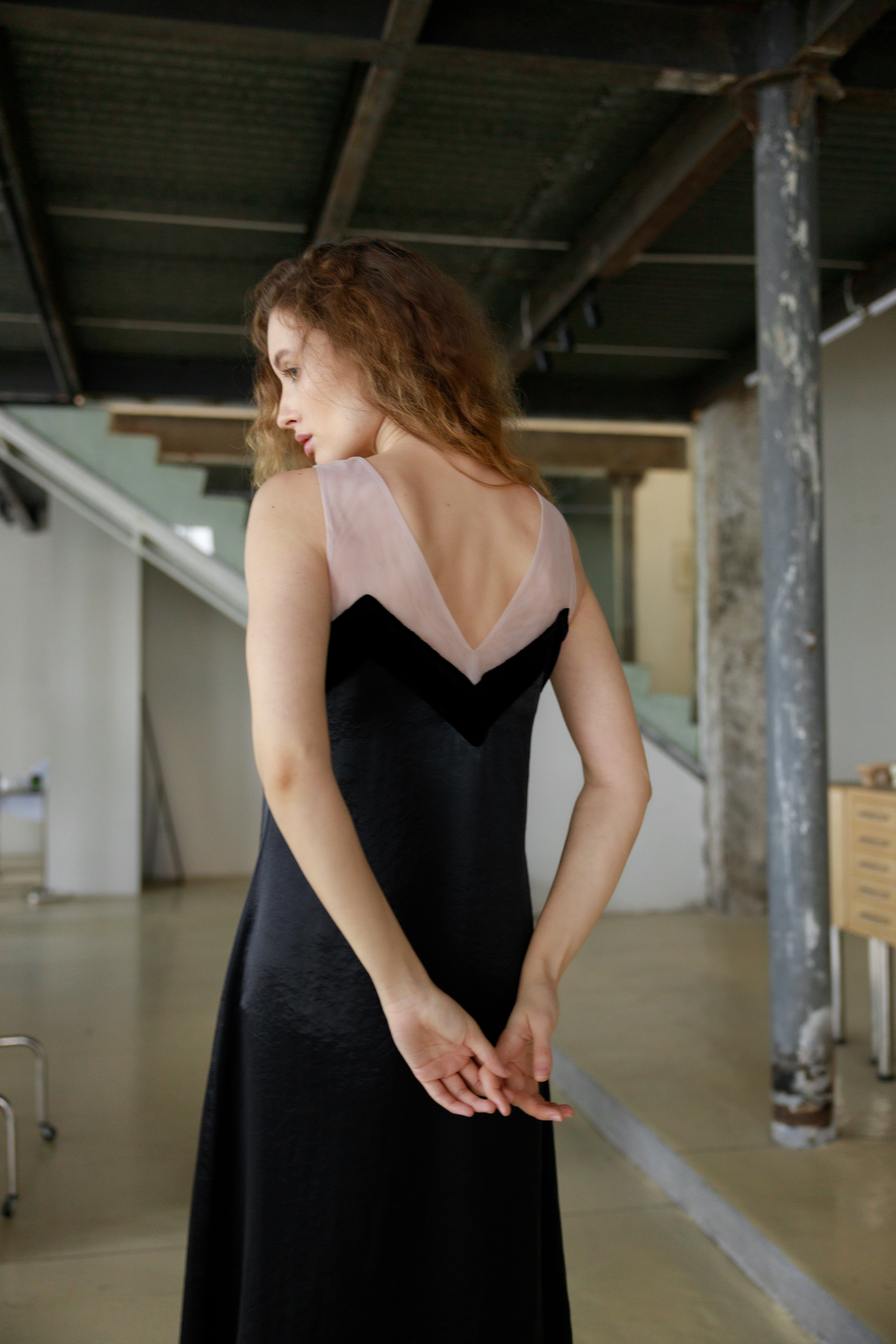 Платье свободного кроя из струящихся тканей. Открытая спинка добавляет образу элегантность. Фасон акцентирует плечи, создавая строгий силуэт. Изделие отличается мягкостью, легкостью и нежным блеском