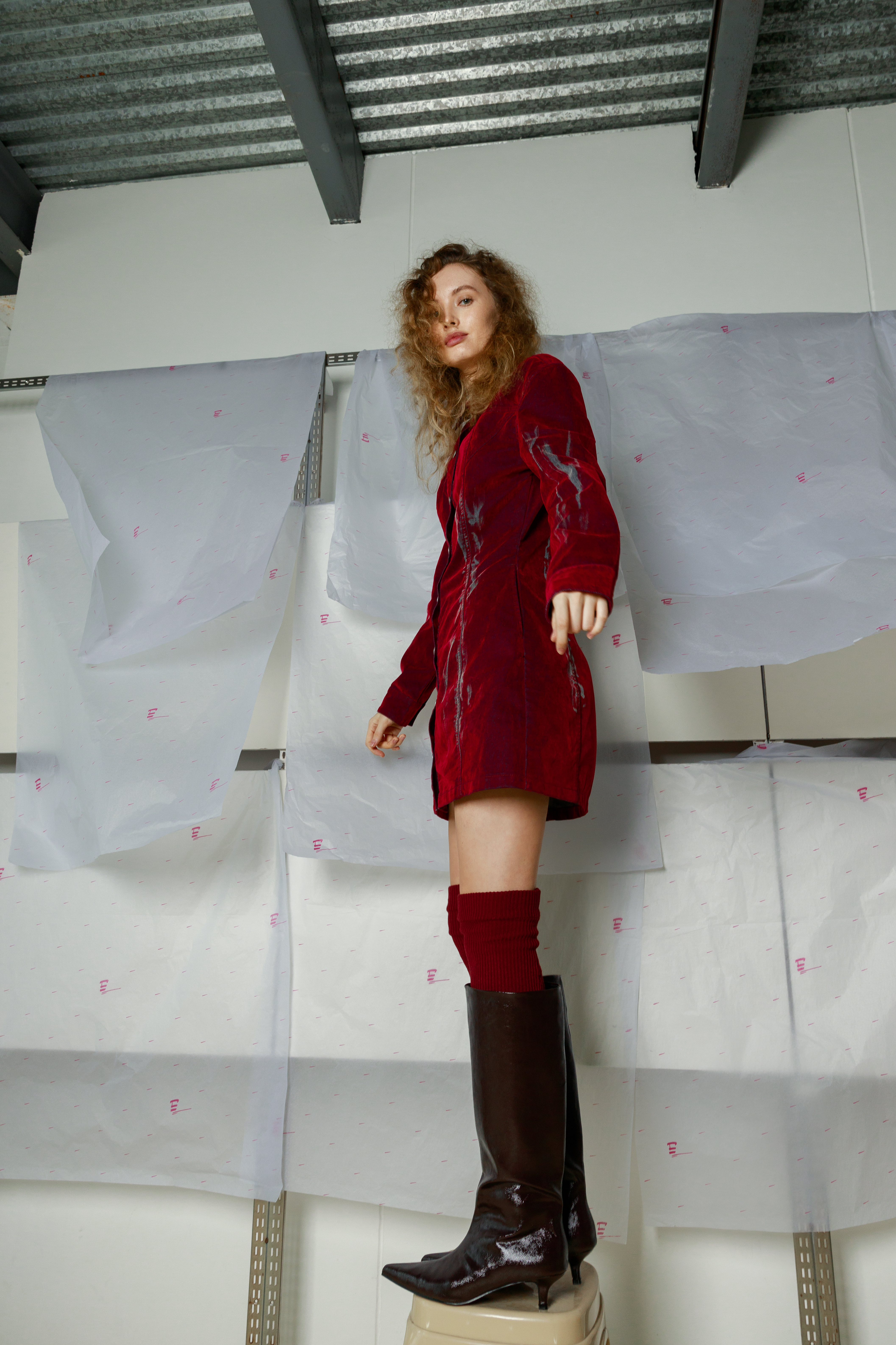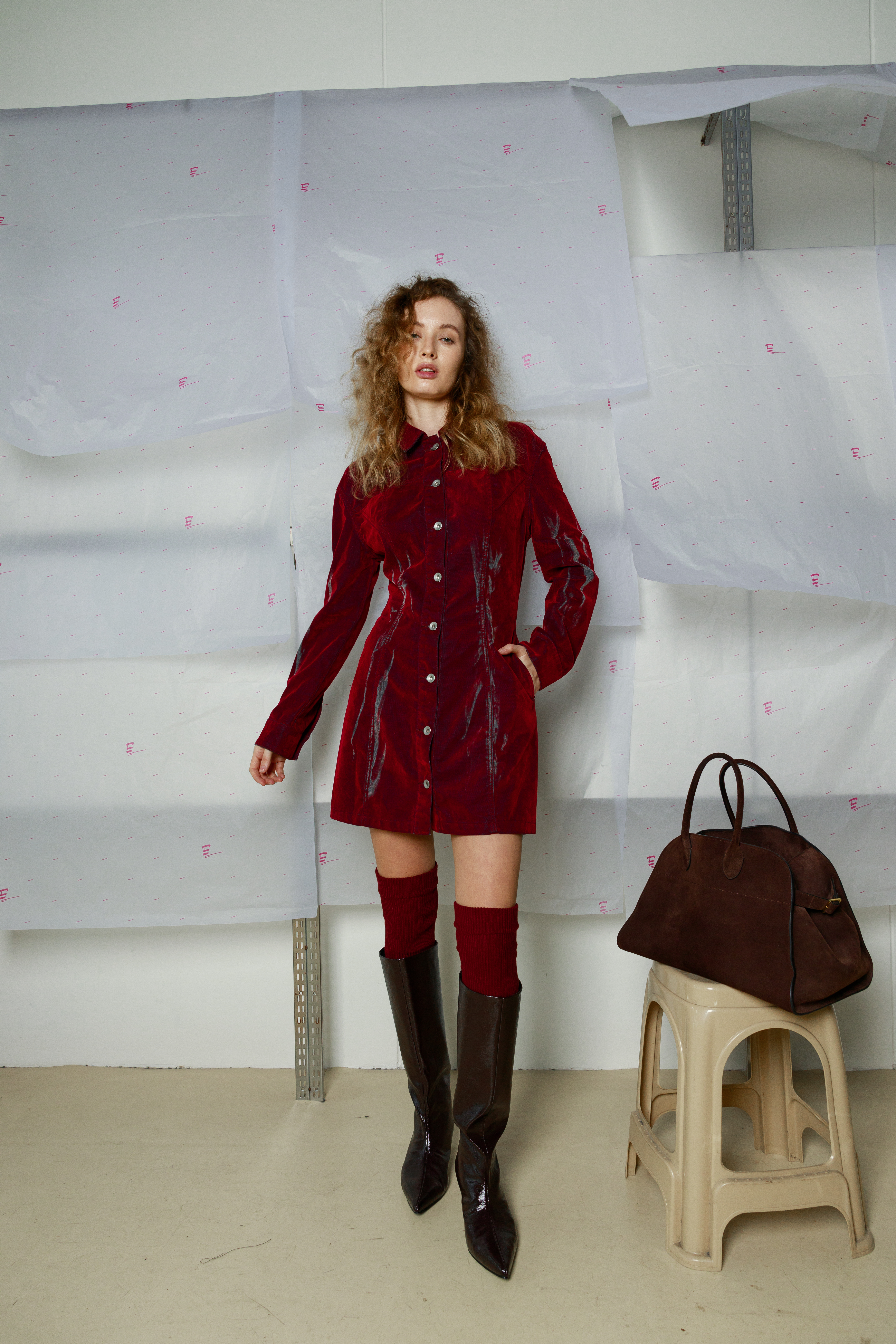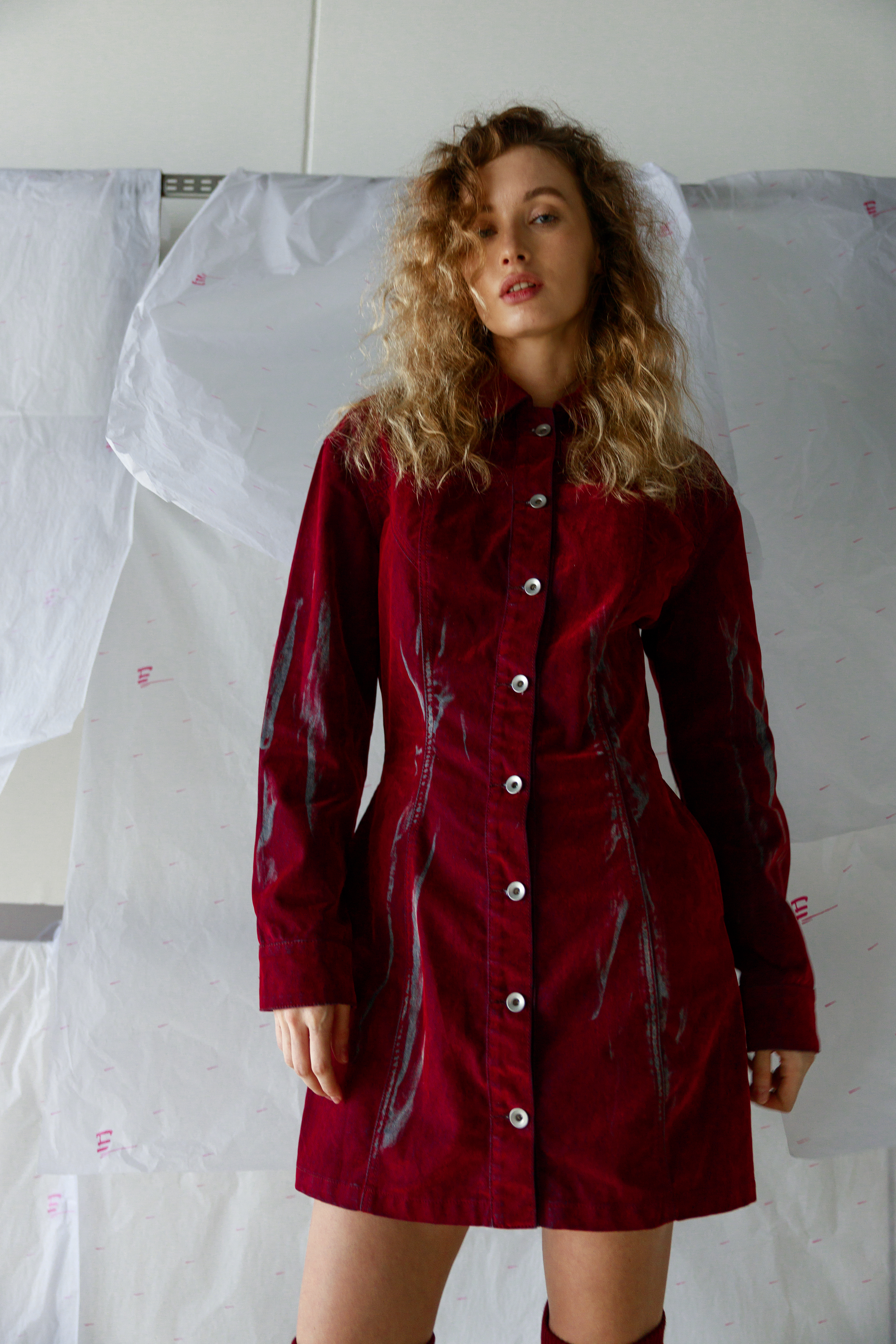 Приталенное мини-платье из велюра с длинными рукавами и дизайнерским принтом. Платье выполнено в глубоком оттенке, который меняет тон в зависимости от освещения - от насыщенного бордового до яркого красно-малинового. Застежка на пуговицы по всей длине позволяет регулировать степень открытости, создавая разные образы - от строгого до более смелого. Удлиненные рукава и лаконичный силуэт подчеркивают изящество формы. Бархатистая ткань придает образу благородную текстуру и ощущение комфорта