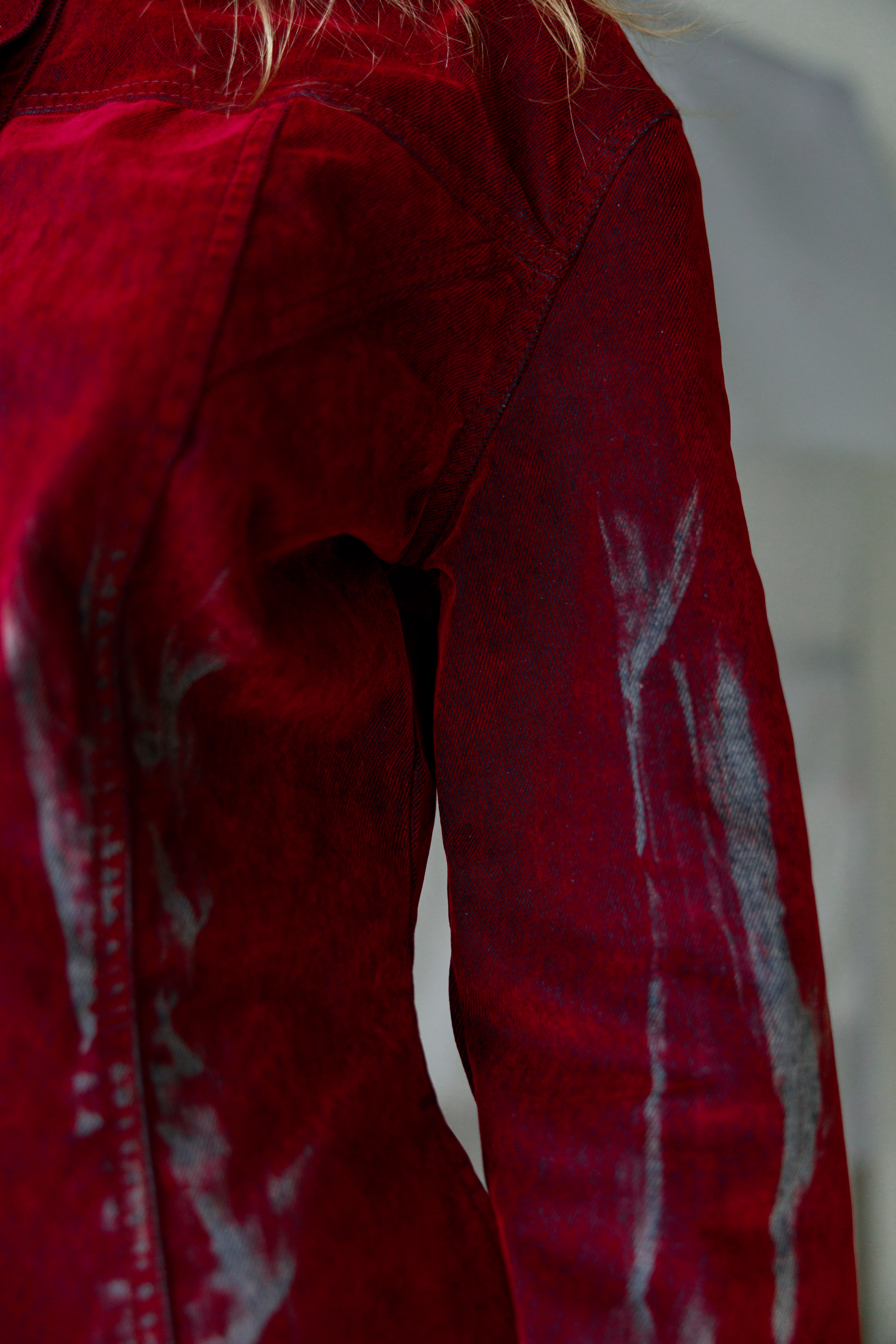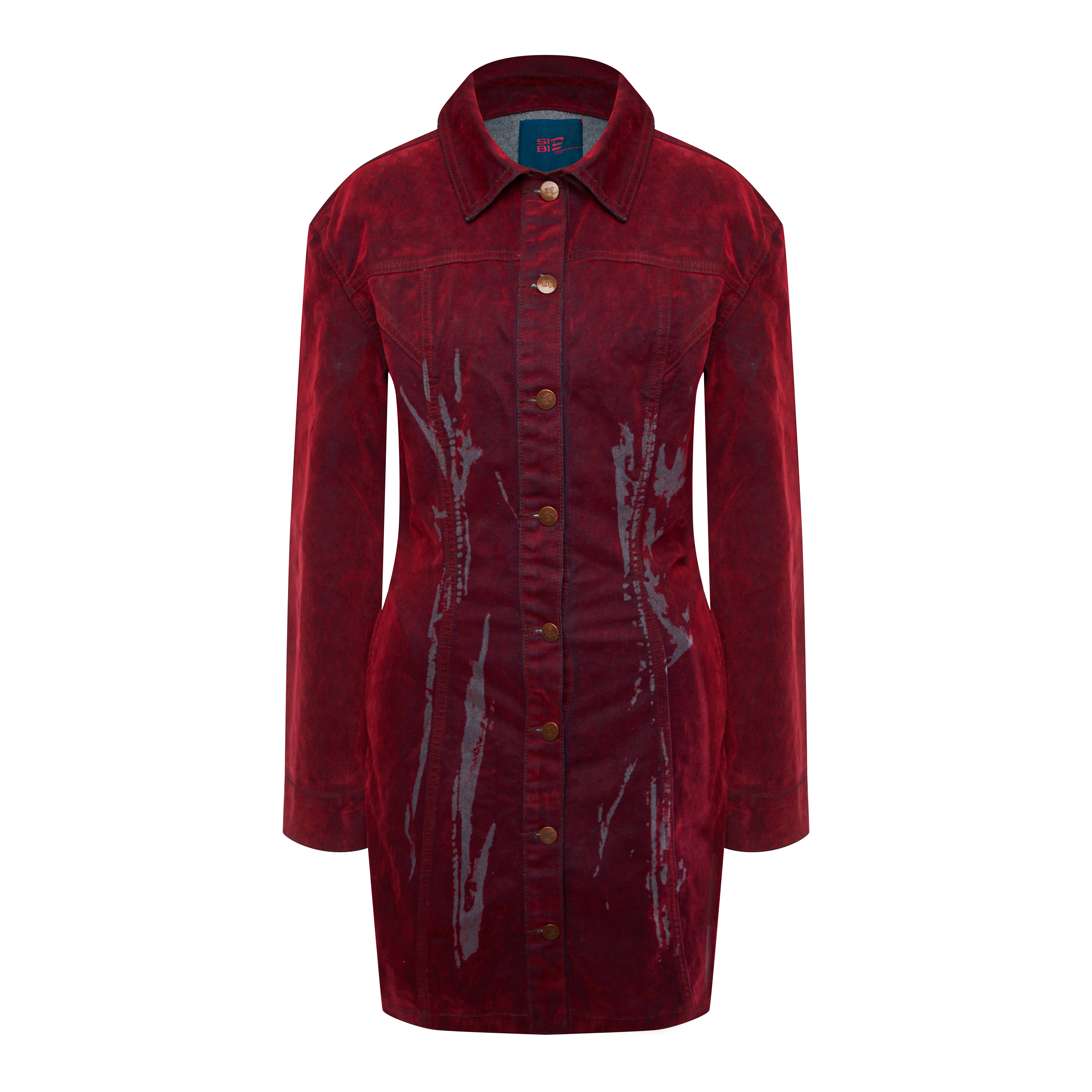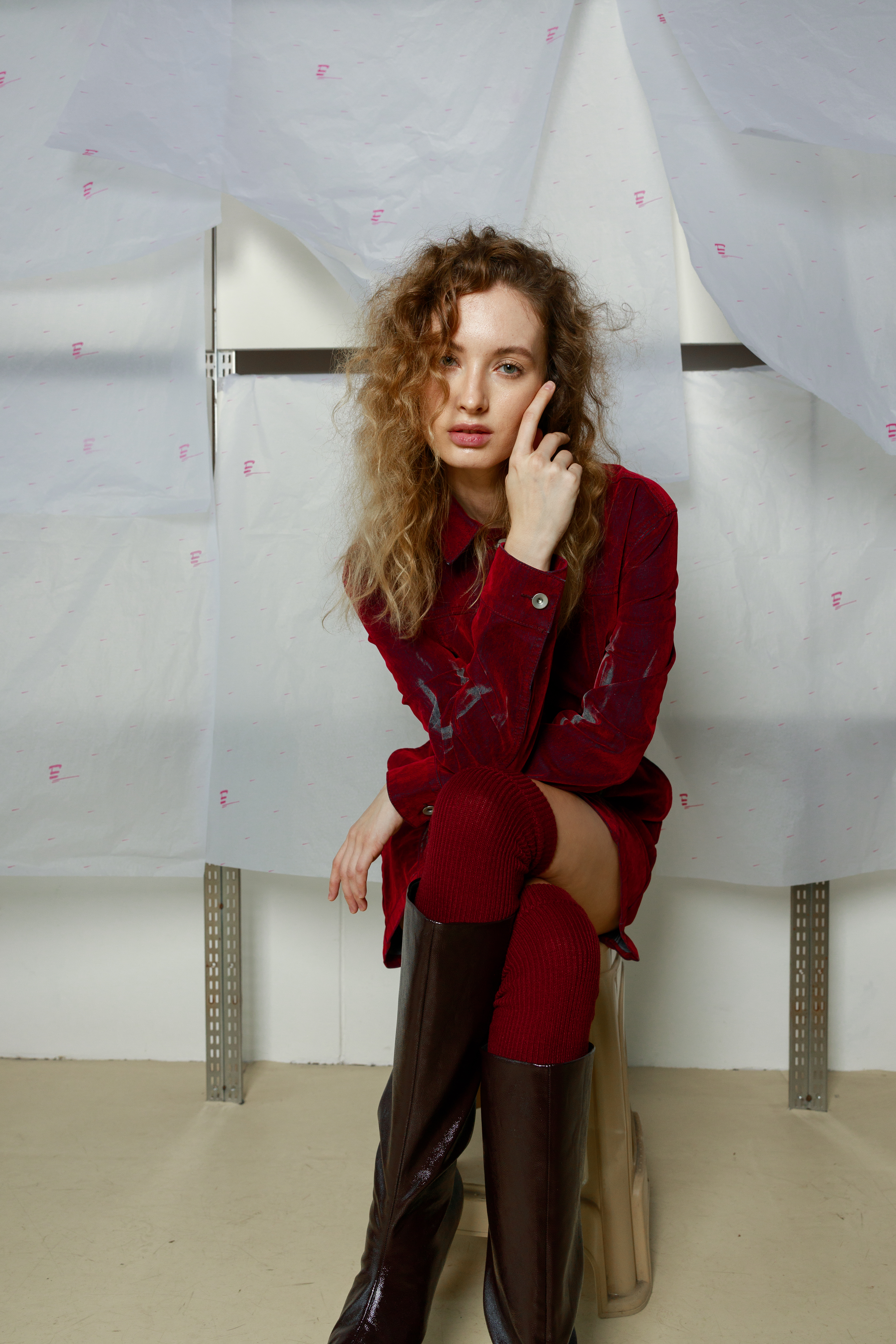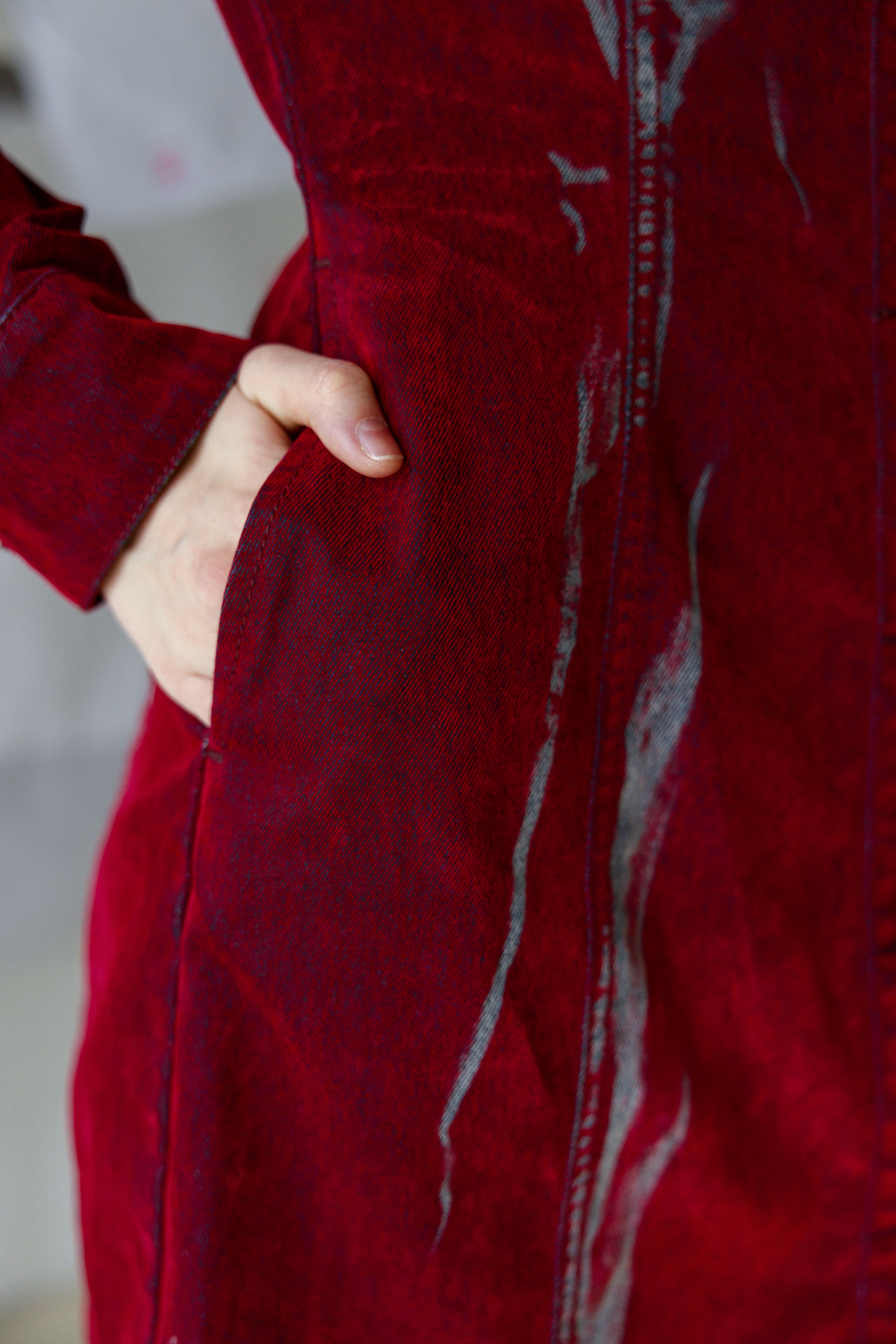 Приталенное мини-платье из велюра с длинными рукавами и дизайнерским принтом. Платье выполнено в глубоком оттенке, который меняет тон в зависимости от освещения - от насыщенного бордового до яркого красно-малинового. Застежка на пуговицы по всей длине позволяет регулировать степень открытости, создавая разные образы - от строгого до более смелого. Удлиненные рукава и лаконичный силуэт подчеркивают изящество формы. Бархатистая ткань придает образу благородную текстуру и ощущение комфорта