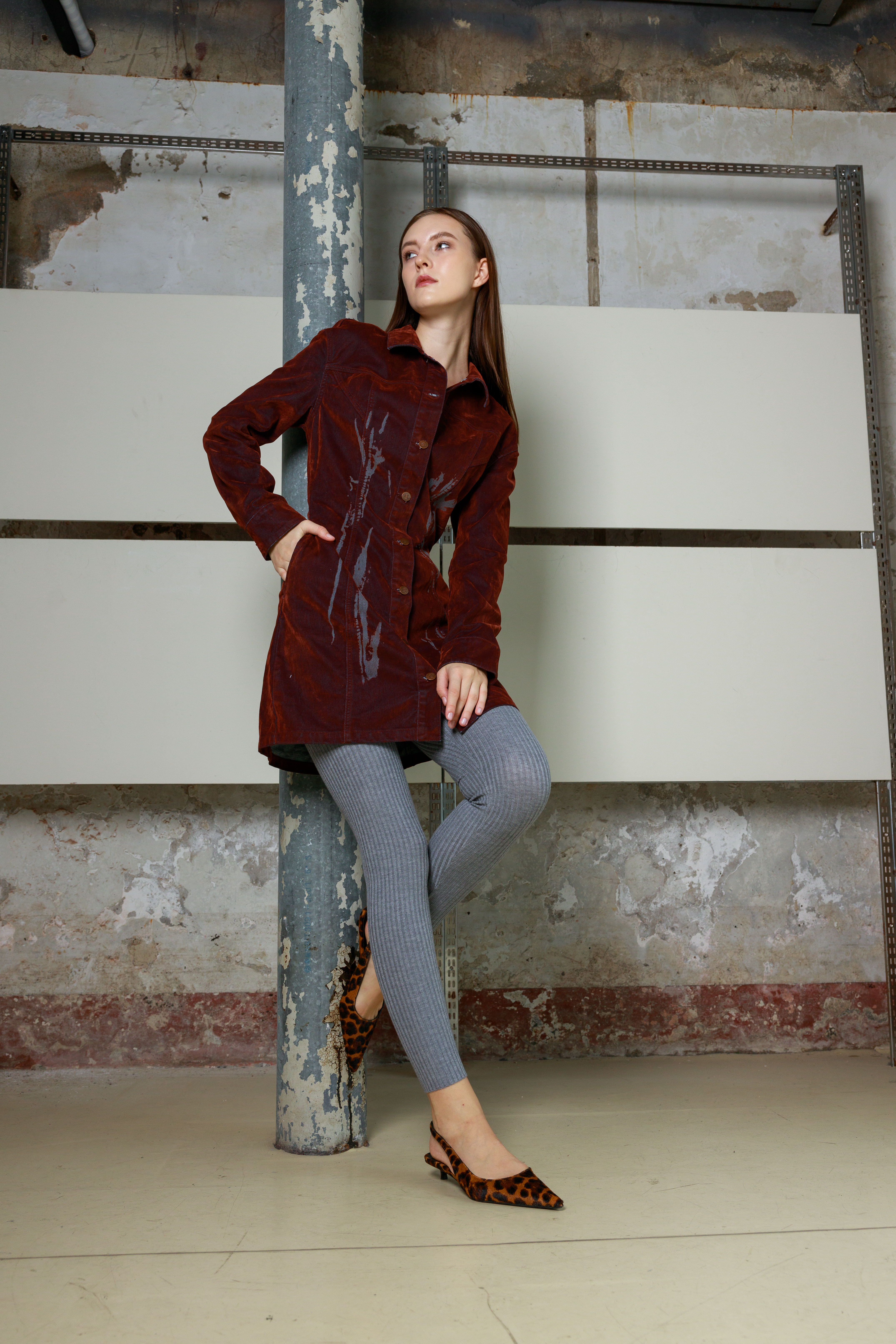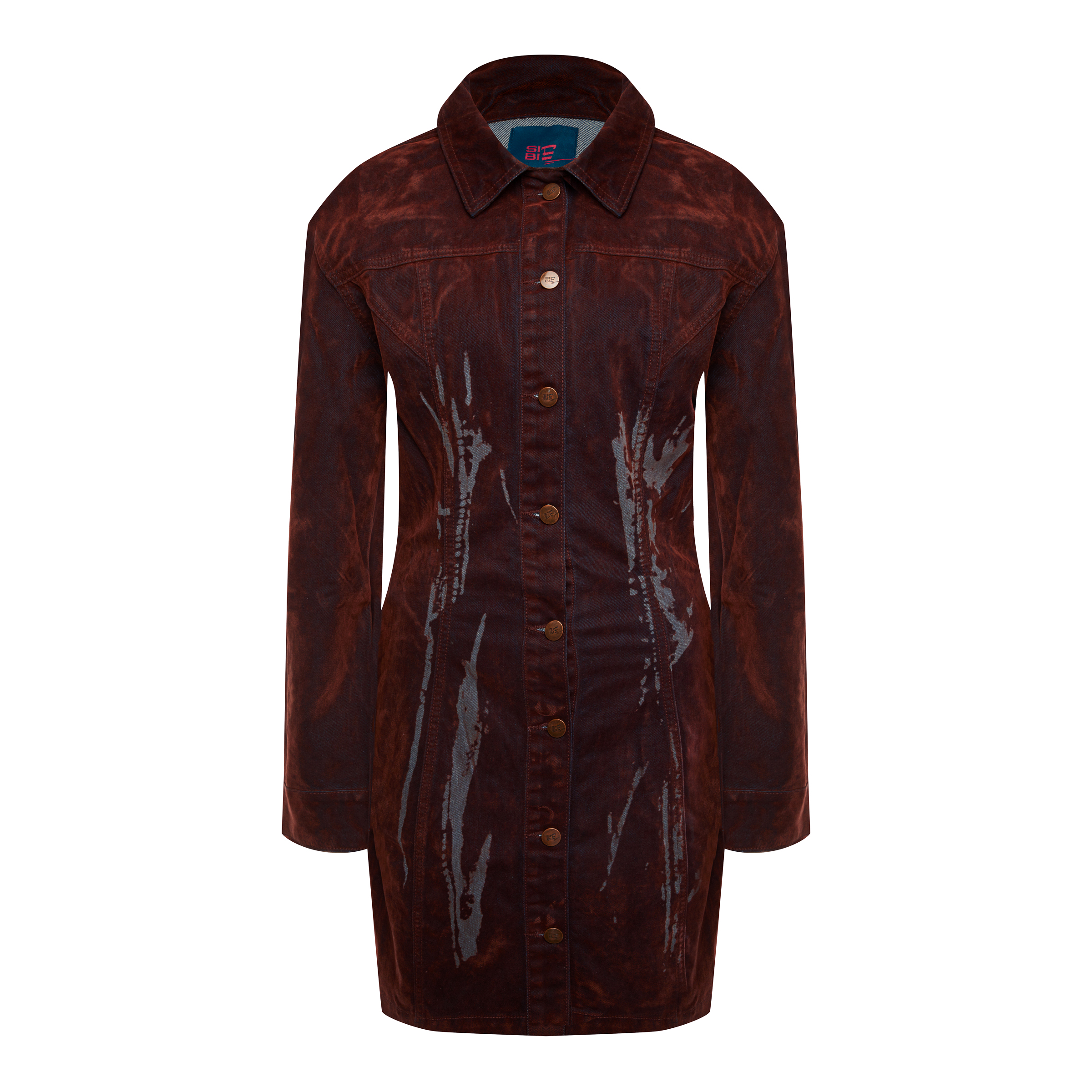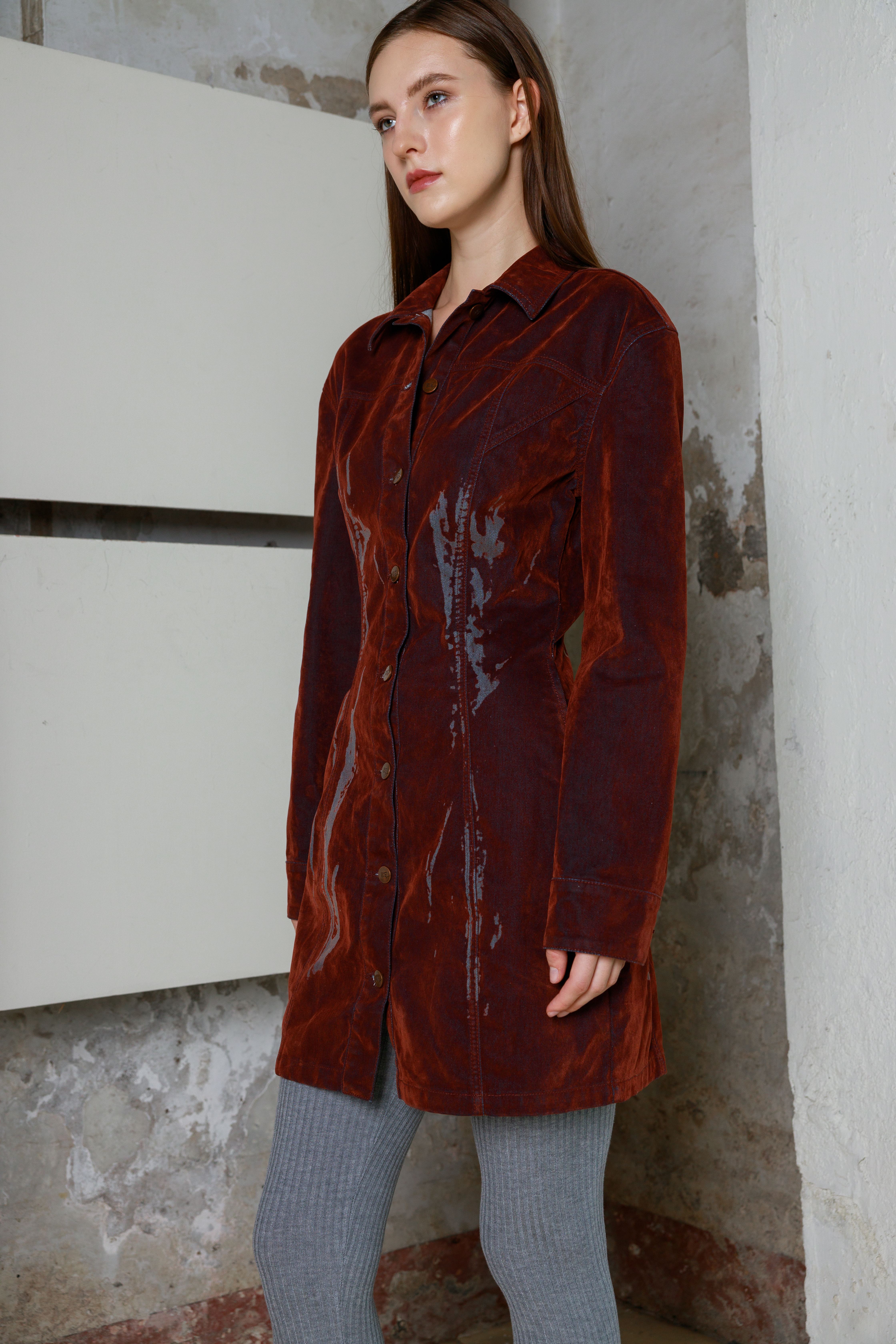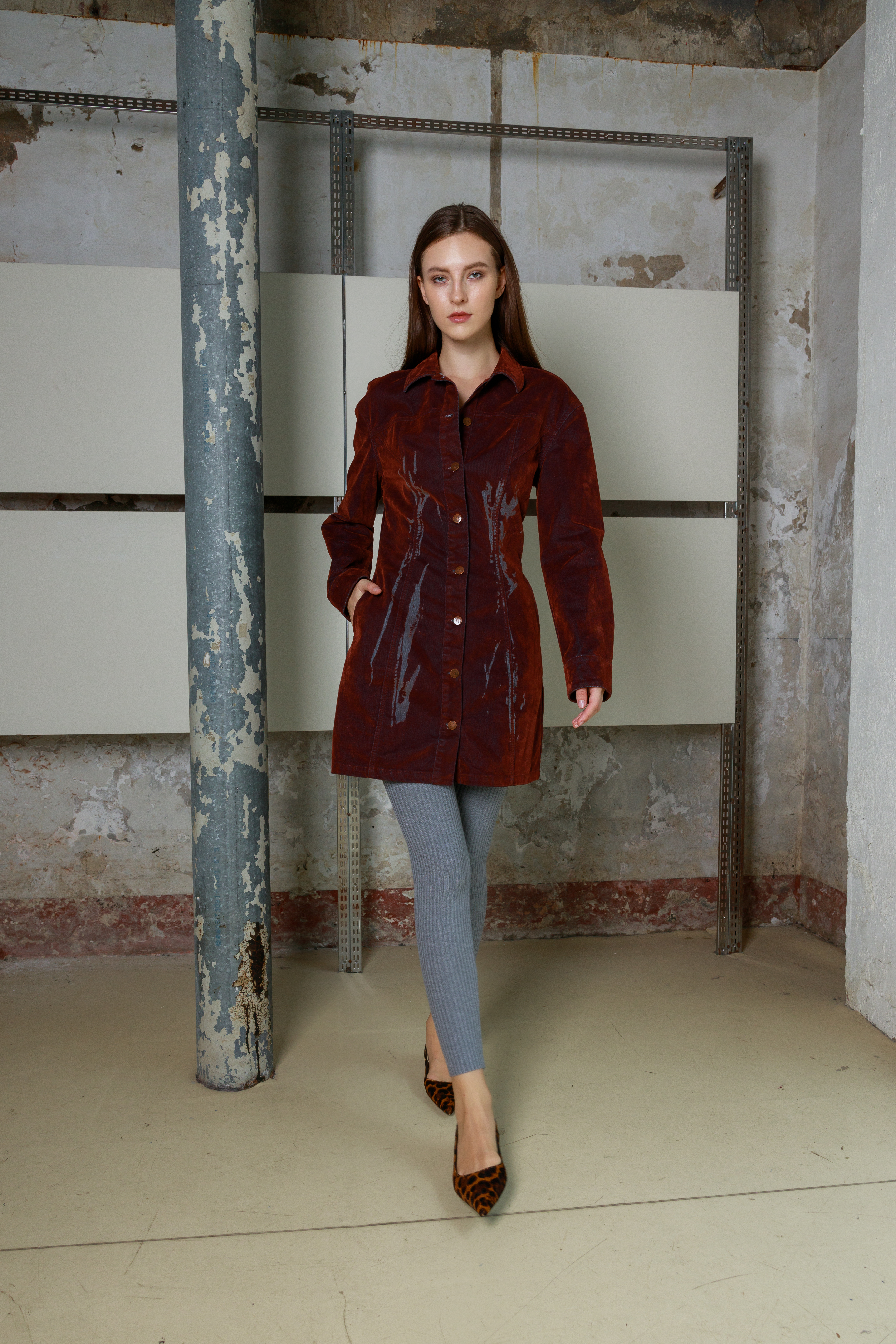 Приталенное мини-платье из велюра с длинными рукавами и дизайнерским принтом. Платье выполнено в глубоком оттенке, который меняет тон в зависимости от освещения - от насыщенного от коричневого до «красного дерева». Застежка на пуговицы по всей длине позволяет регулировать степень открытости, создавая разные образы - от строгого до более смелого. Удлиненные рукава и лаконичный силуэт подчеркивают изящество формы. Бархатистая ткань придает образу благородную текстуру и ощущение комфорта