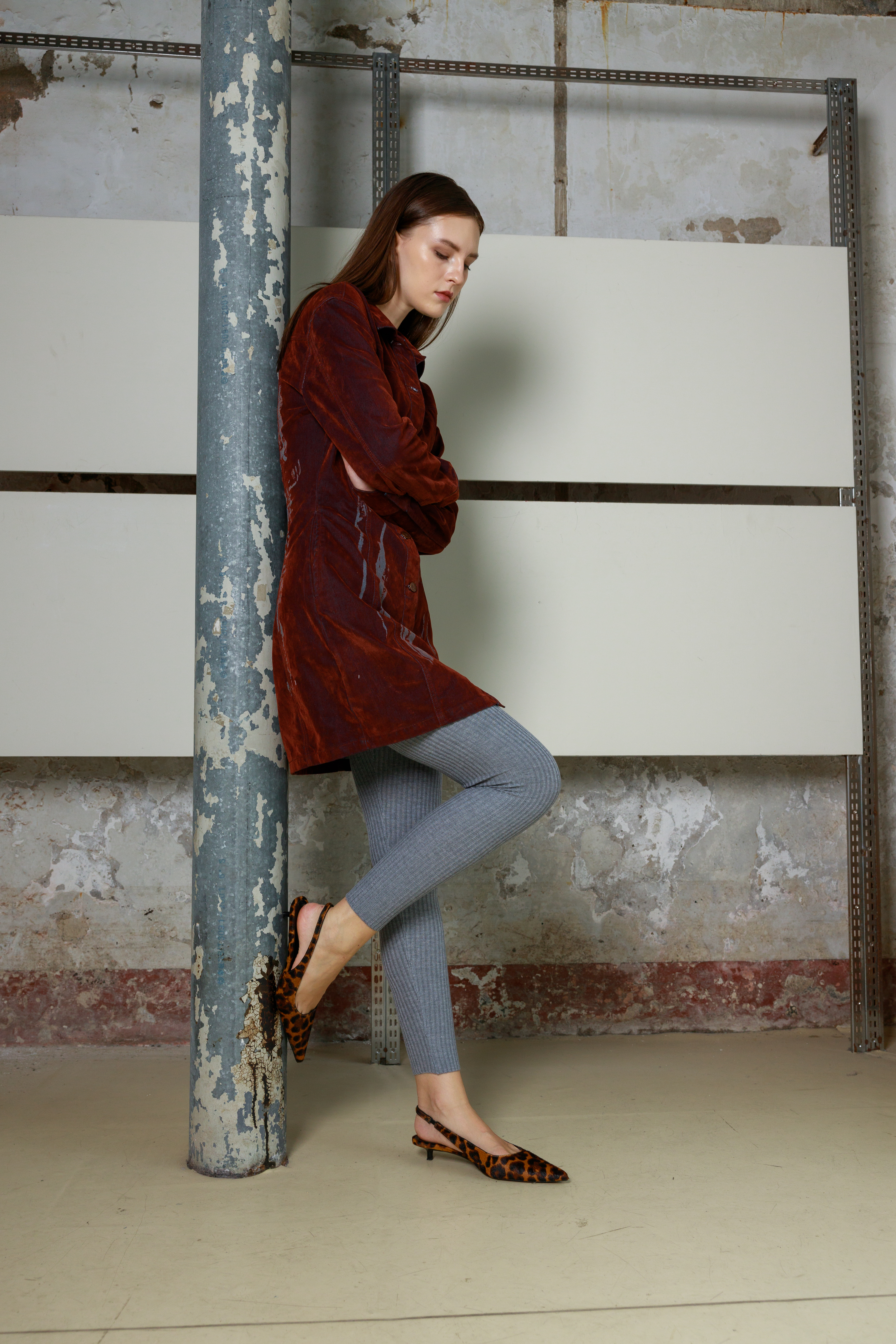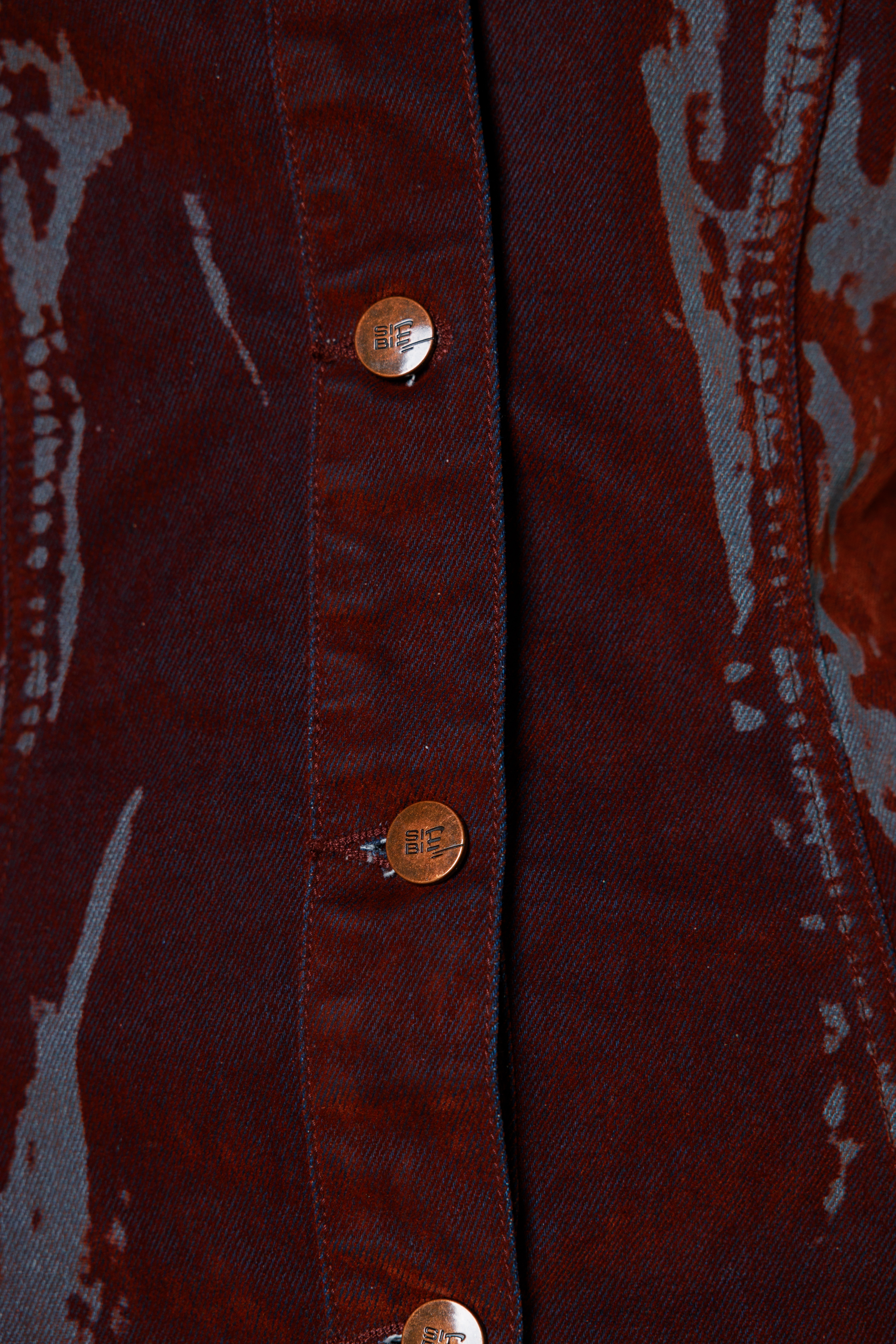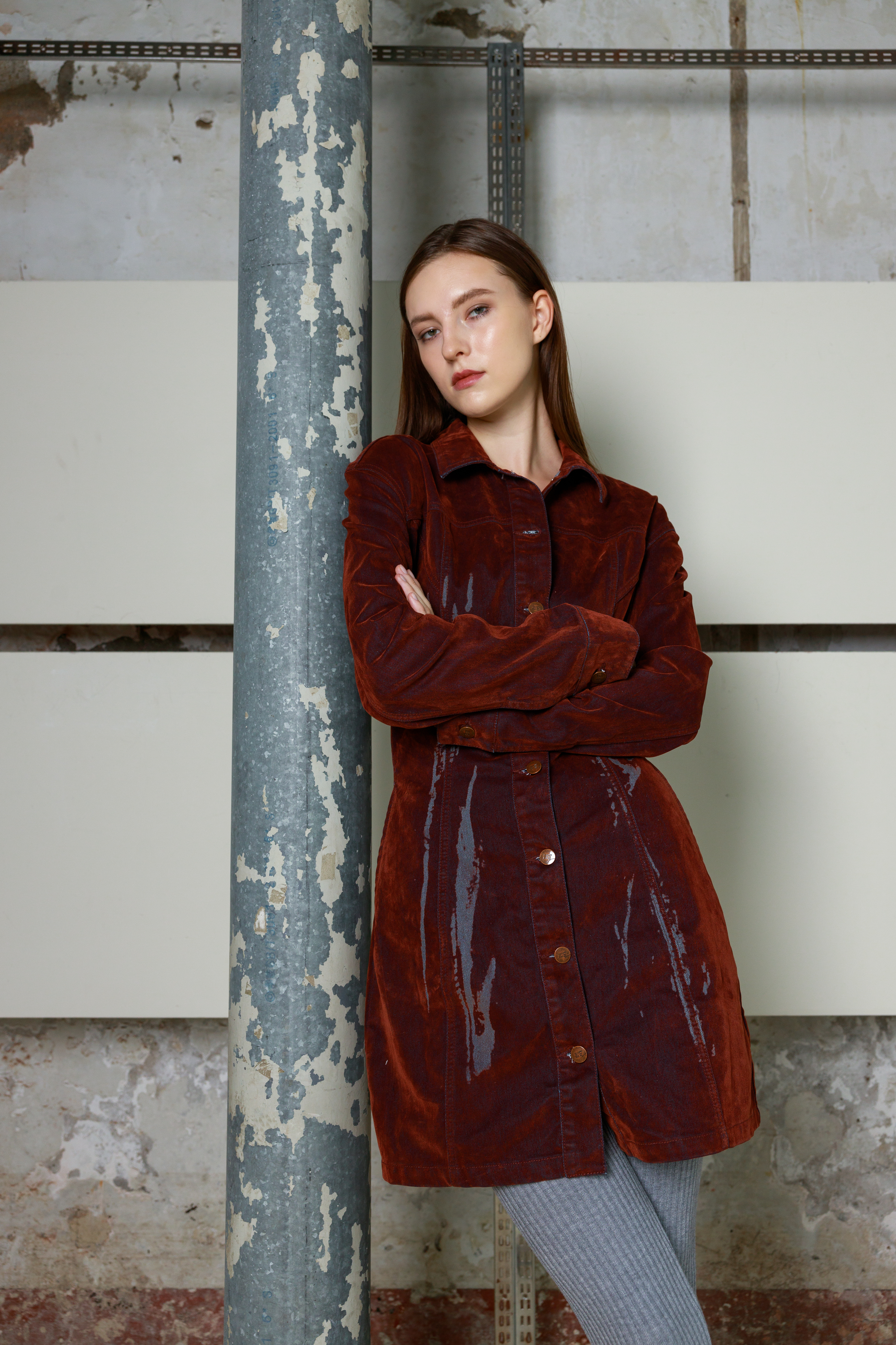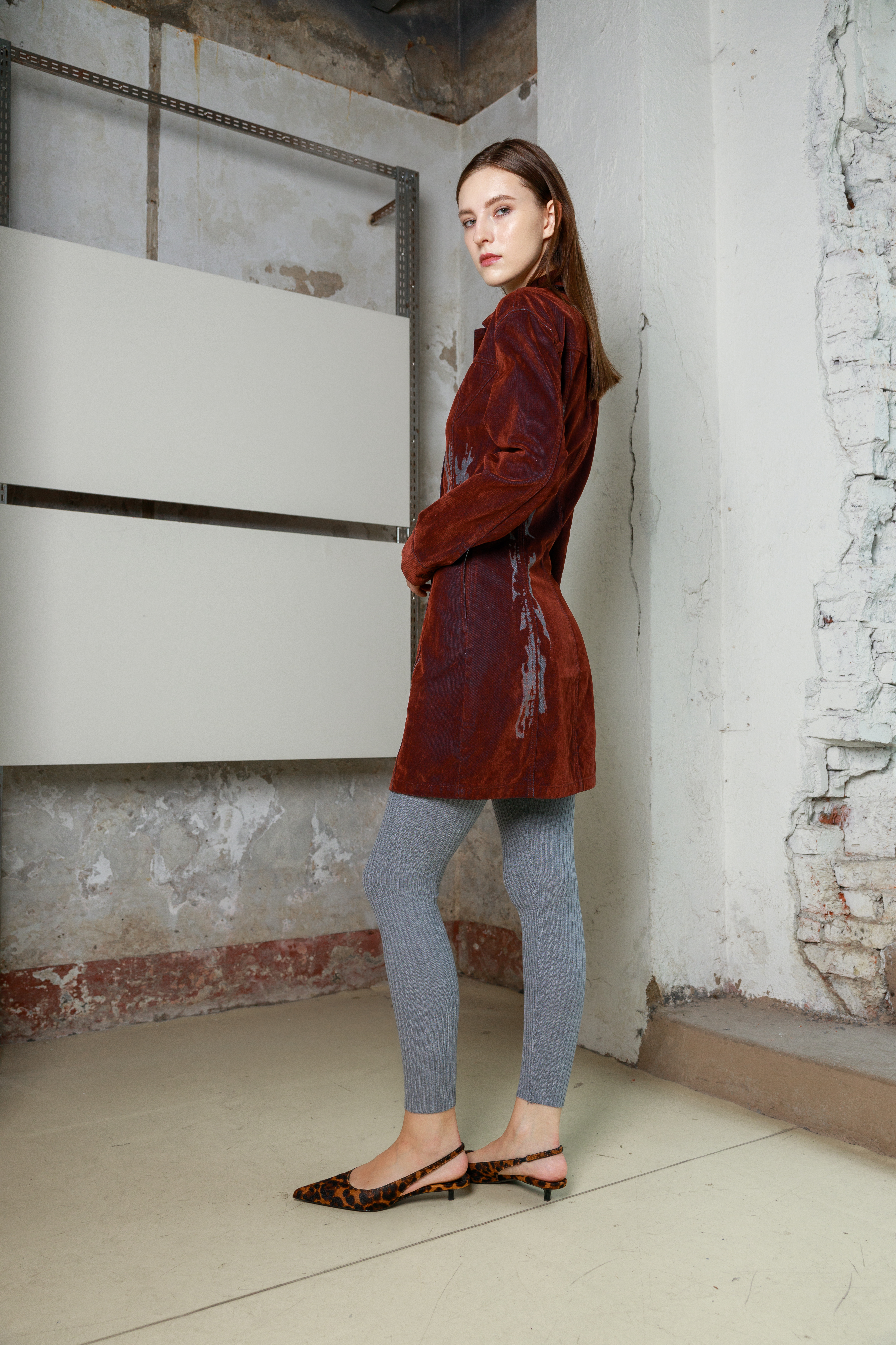 Приталенное мини-платье из велюра с длинными рукавами и дизайнерским принтом. Платье выполнено в глубоком оттенке, который меняет тон в зависимости от освещения - от насыщенного от коричневого до «красного дерева». Застежка на пуговицы по всей длине позволяет регулировать степень открытости, создавая разные образы - от строгого до более смелого. Удлиненные рукава и лаконичный силуэт подчеркивают изящество формы. Бархатистая ткань придает образу благородную текстуру и ощущение комфорта